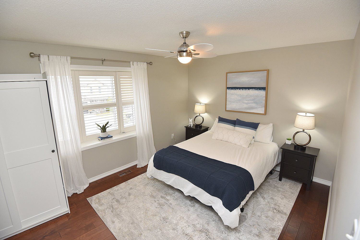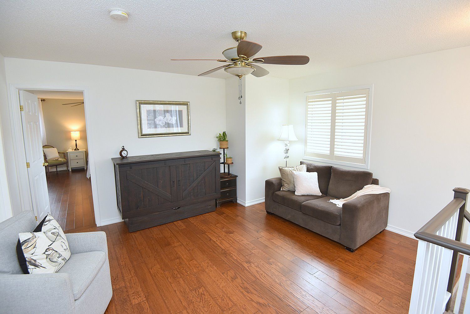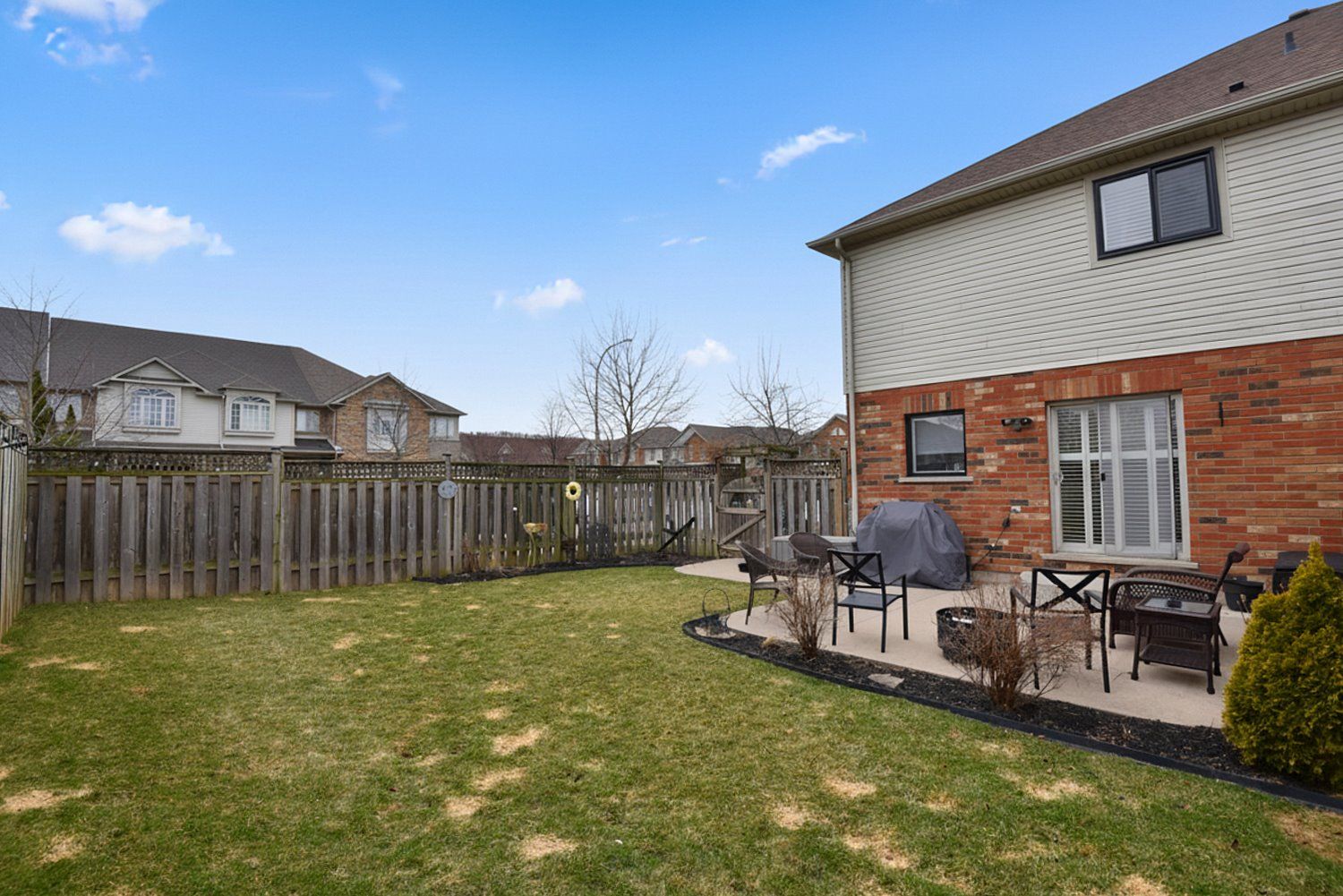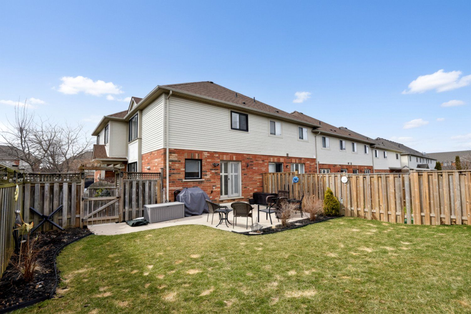 Rare - luxury end unit freehold townhome featuring a double car garage and extensive professional upgrades inside & out. Ideally situated on a private, fully fenced lot just steps from parks, schools and shopping. The end-unit design provides an abundance of large windows filling the home with natural light. Double-car garage plus large driveway allows parking for 6. The bright, white kitchen features corian countertops & ss appliances. The open-concept living/dining room have hardwood flooring and a walkout to a newer patio & walkways(2018). The upper level incudes a loft with escarpment views, a spacious primary suite with large walk-in closet and new wall to wall built-in closet(2025), a large 2nd bedroom, a large main bath and convenient upper level laundry. Additional quality updates include newer hardwood flooring in bedroom areas(2024), new carrier heat pump & air conditioning(2023), roof shingles(2016), dishwasher(2023), and stunning black nordick windows(2023), fresh painted throughout, new 2025 wall to wall pantry, and california look shutters on most windows. This beautifully maintained home is ideal for first-time buyers or those looking to downsize.