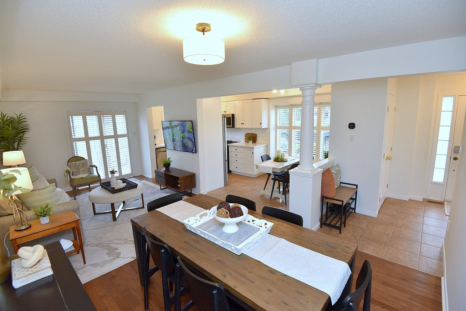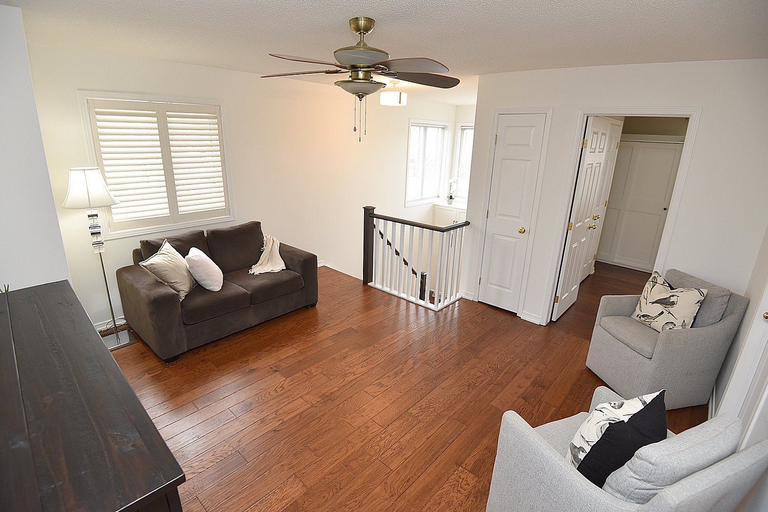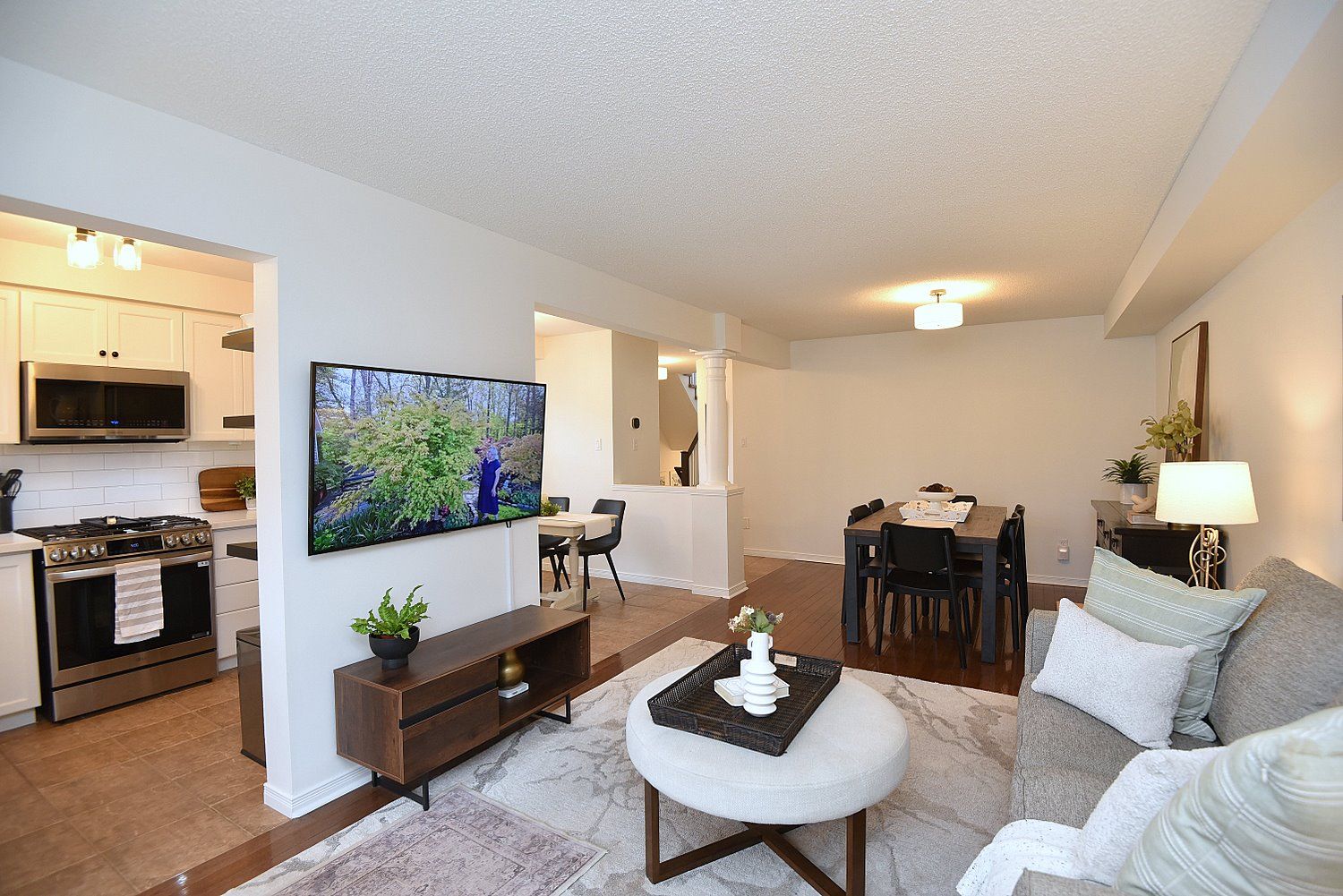 Rare - luxury end unit freehold townhome featuring a double car garage and extensive professional upgrades inside & out. Ideally situated on a private, fully fenced lot just steps from parks, schools and shopping. The end-unit design provides an abundance of large windows filling the home with natural light. Double-car garage plus large driveway allows parking for 6. The bright, white kitchen features corian countertops & ss appliances. The open-concept living/dining room have hardwood flooring and a walkout to a newer patio & walkways(2018). The upper level incudes a loft with escarpment views, a spacious primary suite with large walk-in closet and new wall to wall built-in closet(2025), a large 2nd bedroom, a large main bath and convenient upper level laundry. Additional quality updates include newer hardwood flooring in bedroom areas(2024), new carrier heat pump & air conditioning(2023), roof shingles(2016), dishwasher(2023), and stunning black nordick windows(2023), fresh painted throughout, new 2025 wall to wall pantry, and california look shutters on most windows. This beautifully maintained home is ideal for first-time buyers or those looking to downsize.