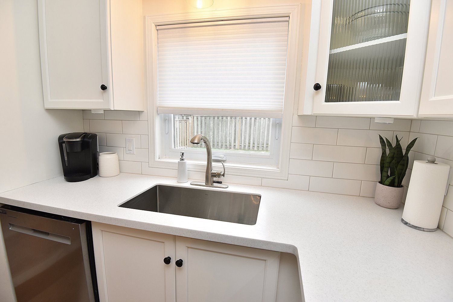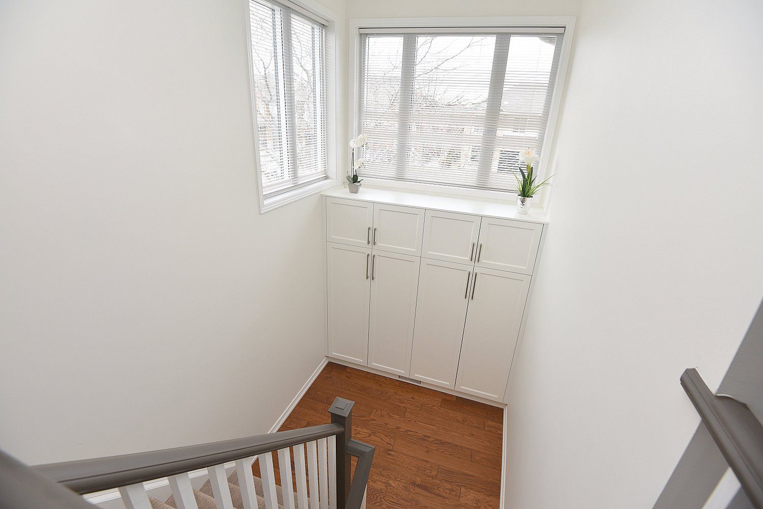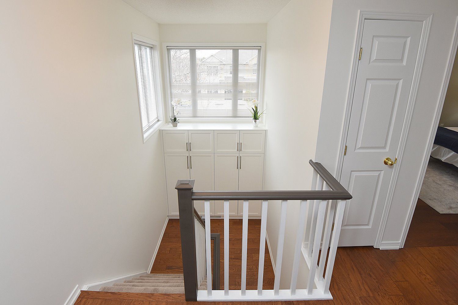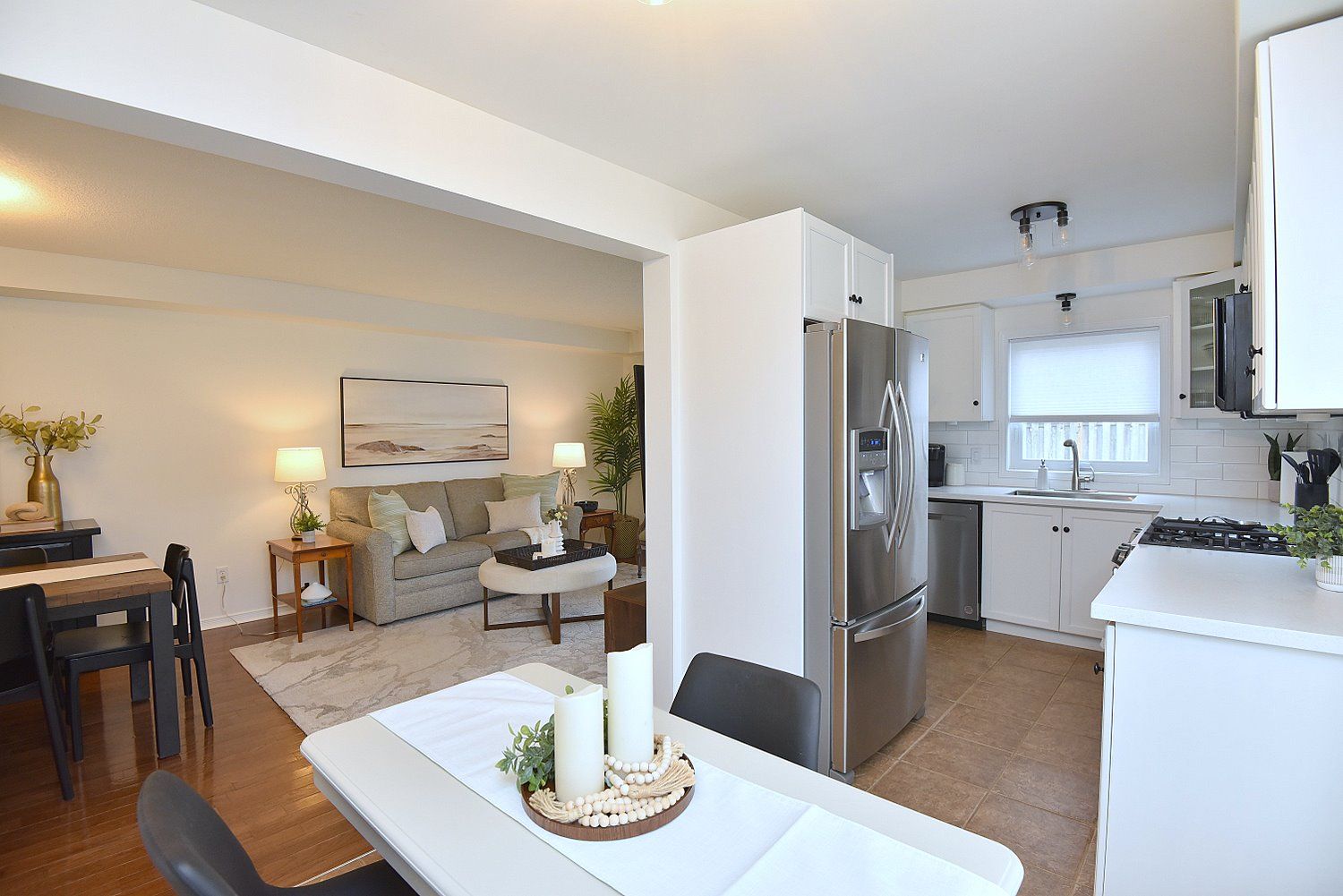 Rare - luxury end unit freehold townhome featuring a double car garage and extensive professional upgrades inside & out. Ideally situated on a private, fully fenced lot just steps from parks, schools and shopping. The end-unit design provides an abundance of large windows filling the home with natural light. Double-car garage plus large driveway allows parking for 6. The bright, white kitchen features corian countertops & ss appliances. The open-concept living/dining room have hardwood flooring and a walkout to a newer patio & walkways(2018). The upper level incudes a loft with escarpment views, a spacious primary suite with large walk-in closet and new wall to wall built-in closet(2025), a large 2nd bedroom, a large main bath and convenient upper level laundry. Additional quality updates include newer hardwood flooring in bedroom areas(2024), new carrier heat pump & air conditioning(2023), roof shingles(2016), dishwasher(2023), and stunning black nordick windows(2023), fresh painted throughout, new 2025 wall to wall pantry, and california look shutters on most windows. This beautifully maintained home is ideal for first-time buyers or those looking to downsize.