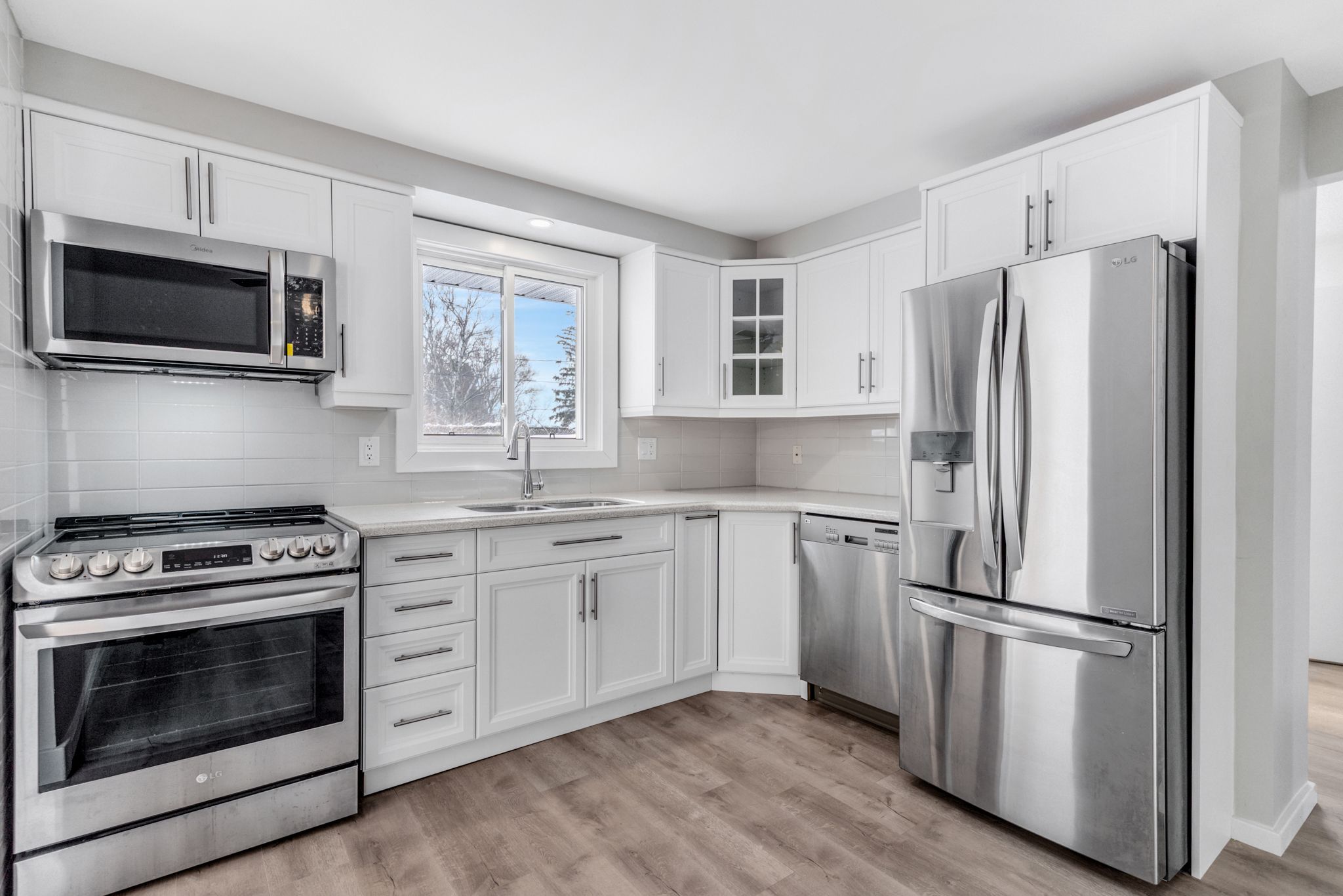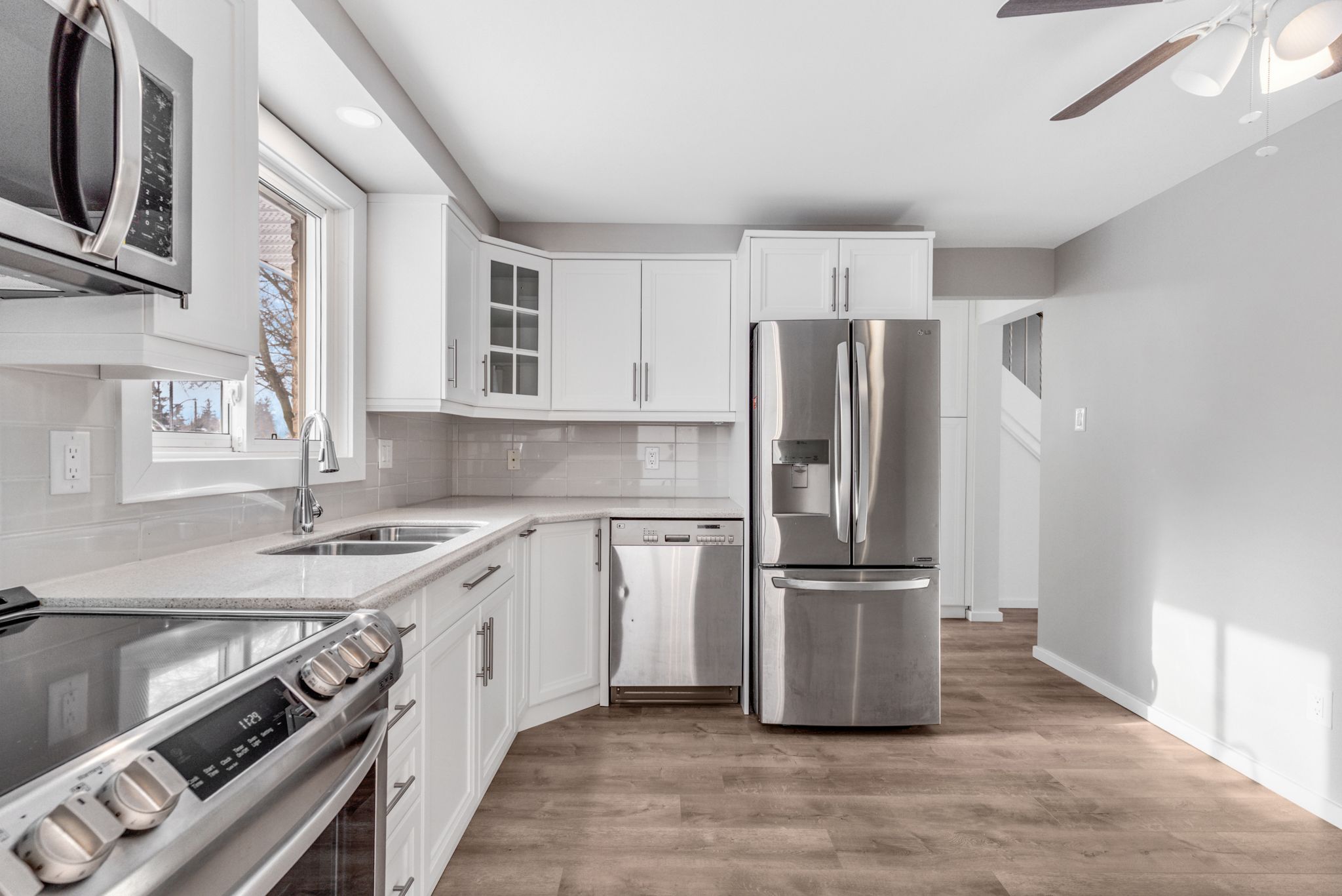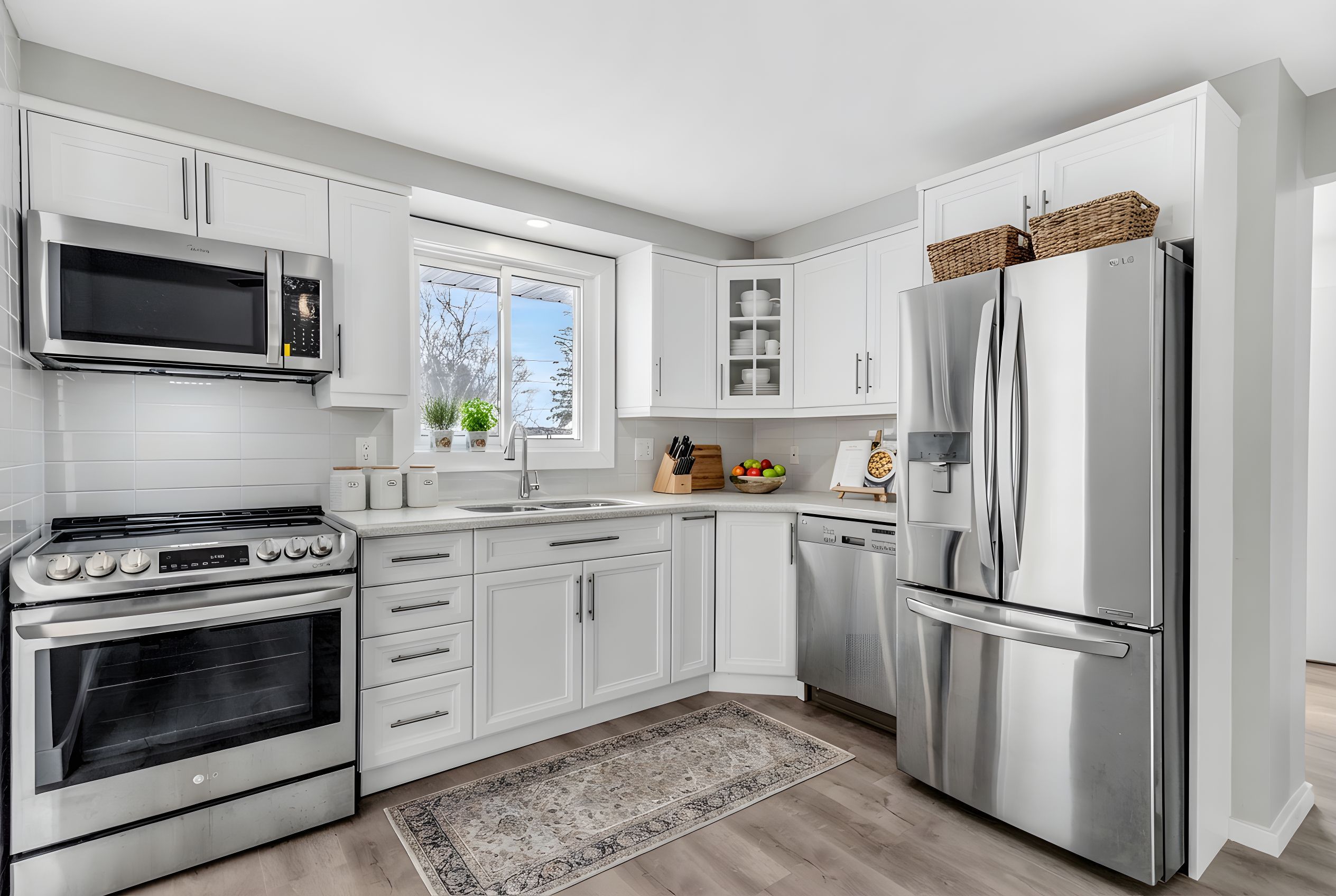 • Modern kitchen with stainless steel appliances and soft-close cupboards.