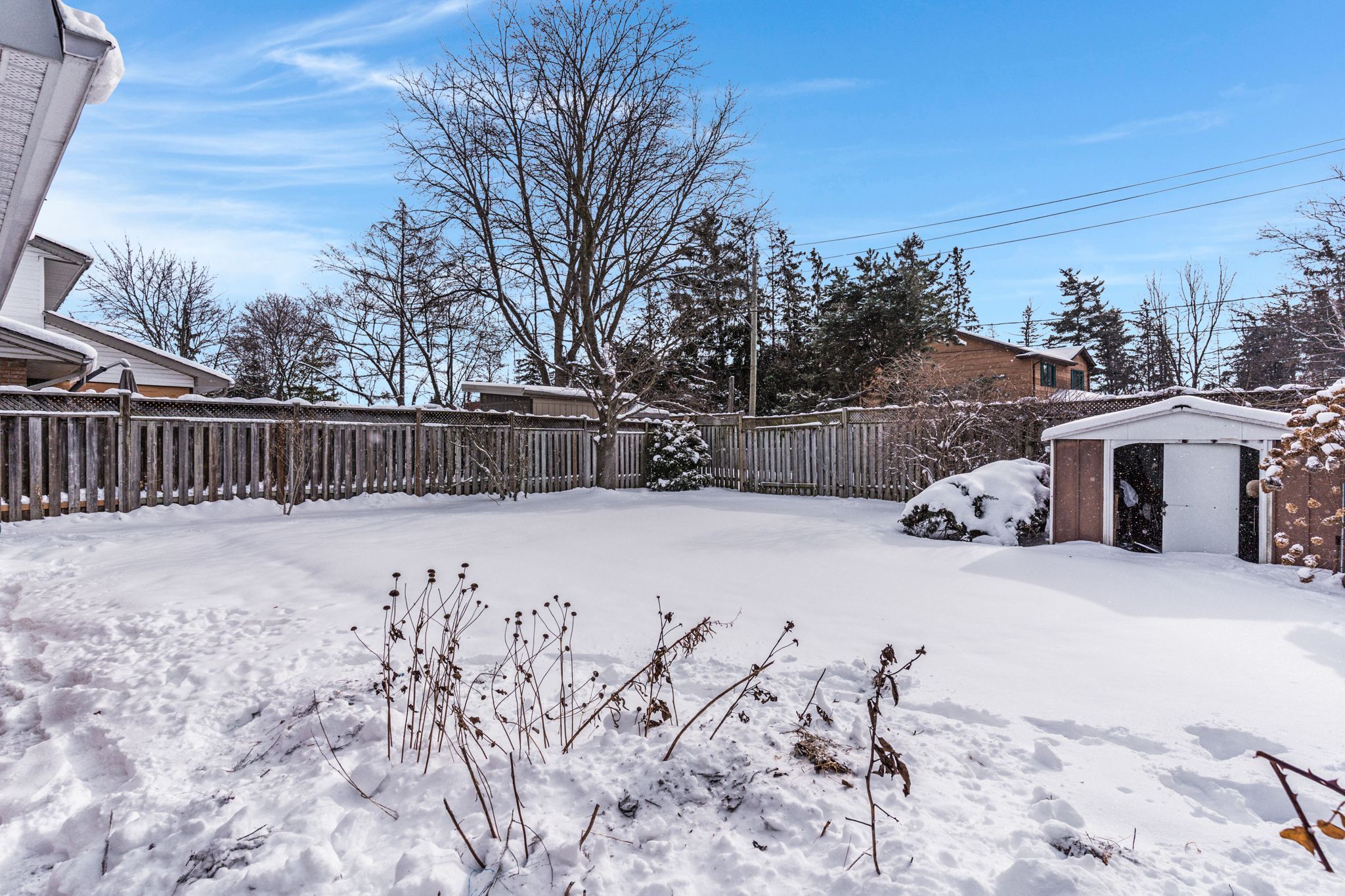 • Fully fenced backyard with access for trailers and equipment, great for outdoor activities.