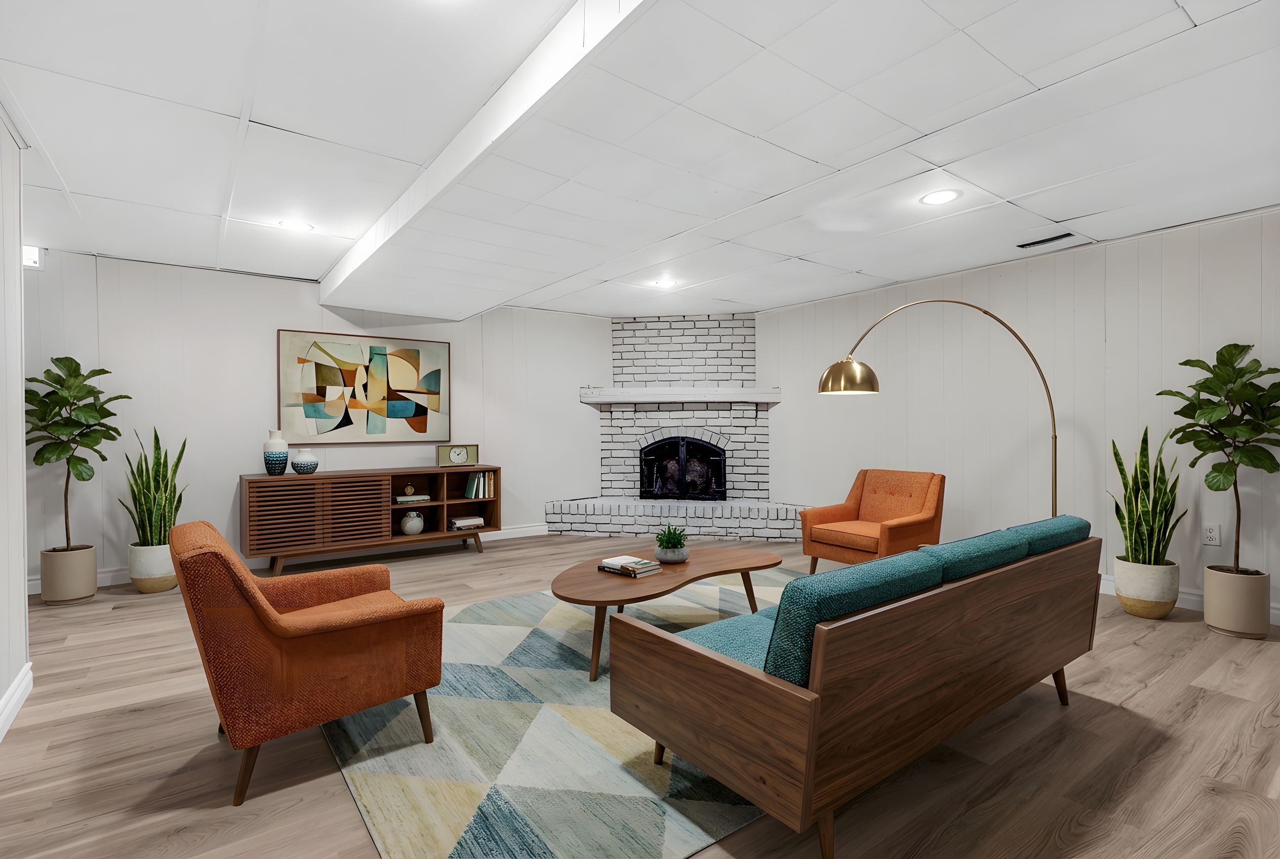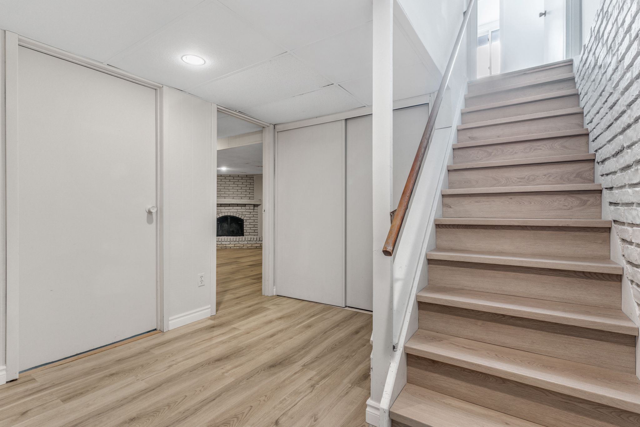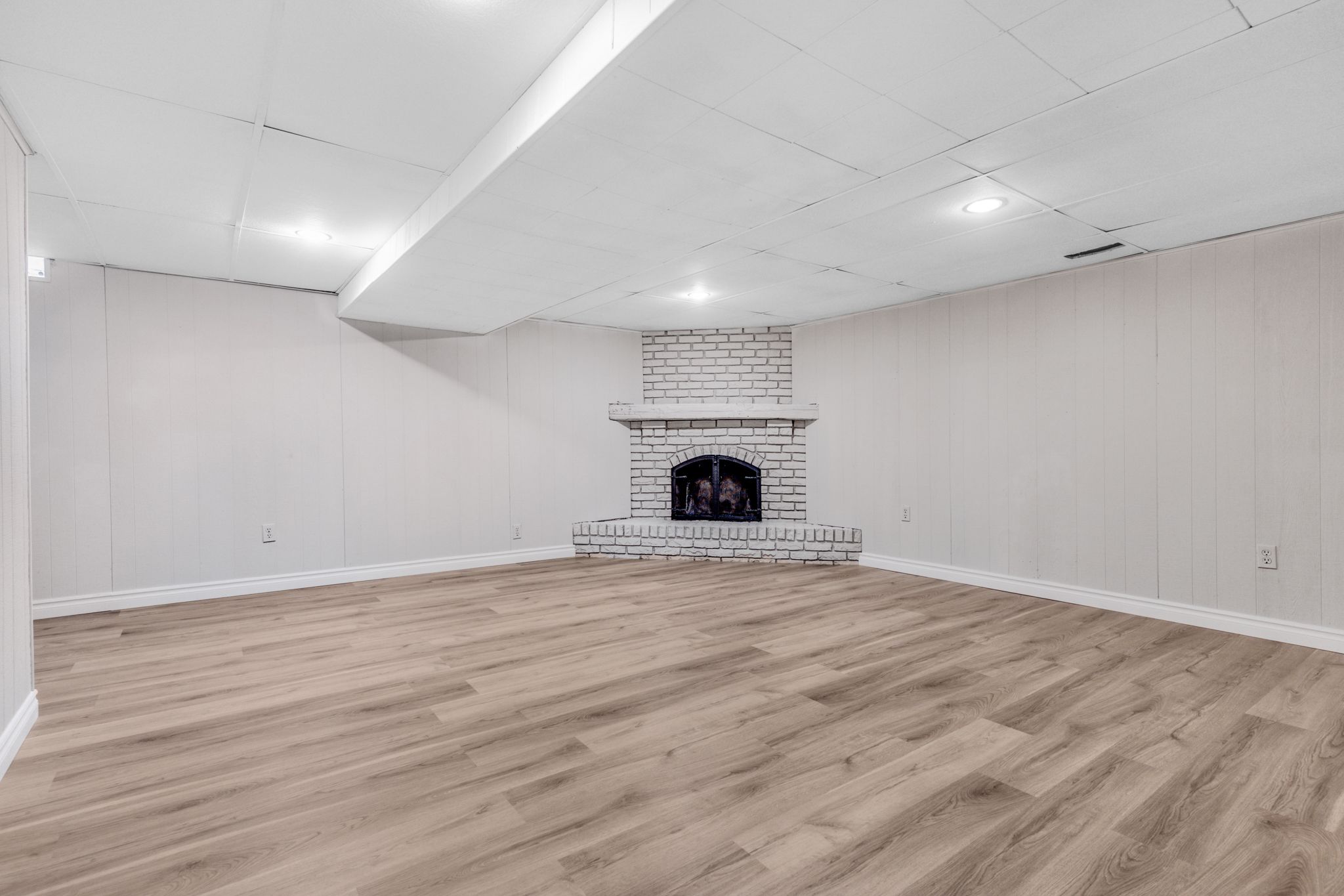 • Finished basement with recreation room and wood-burning fireplace for additional living space.