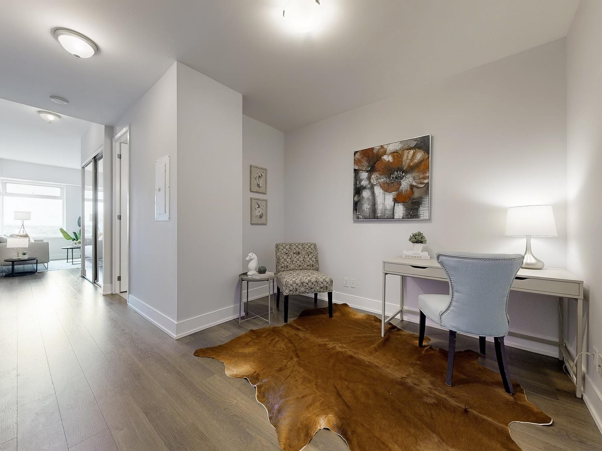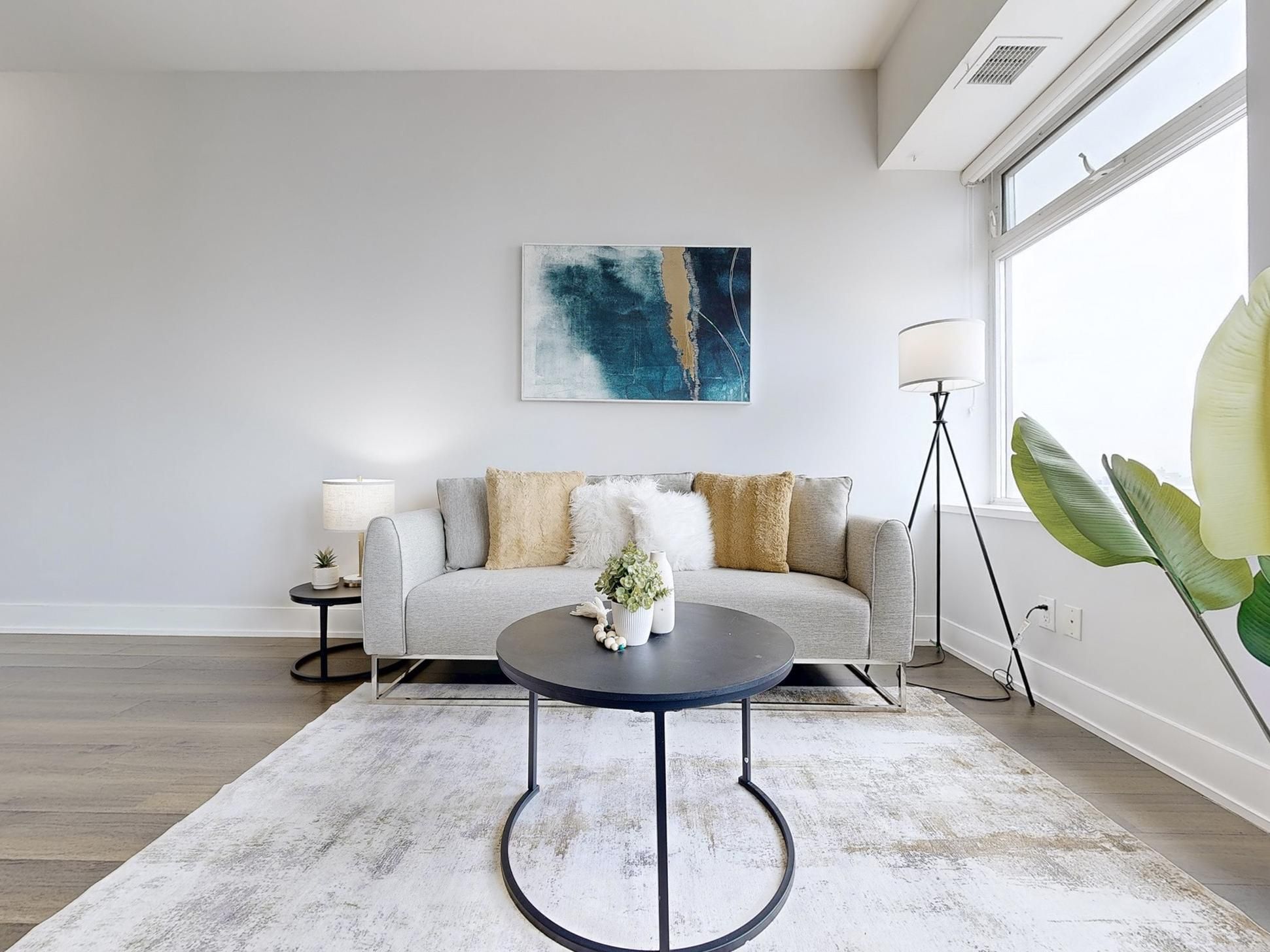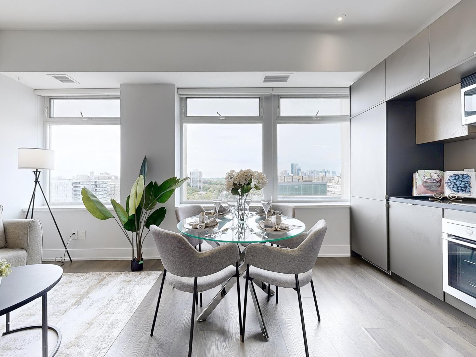 • Bright open-concept layout with high ceilings and city views.
