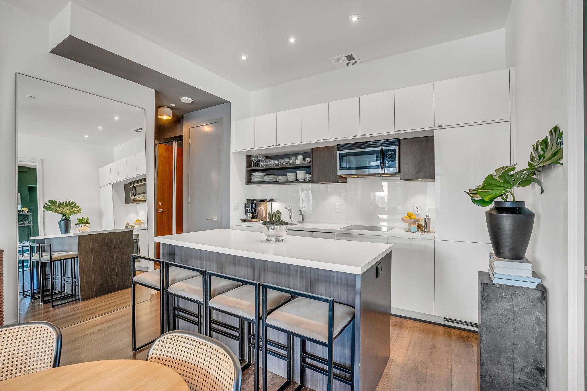 • Custom kitchen features induction cooktop, wine fridge, and stylish island.