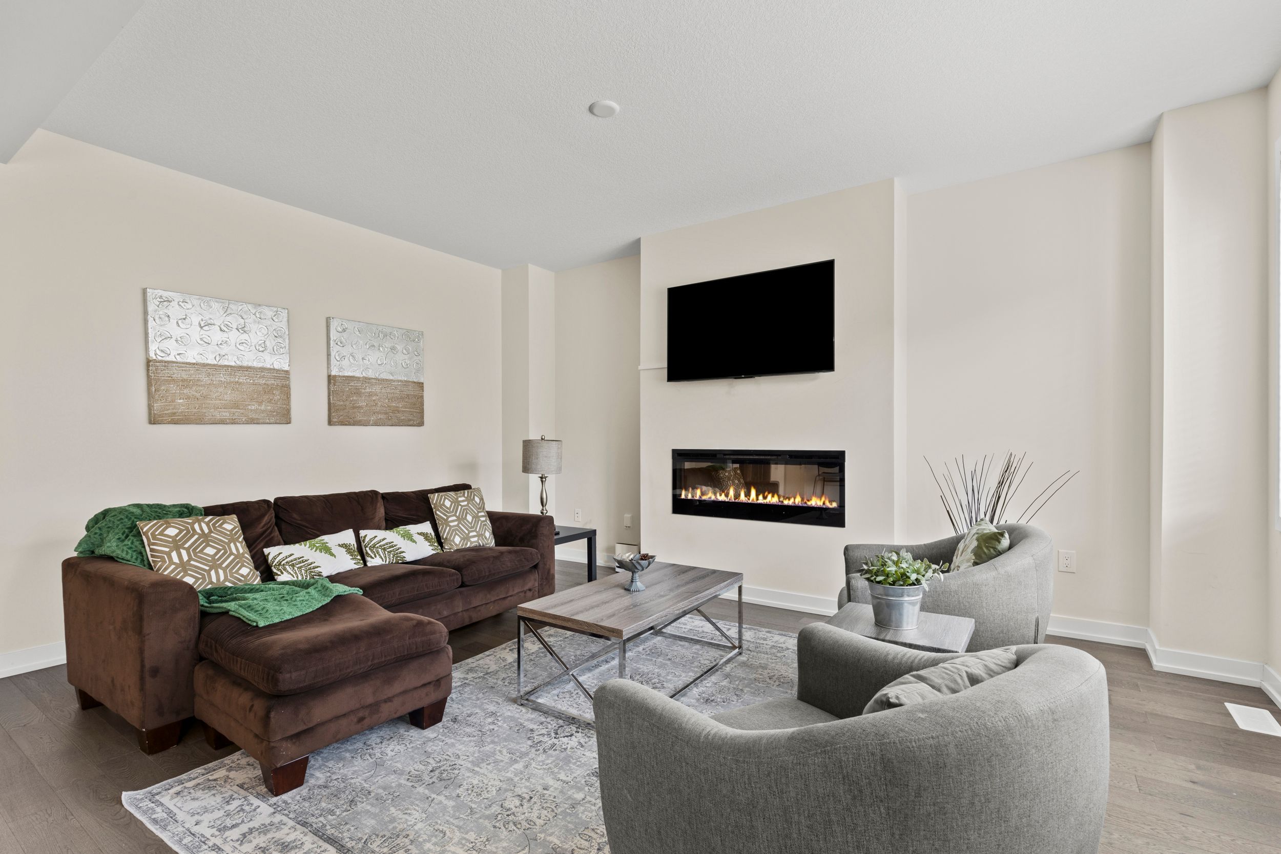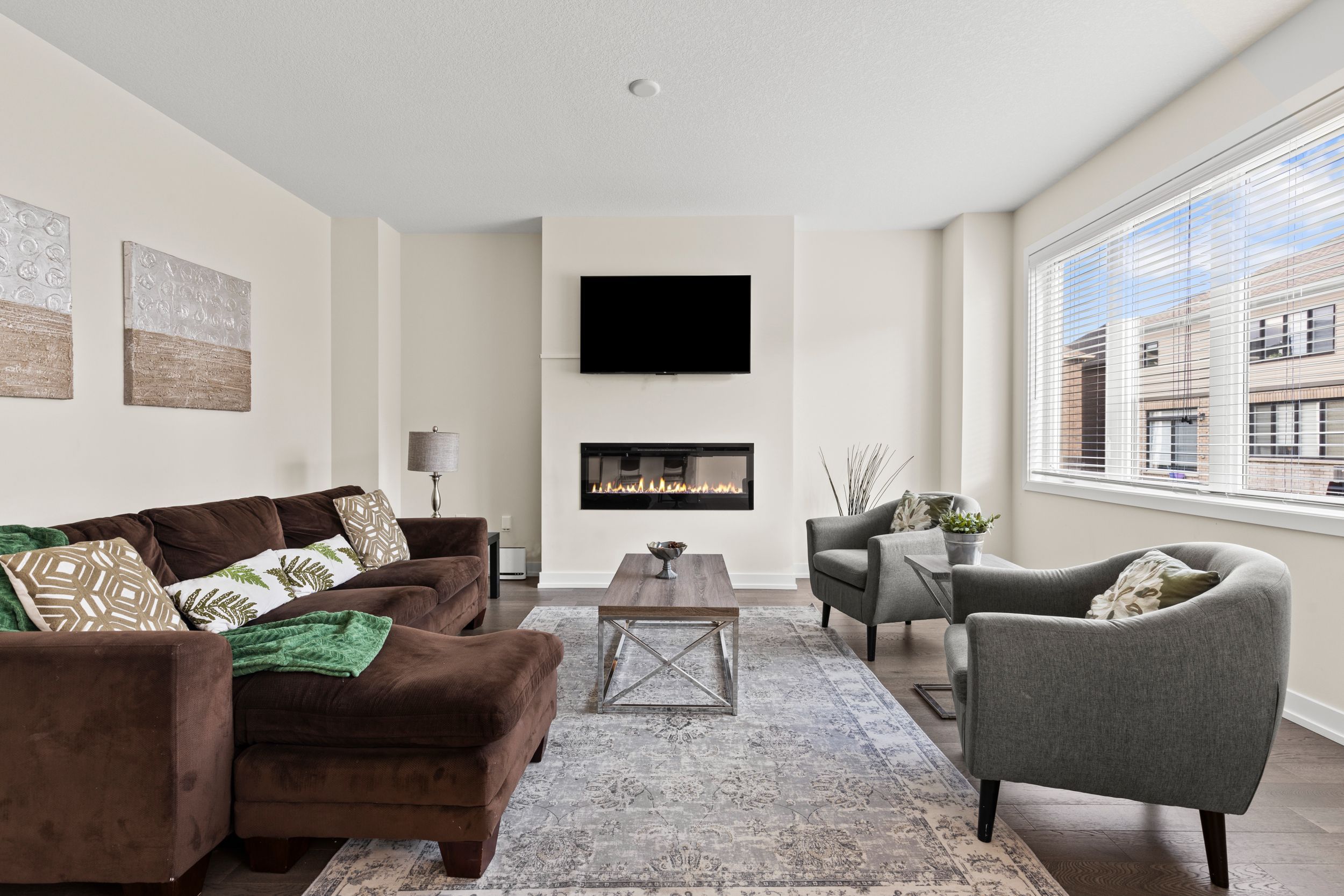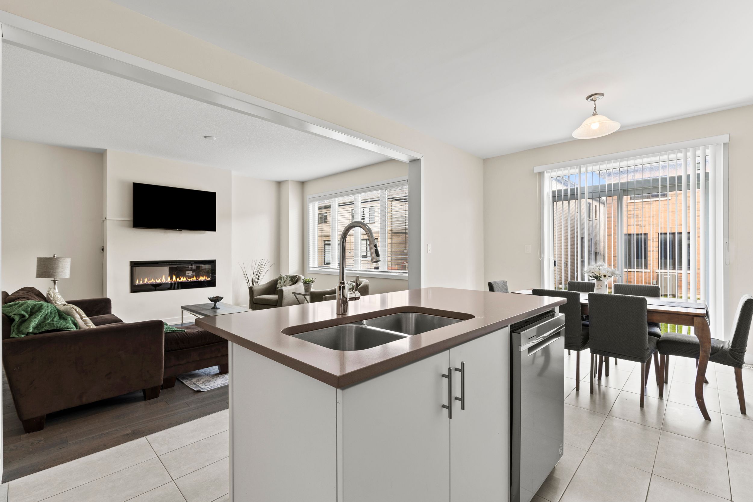 • Bright open-concept main floor featuring an upgraded kitchen and electric fireplace.