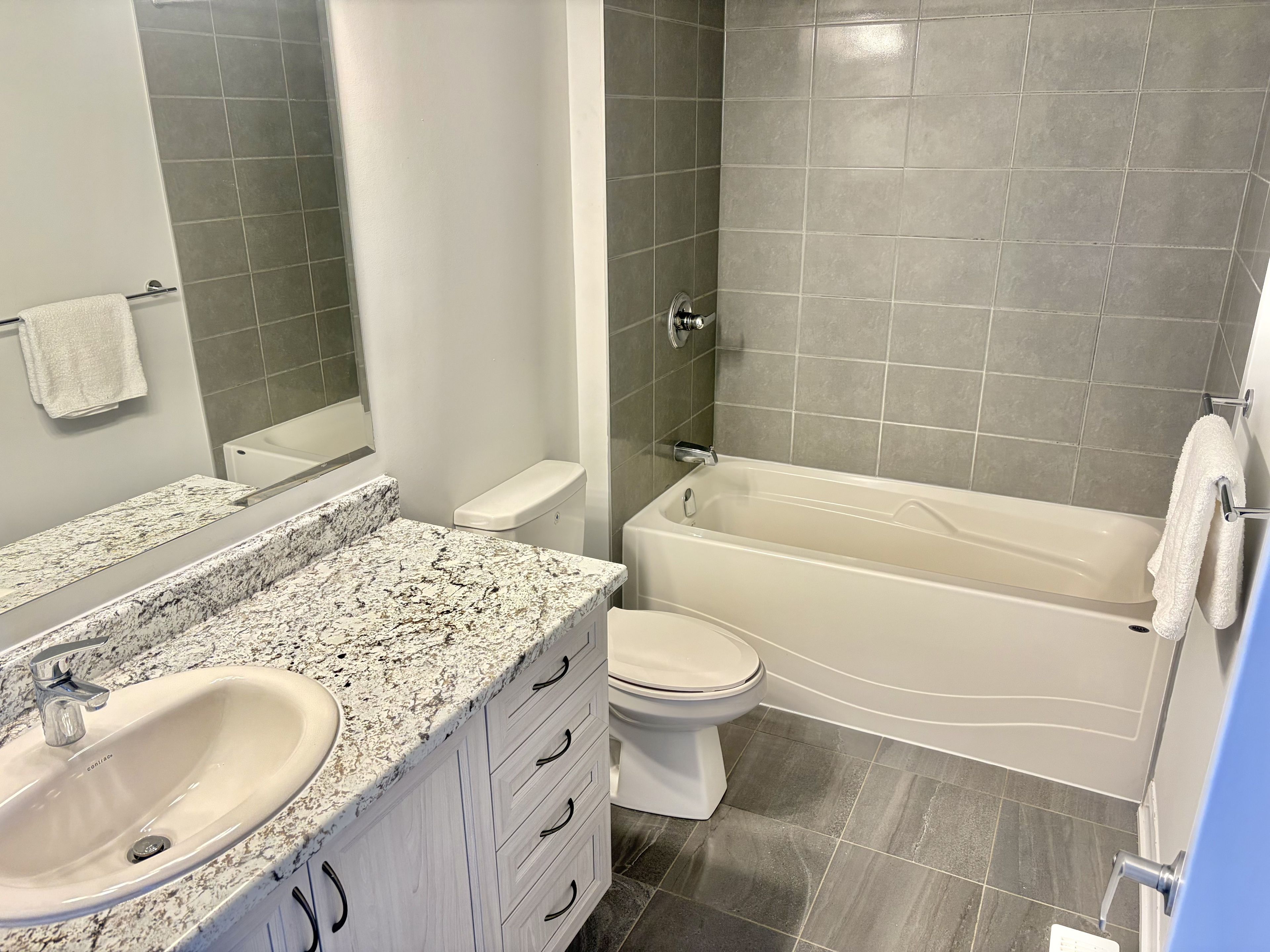 • Modern kitchen with granite countertops and stainless steel appliances.