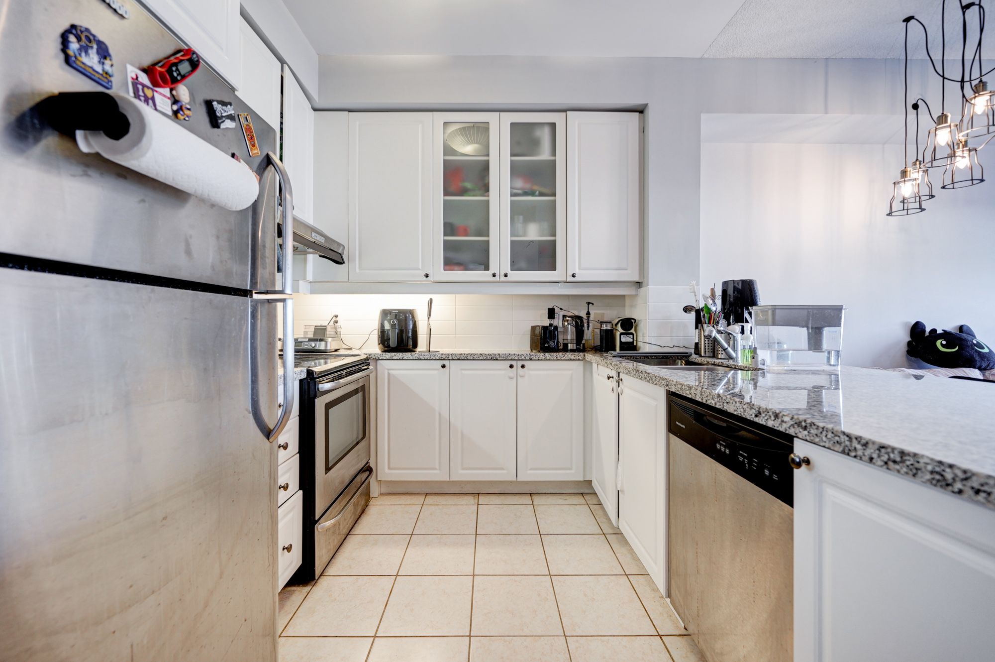 • Modern white kitchen featuring granite countertops and stainless steel appliances.