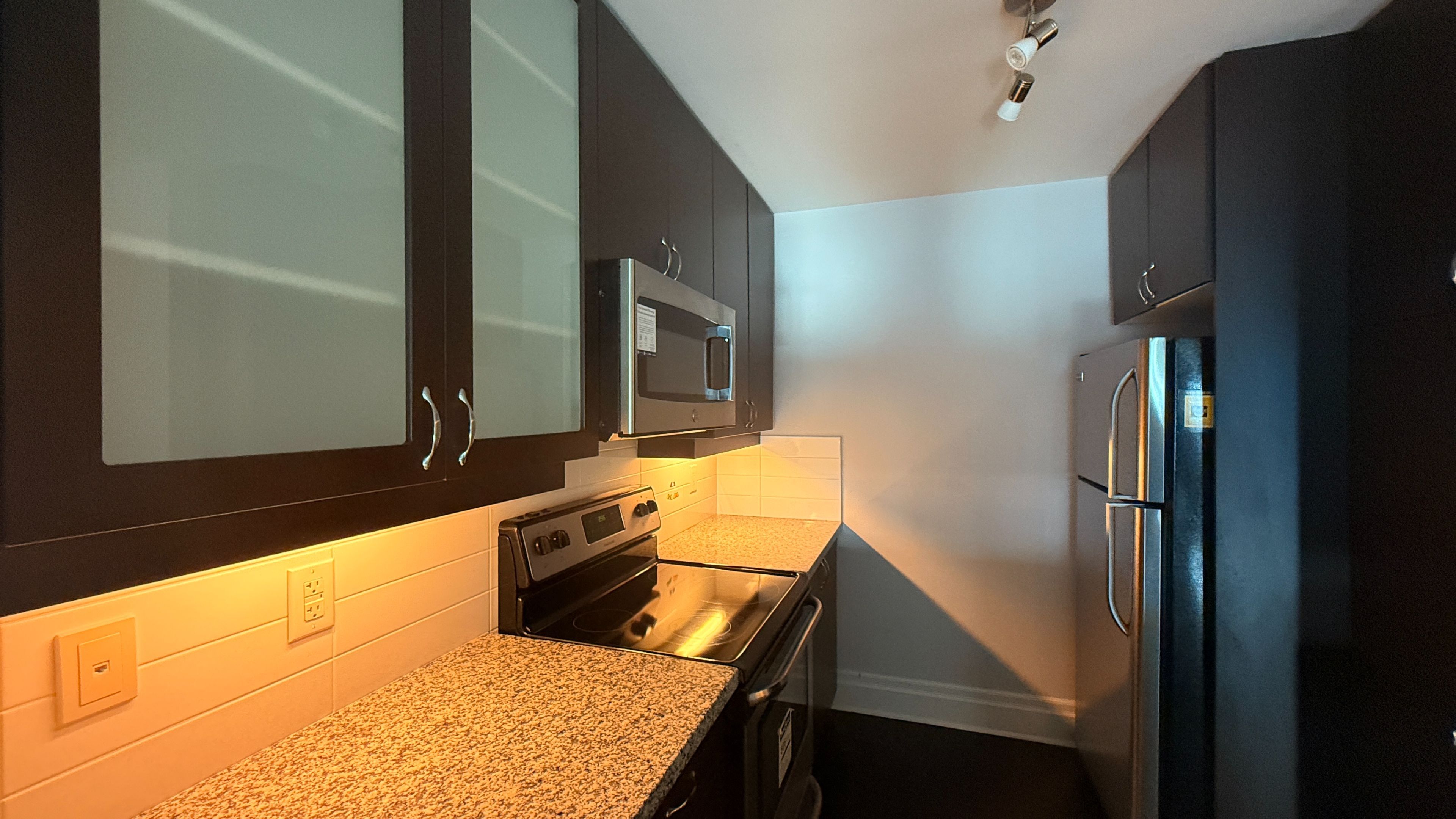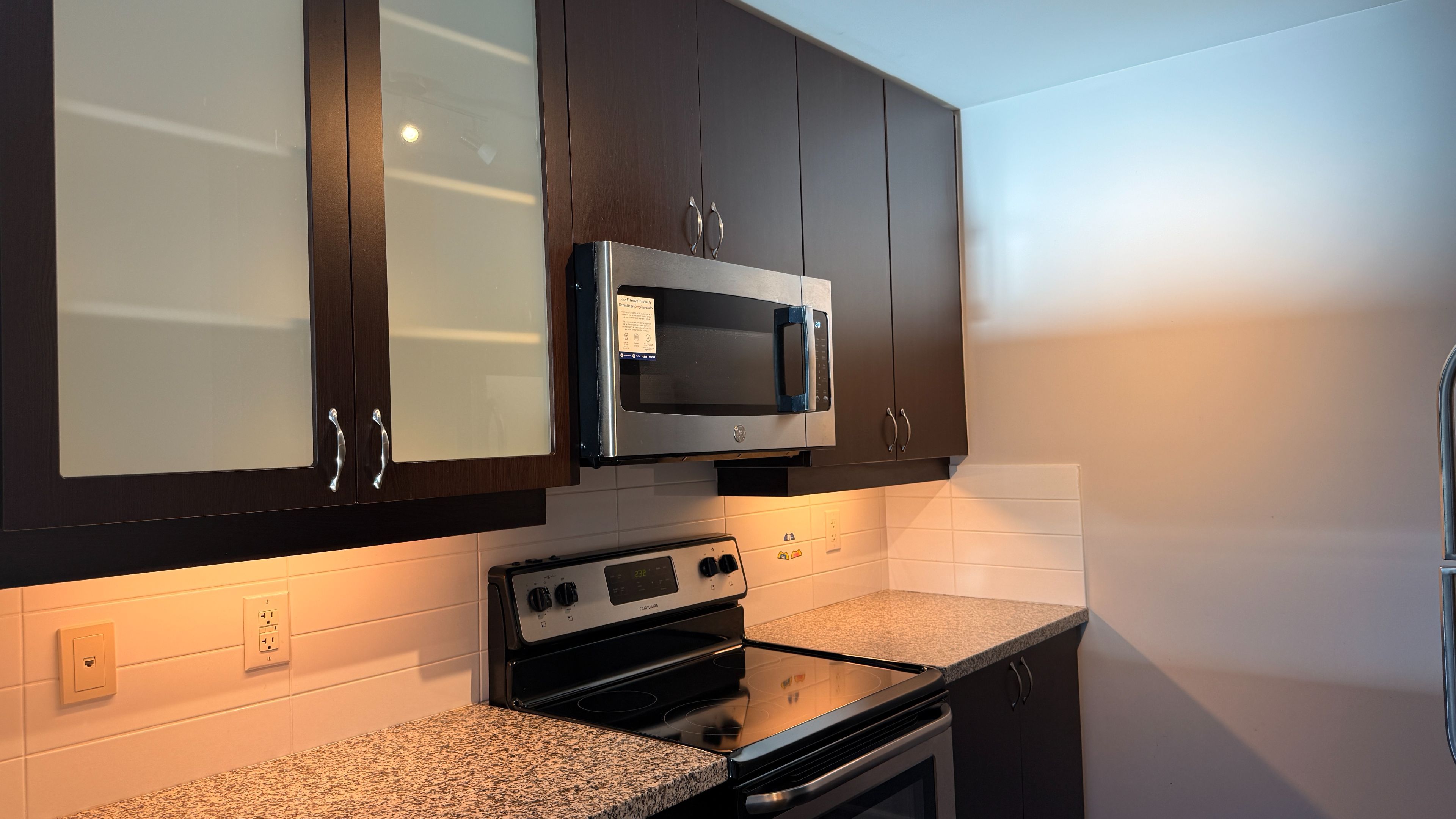 • Modern kitchen features elegant granite countertops.