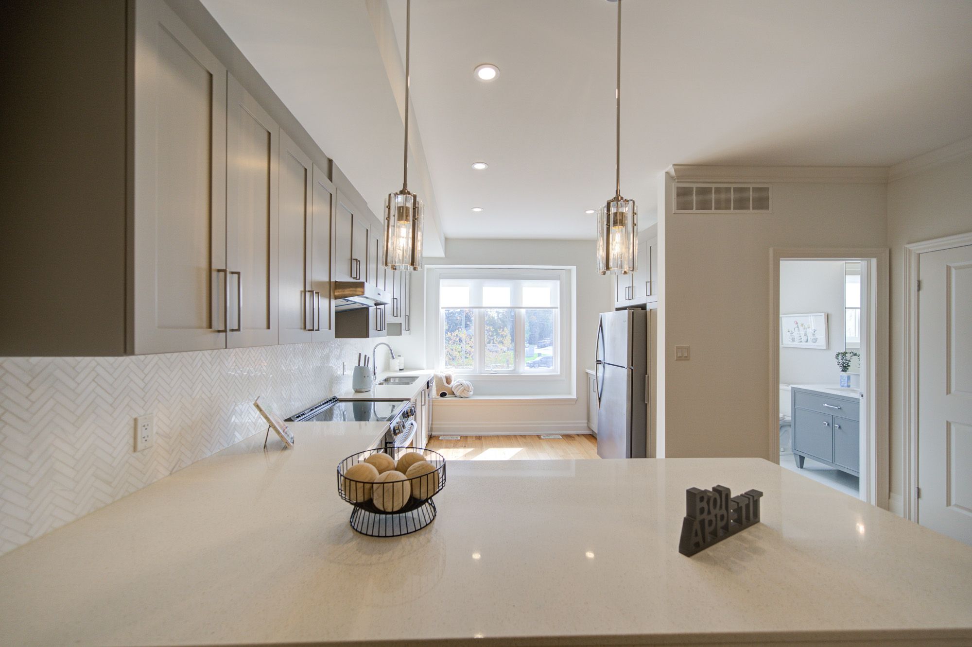 • Modern kitchen featuring new electric stove and range hood.
