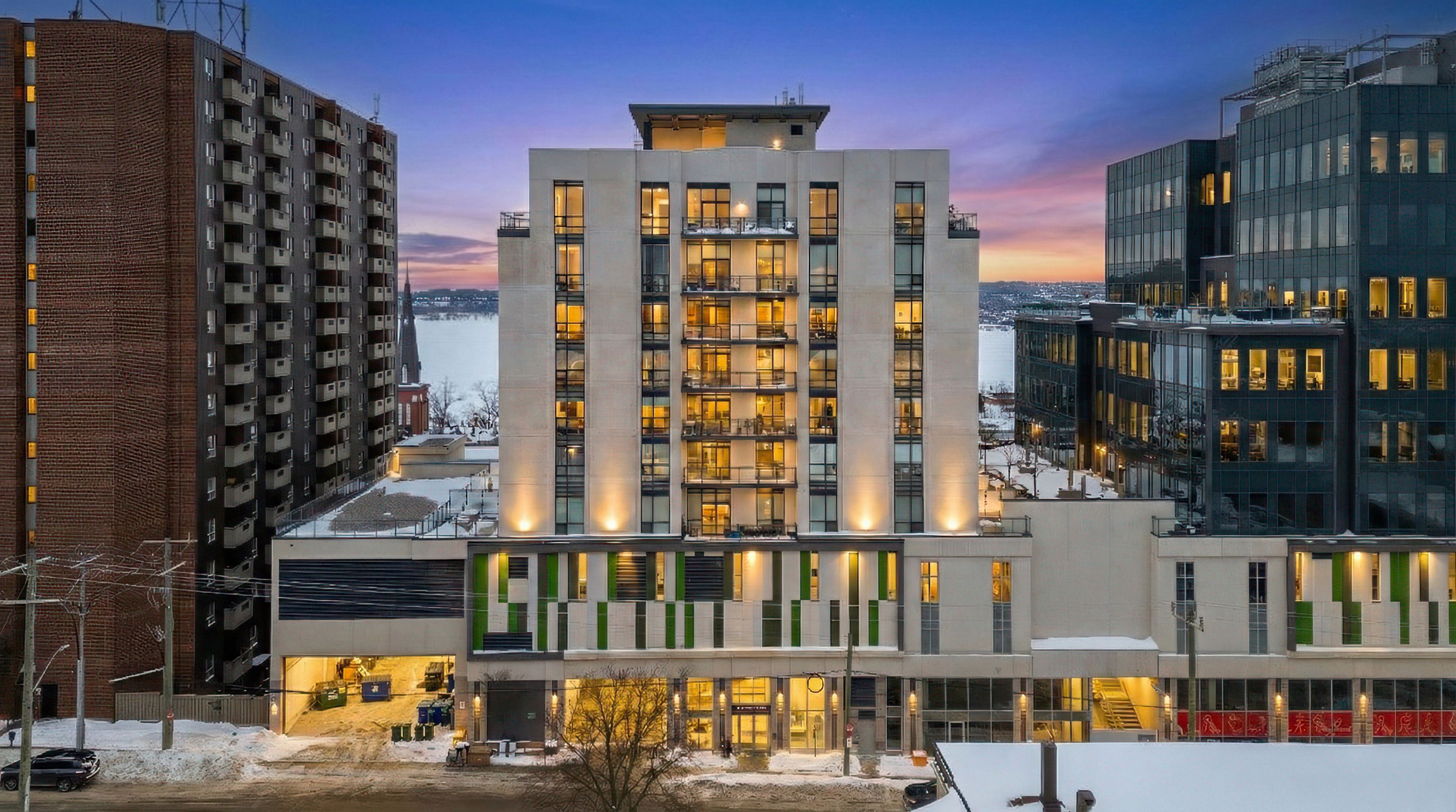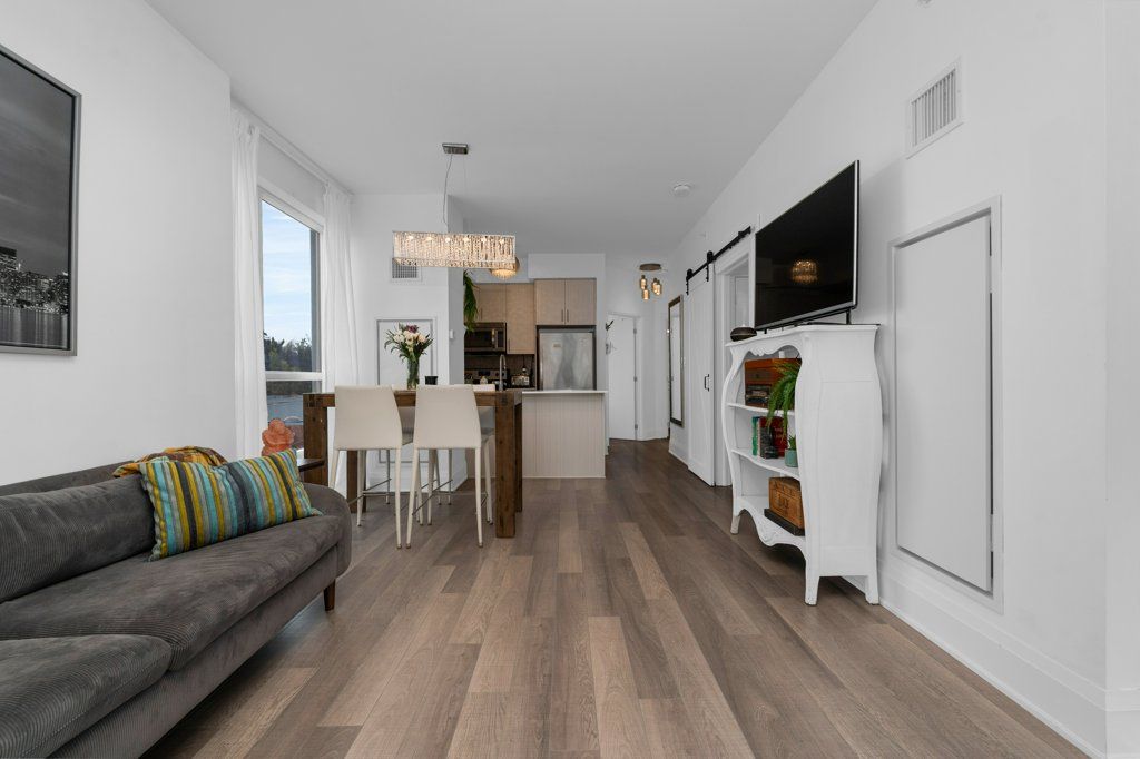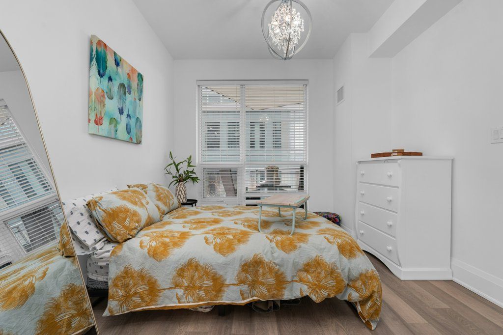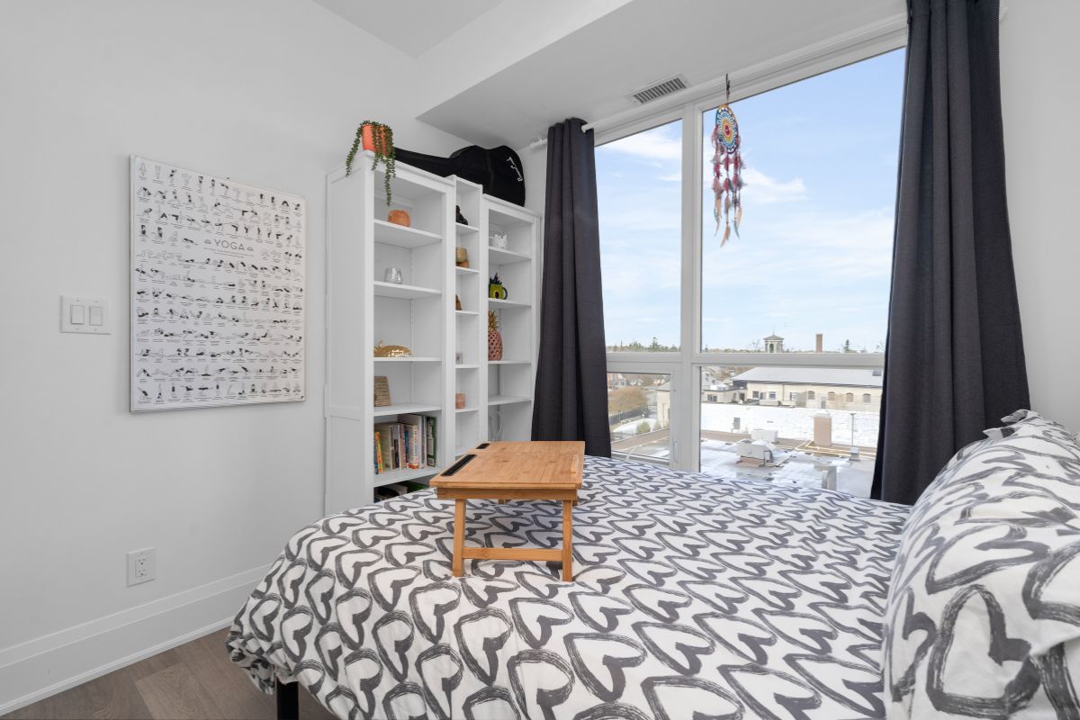 Condo living never looked so good! Tucked privately away this unit boasts tons of natural light from almost every angle with an abundance more windows than most of the buildings models. With over 800 square feet, 9 foot ceilings and original owner this pride of ownership condo bursts with luxury. The second you walk in you will notice the upgraded washer and dryer, laminate flooring and easy flow floor plan. Crisp quartz countertops, tasteful tiled backsplash, open shelving and stainless steel appliances adorn the open concept kitchen with extra deep counter perfect for stools with gossip with friends and an espresso martini. The large living/dining space has floor to ceiling windows and leads to the water facing oversized patio with outdoor decking tiles. Inside the primary bedroom via the barn door there is plenty of room for your furniture, a private 4 piece bathroom with stone countertop and bonus storage above the toilet and massive walk-in closet suitable for any shopaholics needs. Tastefully situated away from the primary bedroom your guest bedroom or office also flush with floor to ceiling windows has a double closet with organizer and is next to a 3-piece bathroom also with stone countertop. With updated lighting throughout and plenty of closet space you won't even need the locker that is included. Building offers tasteful large welcome seating area as well as work out and party room and massive terrace perfect to lounge around with your favourite book for a change of scenery from your own balcony. Ice skate under the stars at city hall, check out the talented artists at the maclaren art centre, grab a puzzle from the local library, head down to the waterfront for a salsa lesson at meridian place, grab some fresh vegetables at the farmers market, walk to the five points theatre, grab a bite to eat, or hit up a roof top patio or night club. Convenience at it's finest. Welcome home!
