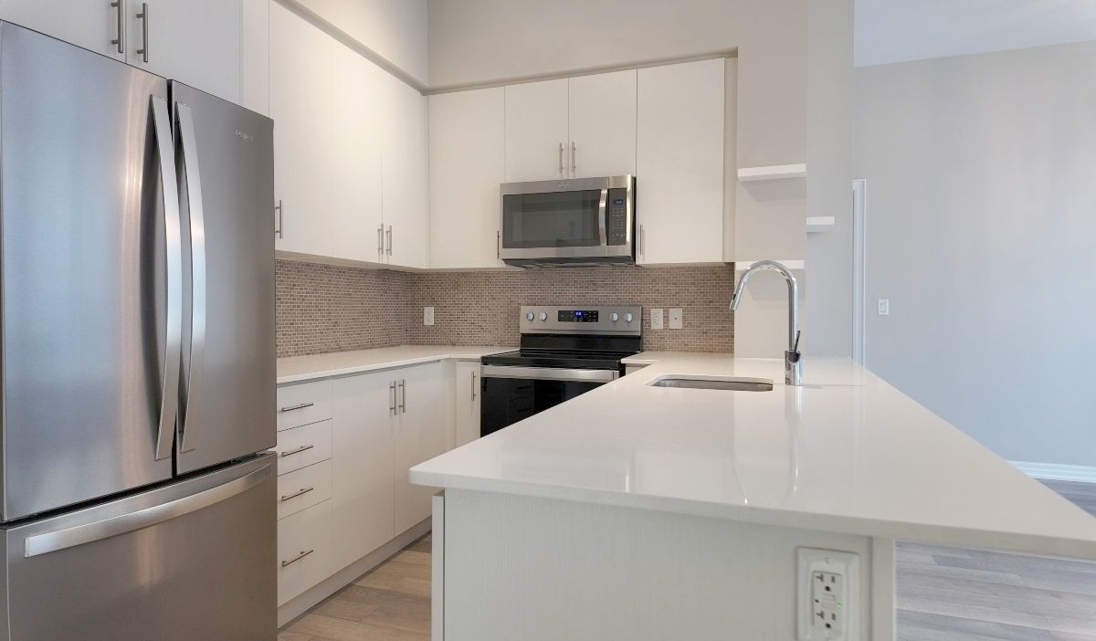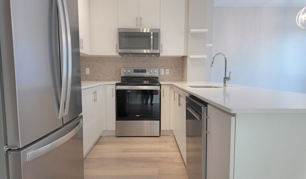 • Modern kitchen equipped with stainless steel appliances and quartz countertops.
