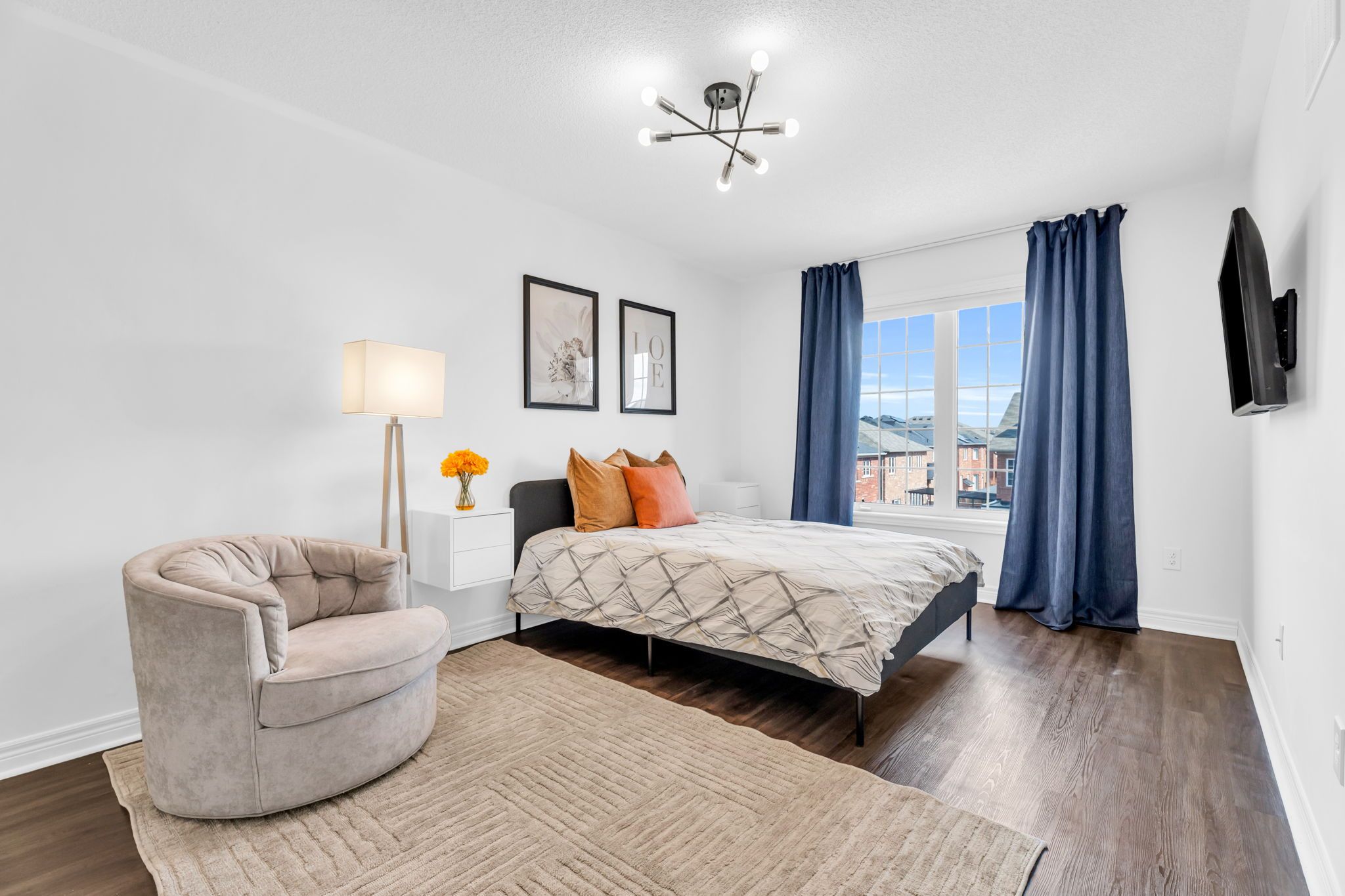• Comfortable living with a custom media wall and electric fireplace.