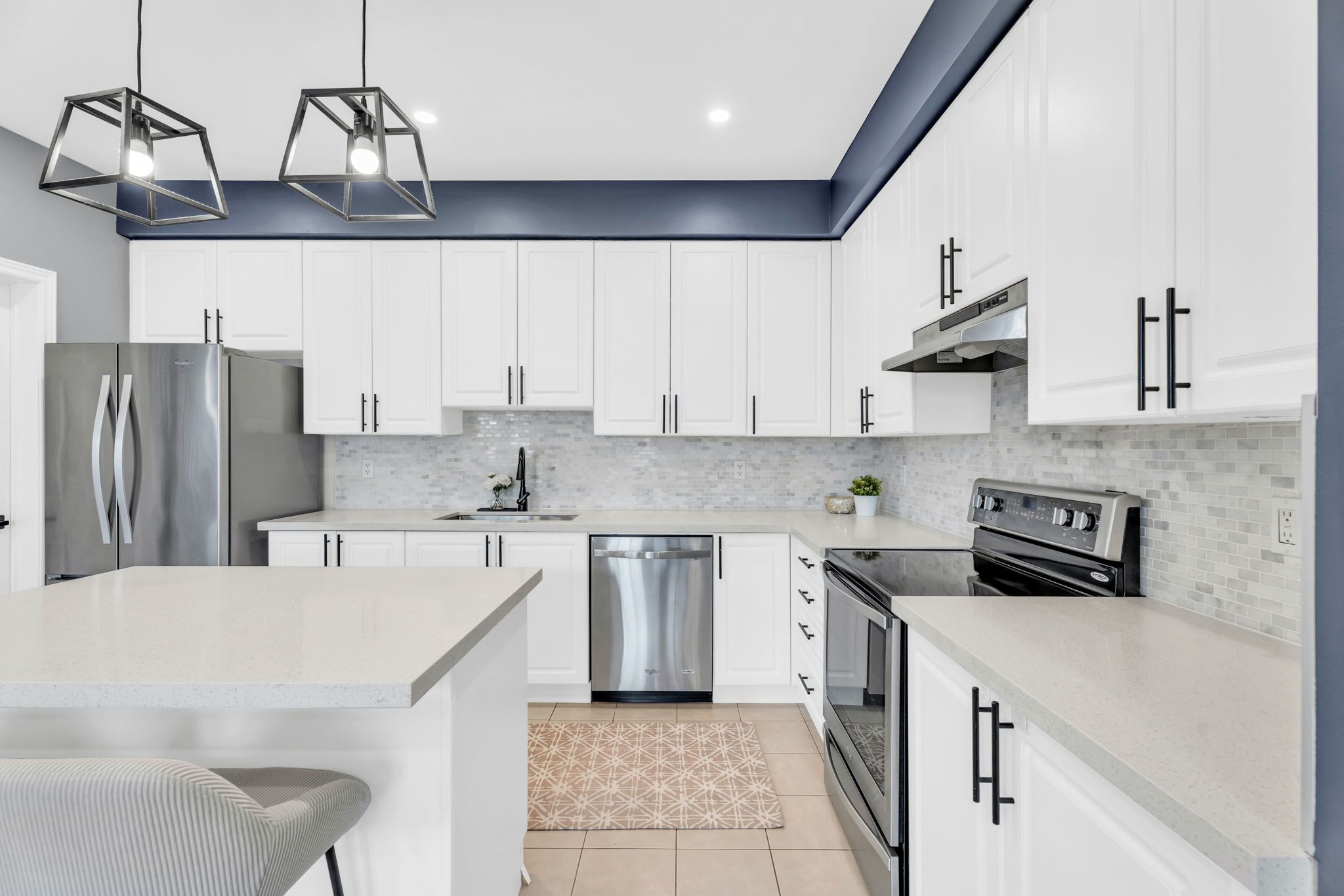 • Modern kitchen with quartz countertops and stylish backsplash.