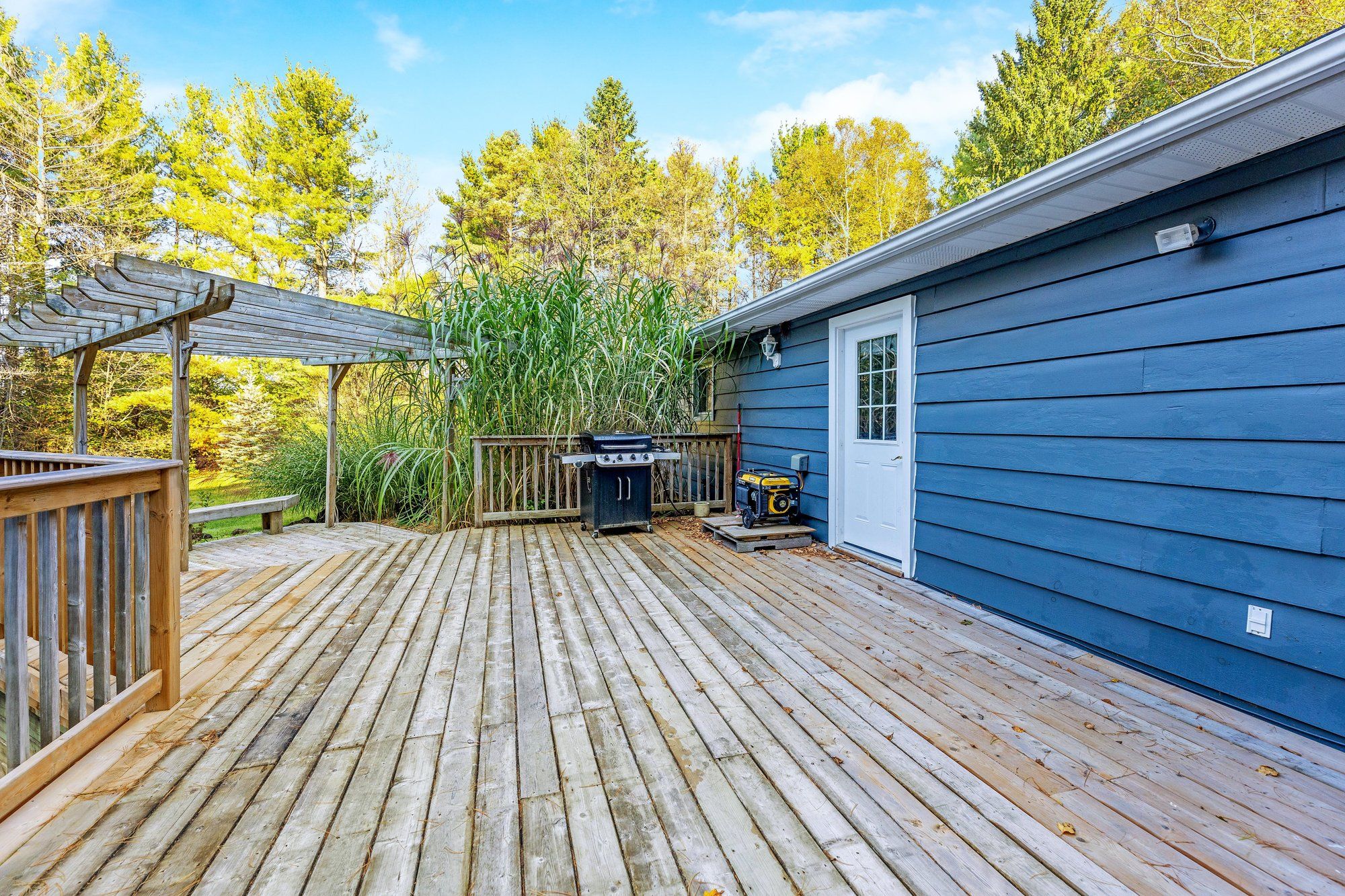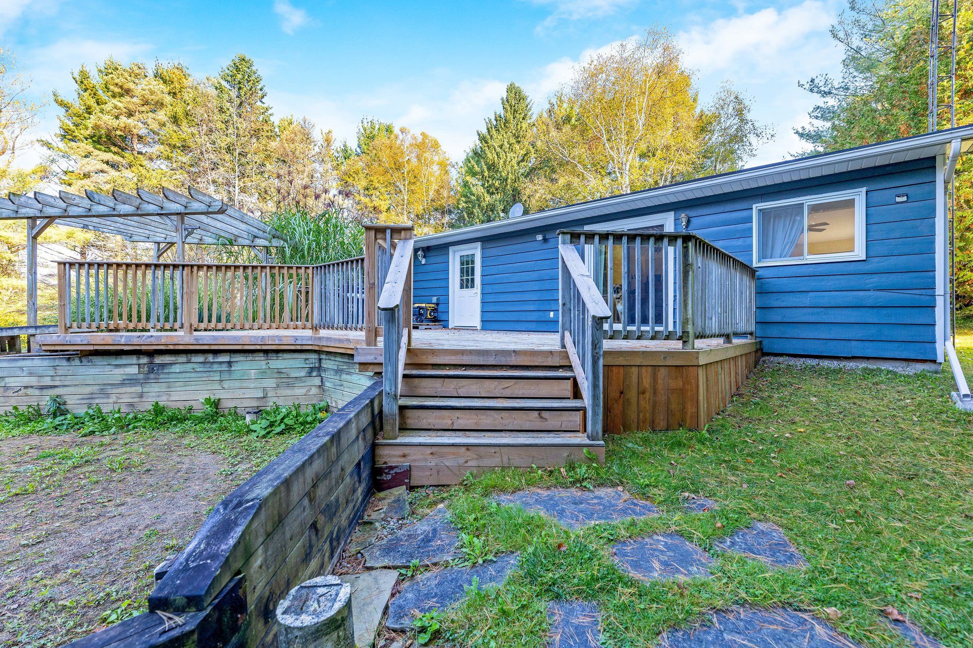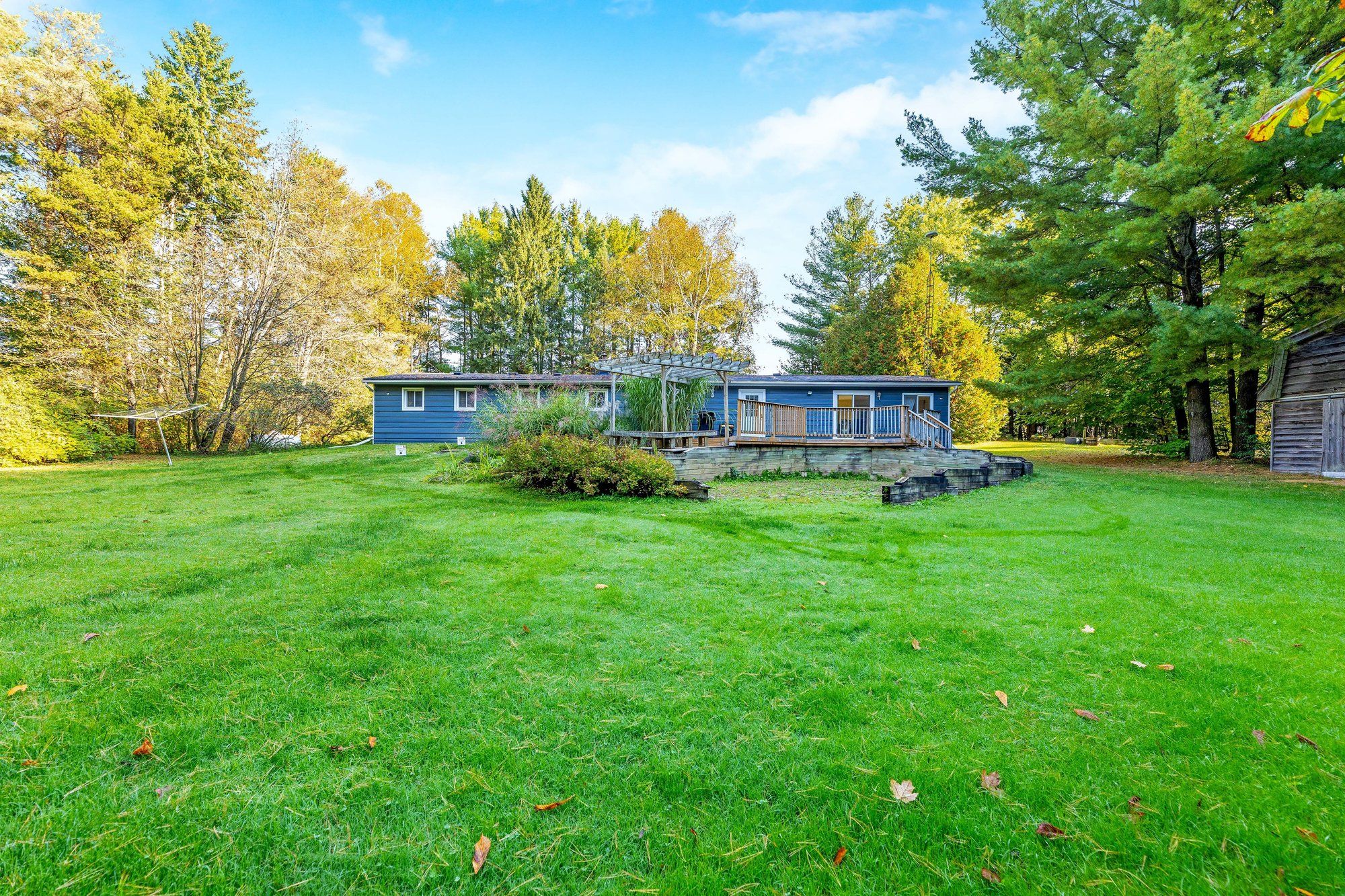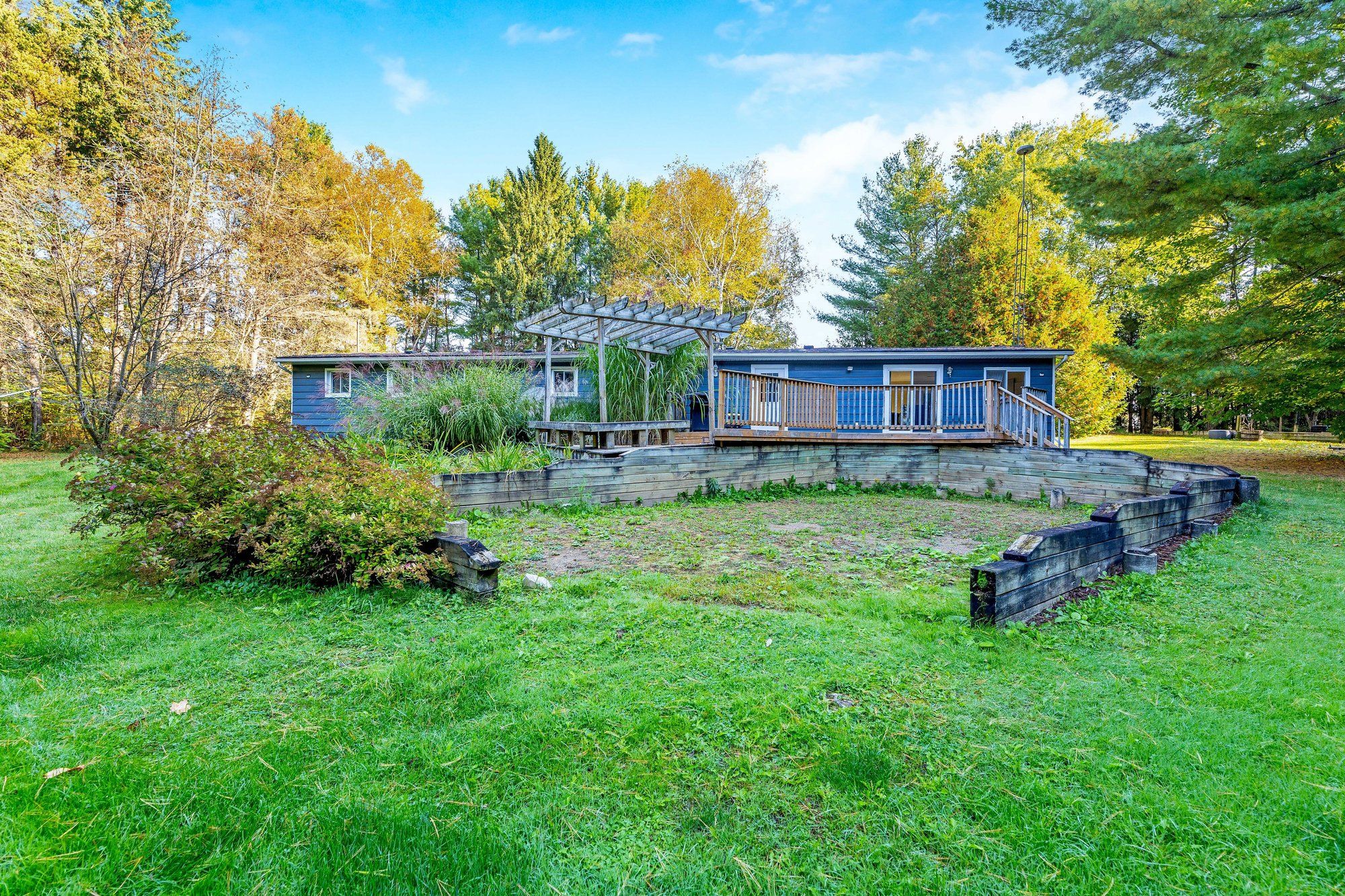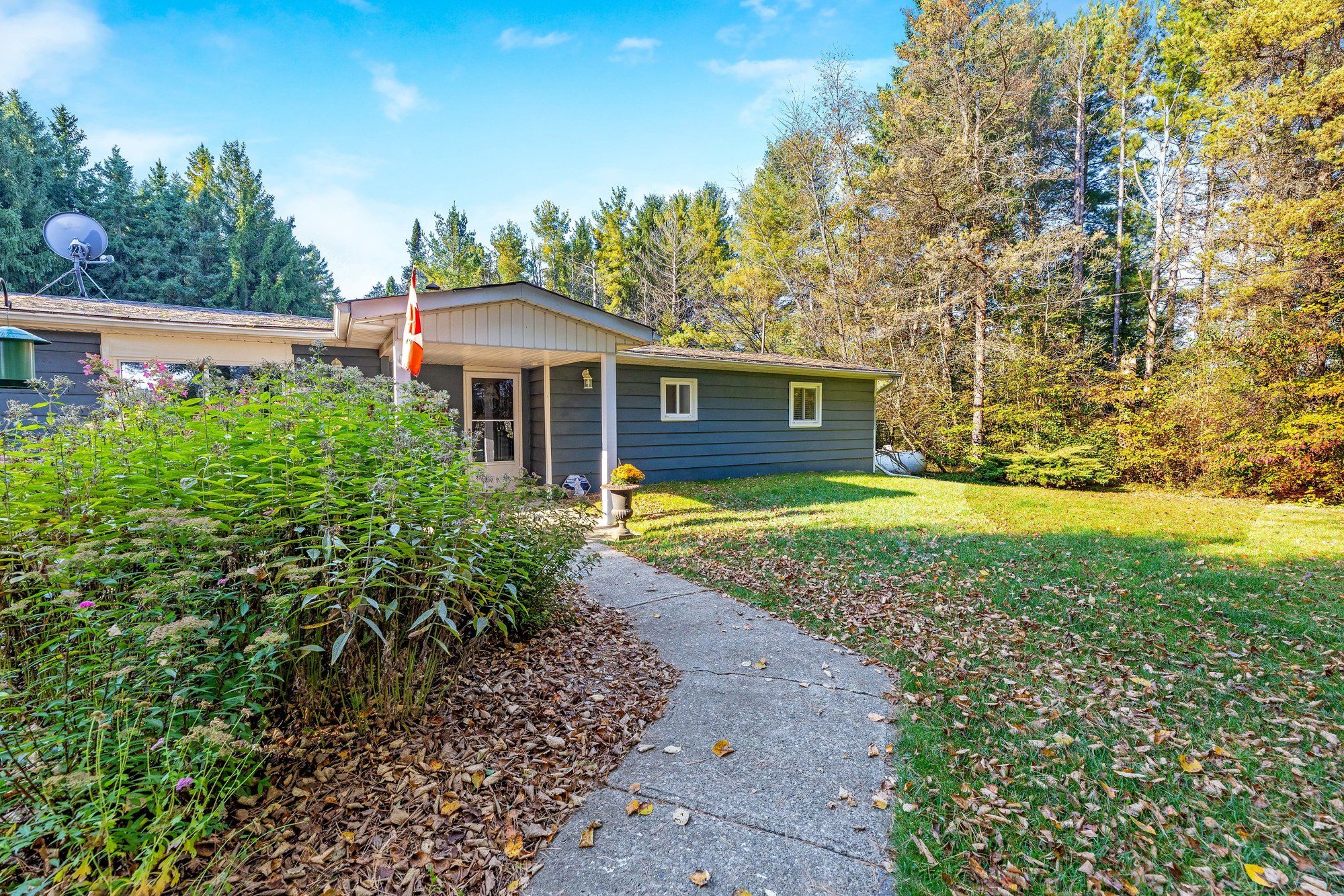 Nestled behind a screen of mature trees, this charming ranch-style bungalow offers a beautifully landscaped front yard with cozy sitting areas. The inviting covered front porch leads into a spacious kitchen, complete with stainless steel appliances and a breakfast bar that opens to the living room. A separate dining room provides the perfect setting for family meals. The expansive family room, featuring a cathedral ceiling, has a walkout to a large wooden deck, surrounded by vibrant perennial gardens and a pergola. The main floor hosts three bedrooms and a full bathroom. Outside, a detached outbuilding with a loft and workshop, fully equipped with electricity, offers plenty of space for hobbies and storage. The serene backyard includes vegetable gardens and a personal orchard with cherry, pear, and apple trees.