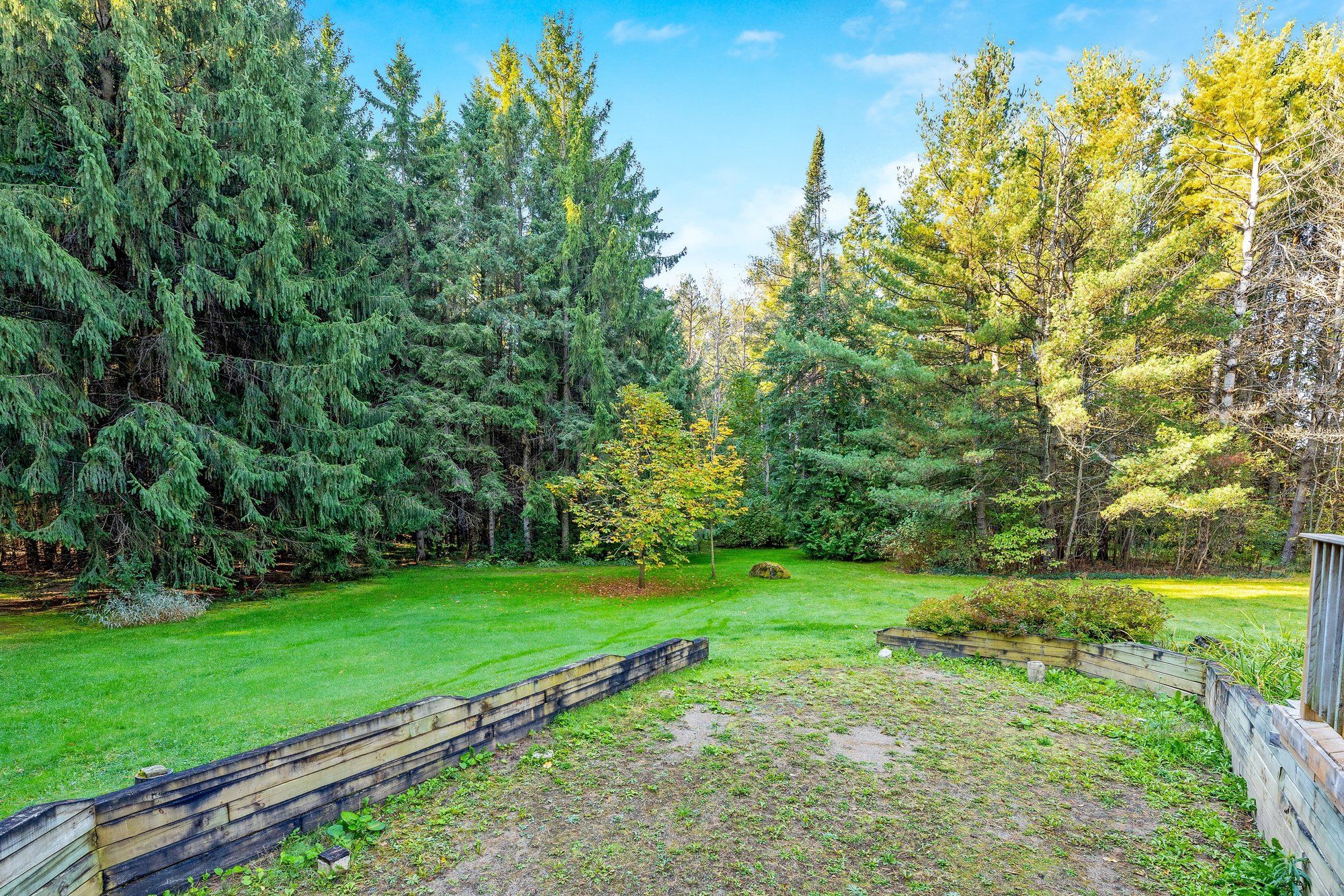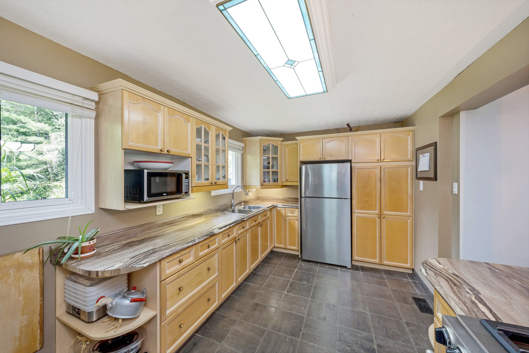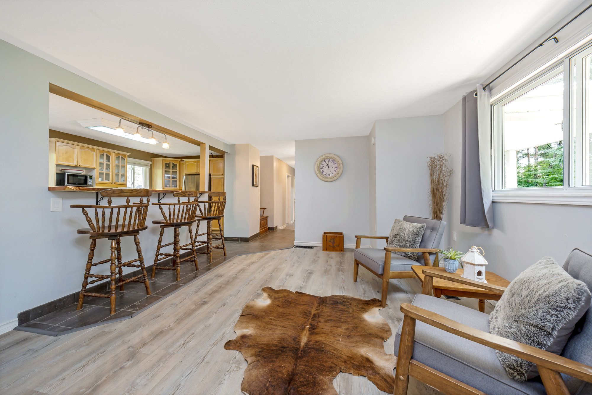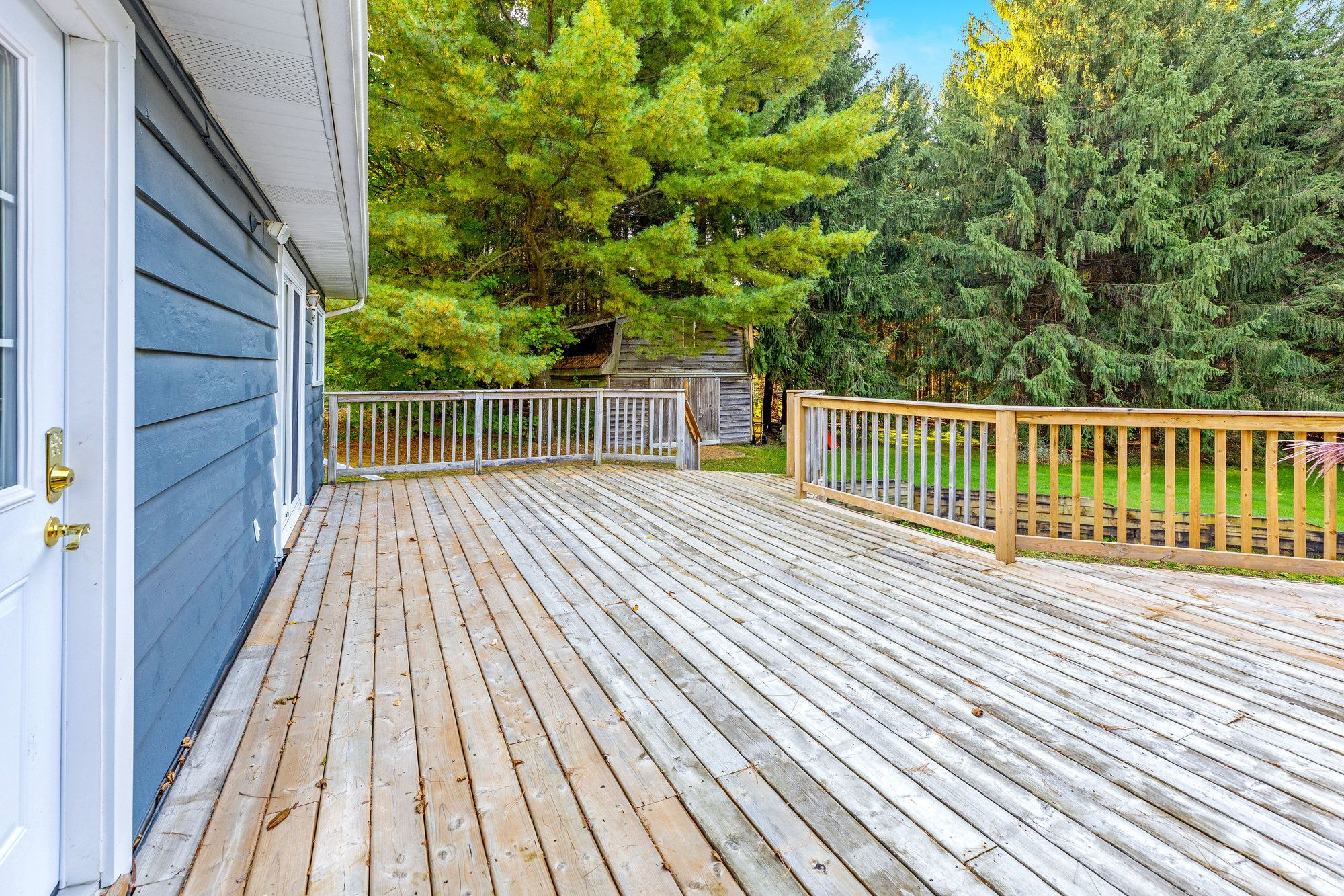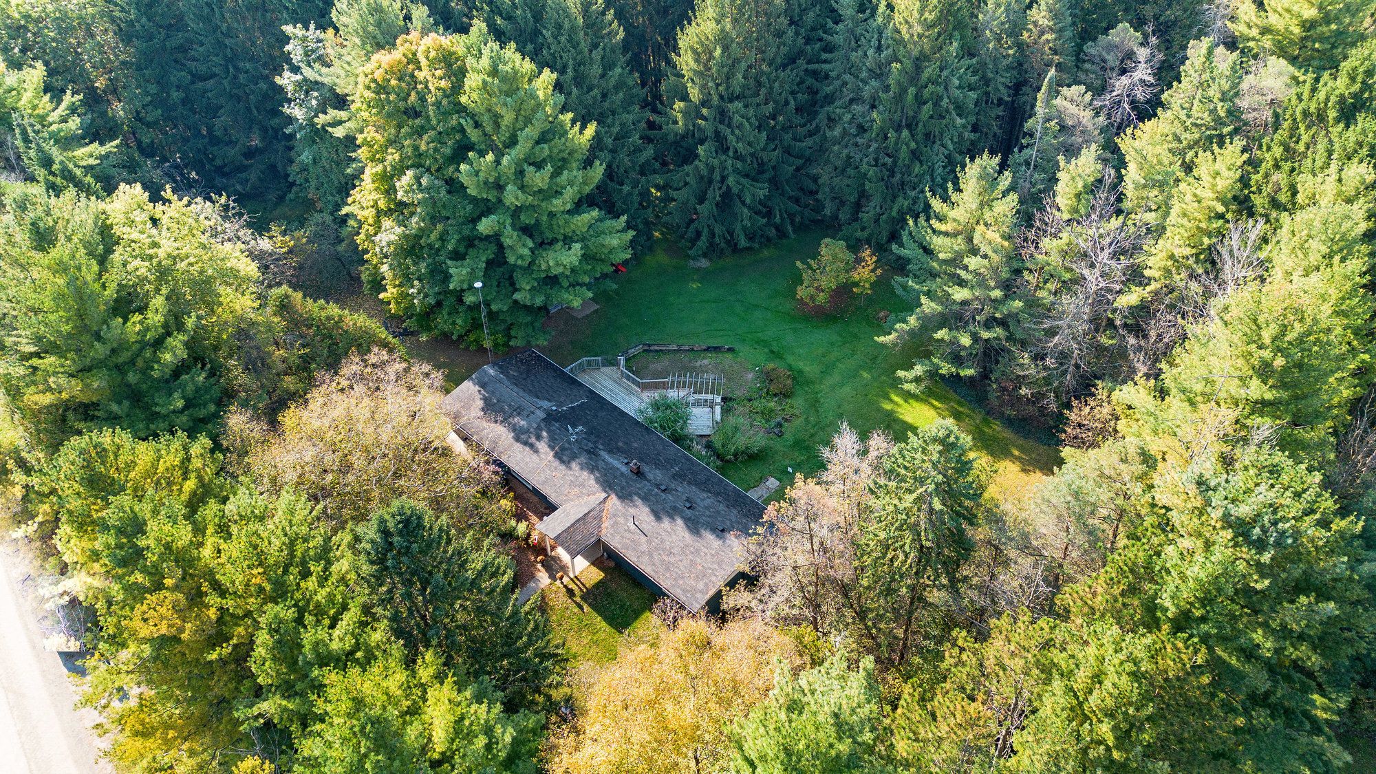 Nestled behind a screen of mature trees, this charming ranch-style bungalow offers a beautifully landscaped front yard with cozy sitting areas. The inviting covered front porch leads into a spacious kitchen, complete with stainless steel appliances and a breakfast bar that opens to the living room. A separate dining room provides the perfect setting for family meals. The expansive family room, featuring a cathedral ceiling, has a walkout to a large wooden deck, surrounded by vibrant perennial gardens and a pergola. The main floor hosts three bedrooms and a full bathroom. Outside, a detached outbuilding with a loft and workshop, fully equipped with electricity, offers plenty of space for hobbies and storage. The serene backyard includes vegetable gardens and a personal orchard with cherry, pear, and apple trees.