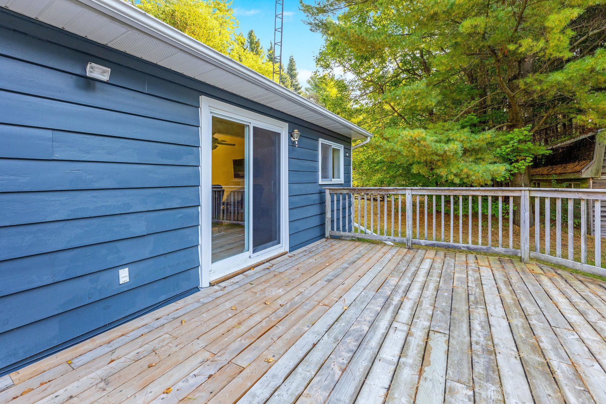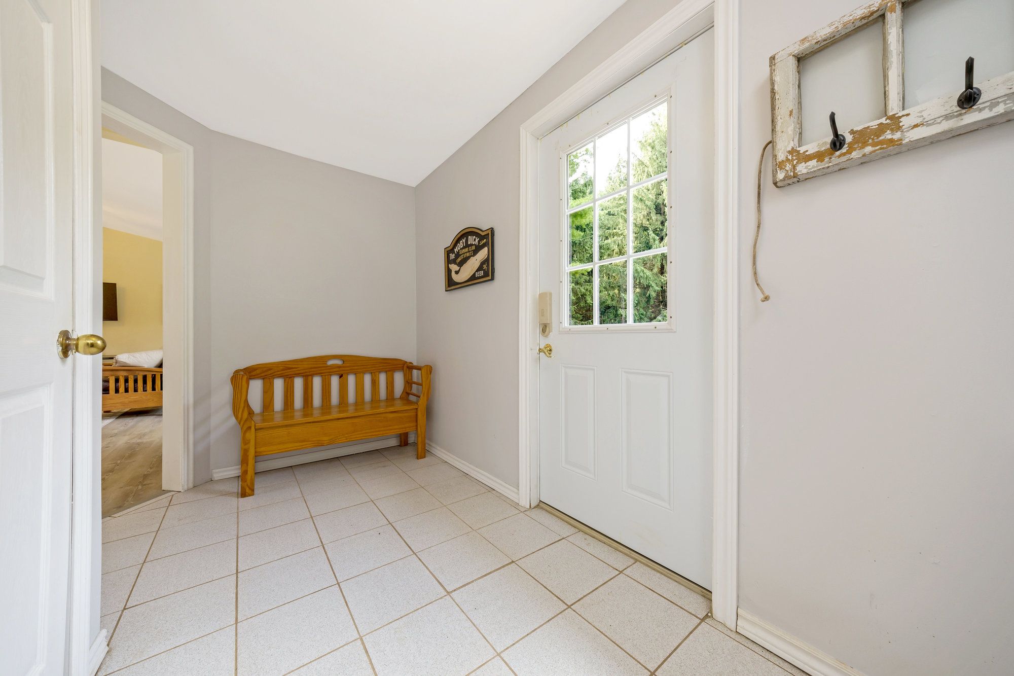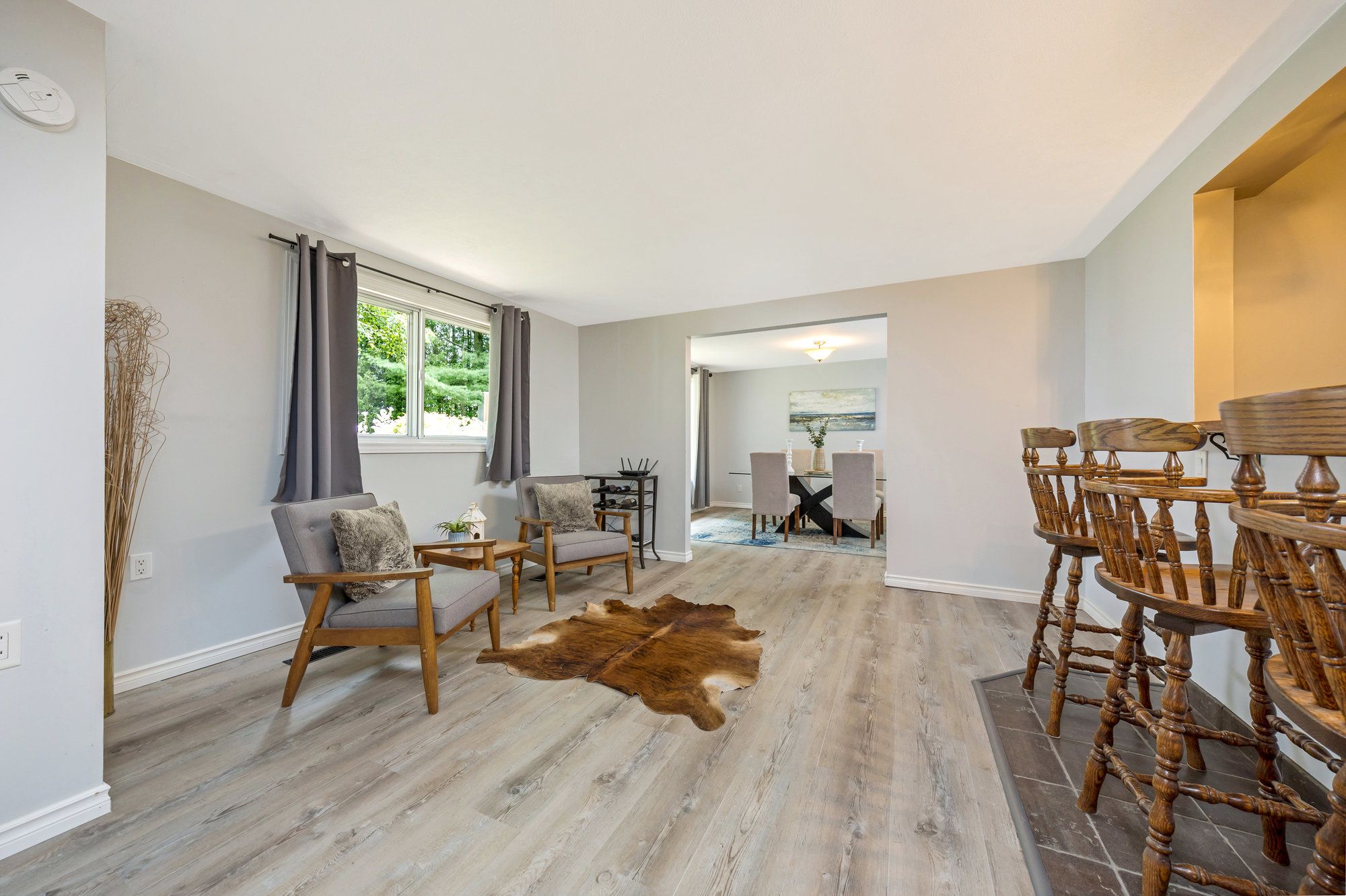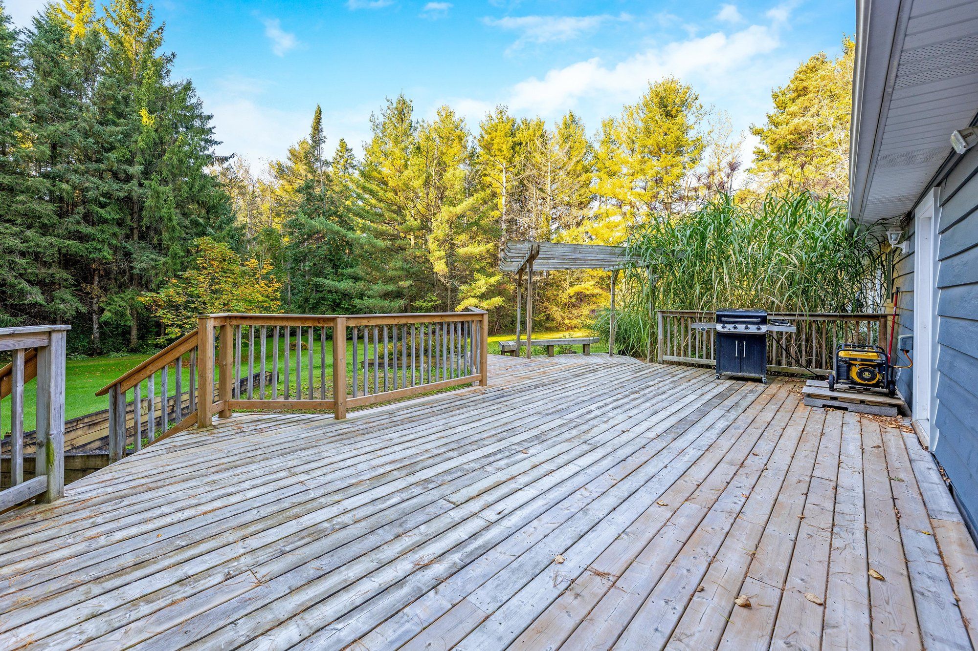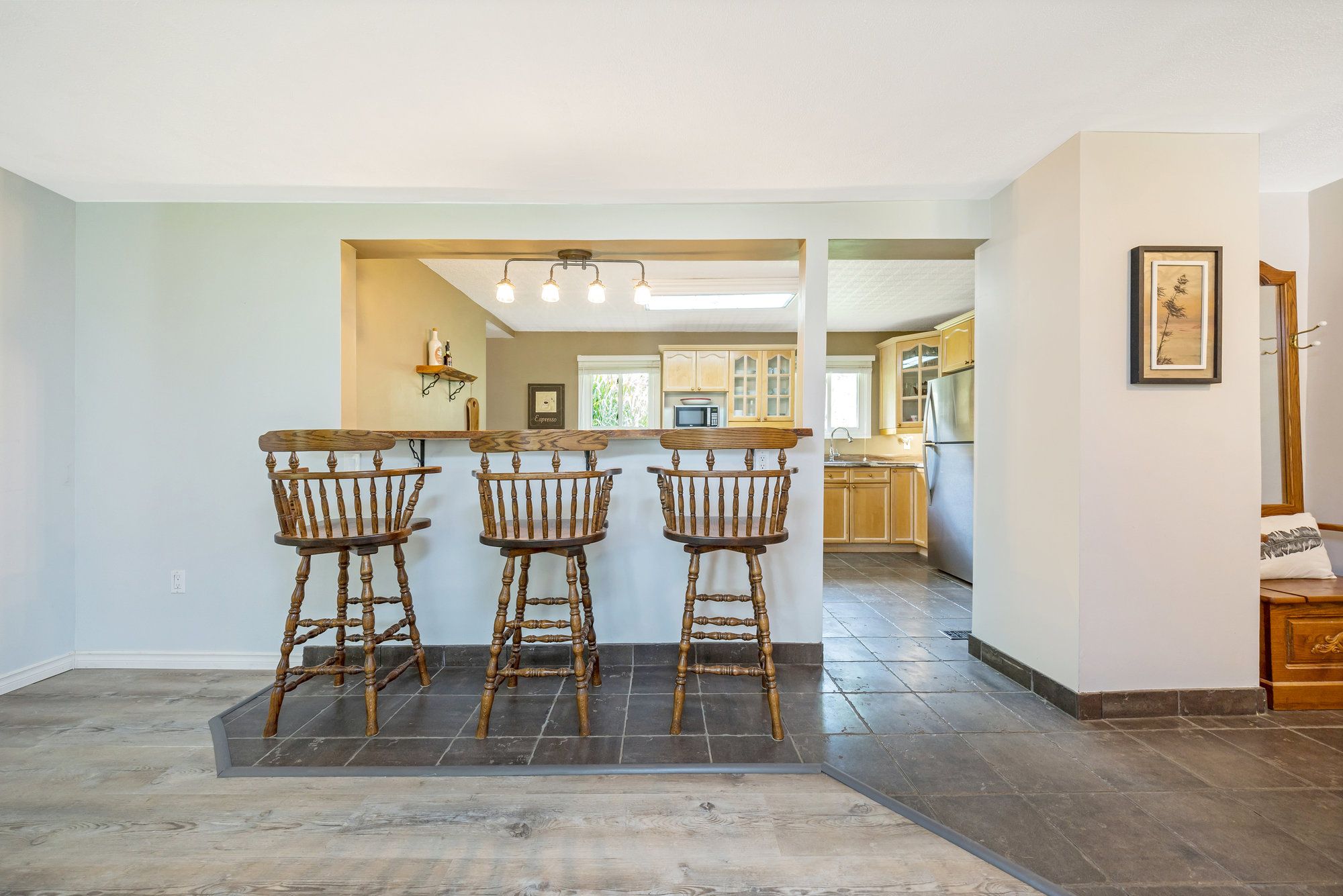 Nestled behind a screen of mature trees, this charming ranch-style bungalow offers a beautifully landscaped front yard with cozy sitting areas. The inviting covered front porch leads into a spacious kitchen, complete with stainless steel appliances and a breakfast bar that opens to the living room. A separate dining room provides the perfect setting for family meals. The expansive family room, featuring a cathedral ceiling, has a walkout to a large wooden deck, surrounded by vibrant perennial gardens and a pergola. The main floor hosts three bedrooms and a full bathroom. Outside, a detached outbuilding with a loft and workshop, fully equipped with electricity, offers plenty of space for hobbies and storage. The serene backyard includes vegetable gardens and a personal orchard with cherry, pear, and apple trees.