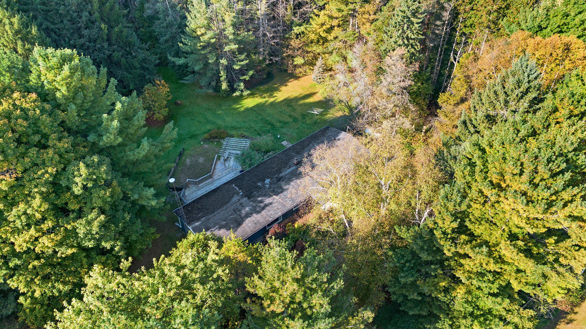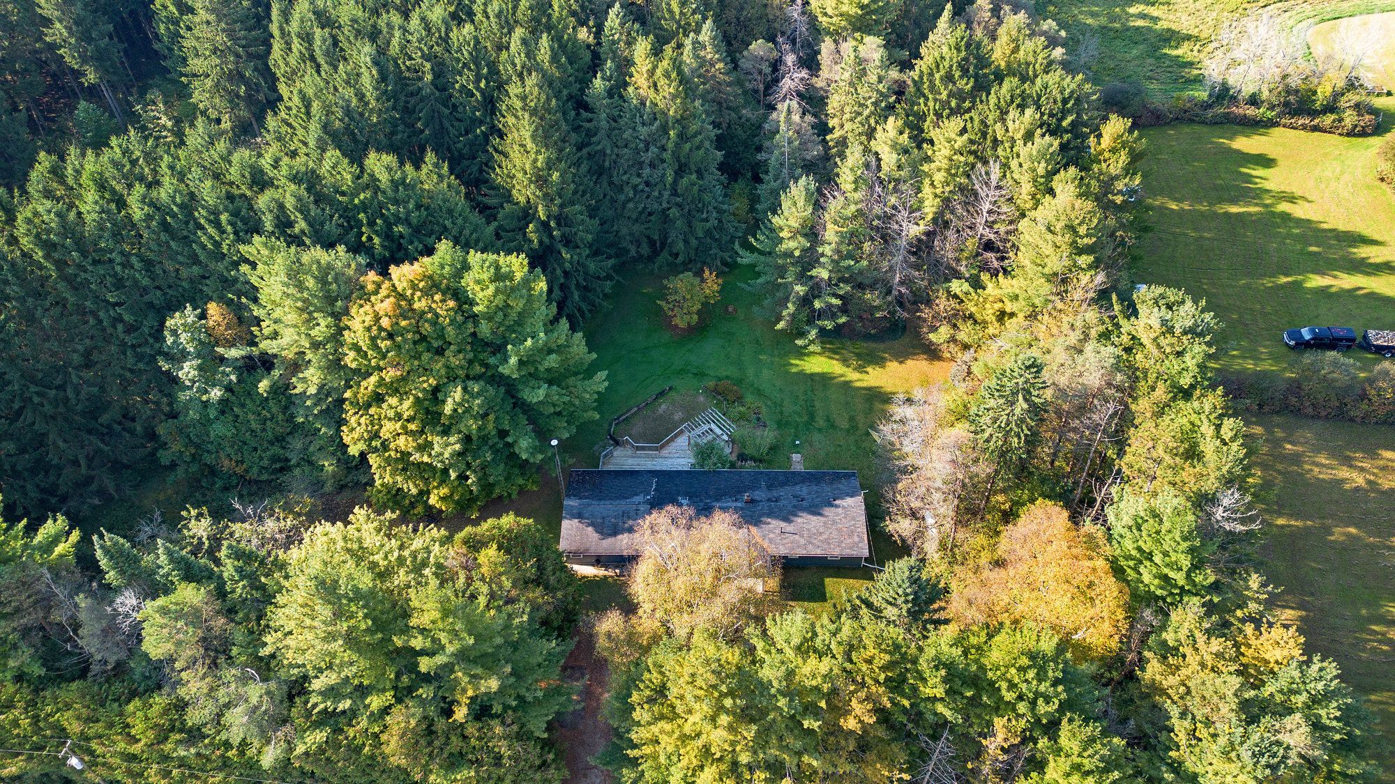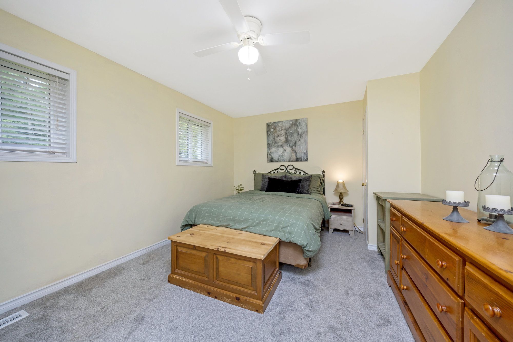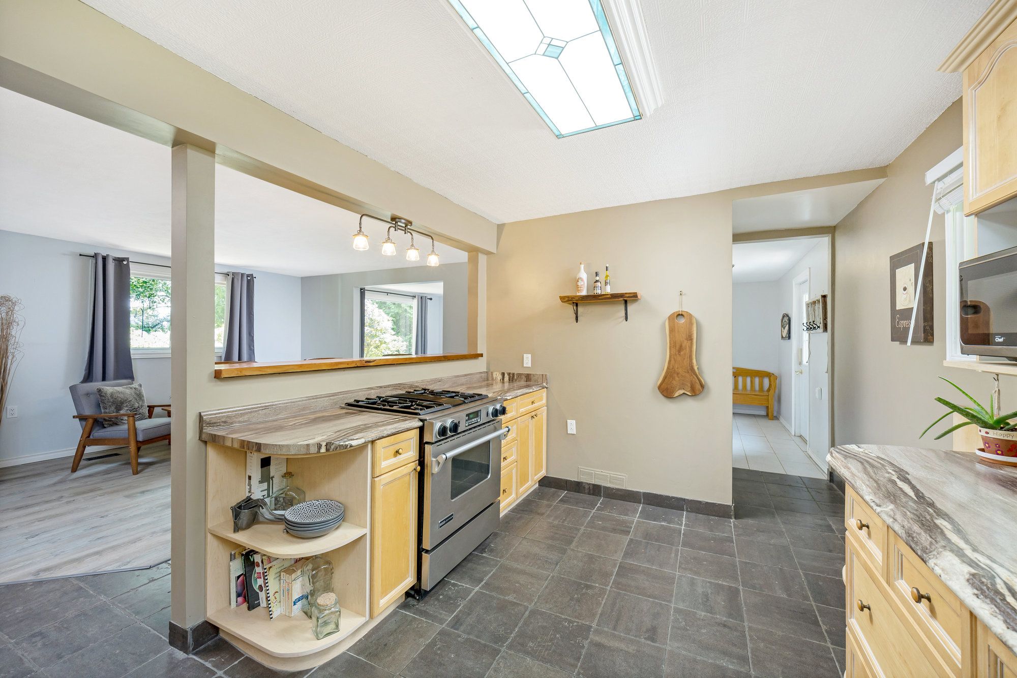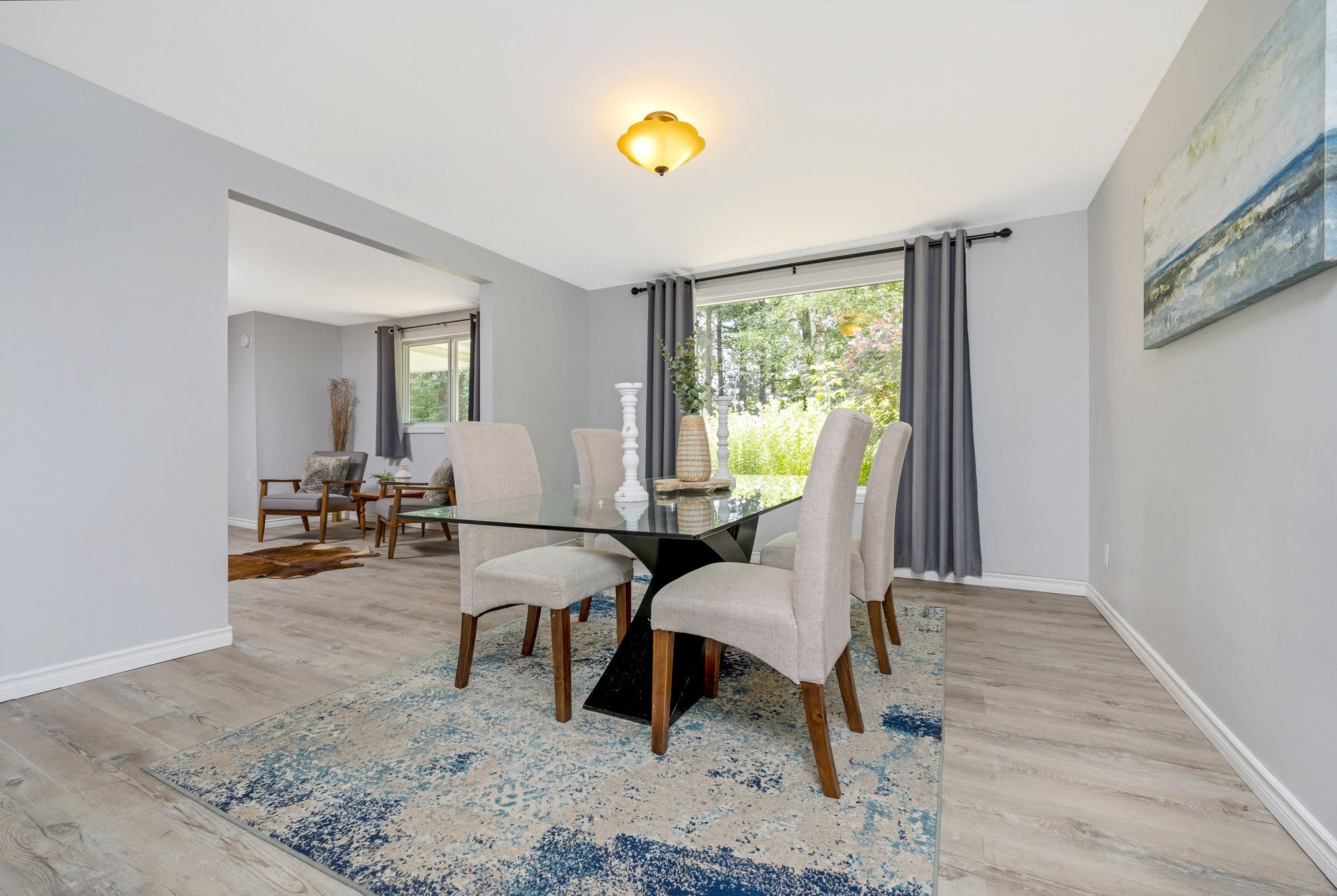 Nestled behind a screen of mature trees, this charming ranch-style bungalow offers a beautifully landscaped front yard with cozy sitting areas. The inviting covered front porch leads into a spacious kitchen, complete with stainless steel appliances and a breakfast bar that opens to the living room. A separate dining room provides the perfect setting for family meals. The expansive family room, featuring a cathedral ceiling, has a walkout to a large wooden deck, surrounded by vibrant perennial gardens and a pergola. The main floor hosts three bedrooms and a full bathroom. Outside, a detached outbuilding with a loft and workshop, fully equipped with electricity, offers plenty of space for hobbies and storage. The serene backyard includes vegetable gardens and a personal orchard with cherry, pear, and apple trees.