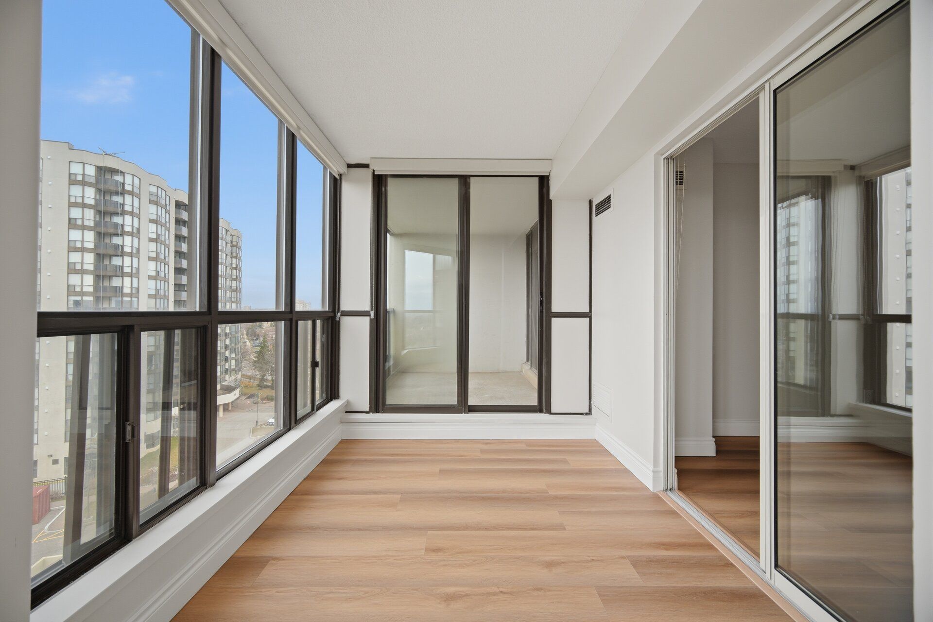Immaculate, bright and spacious fully renovated 2-bedroom plus den, 2 full bathroom condominiumsuite with a bright, sun-filled solarium and walkout to a private balcony with unobstructedviews. Functional layout with generous principal rooms and excellent natural light throughout. Fully renovated with quality upgrades, featuring a brand-new modern kitchen with quartzcountertops, updated appliances, custom blinds, fully renovated bathrooms, including 3 pcensuite in the primary bedroom. Enjoy the convenience of an ensuite laundry with a newer washerand dryer. This unit has new vinyl flooring and is freshly painted throughout. One parkingspace included. Located in a well-managed building with recent renovations to the lobby,hallways, elevators, and party room, and excellent amenities including an indoor heated pool,hot tub, and more. Close to transit, shopping, parks, schools, library, community centre, andmajor highways, ideal for professionals or downsizers seeking space, comfort, and quality in aconnected location. All utilities included, including cable & internet.