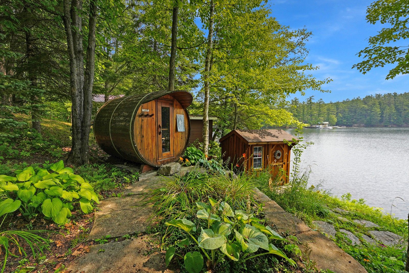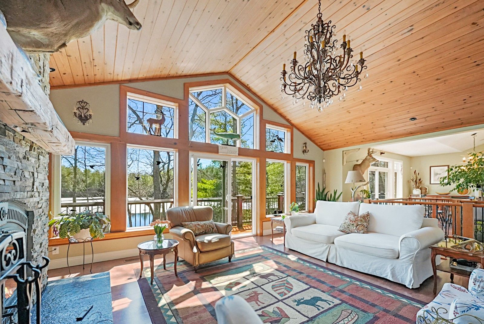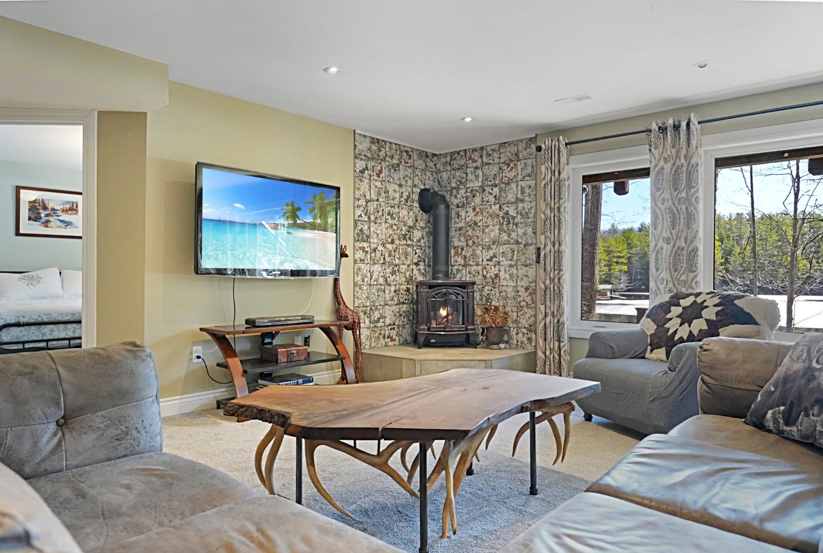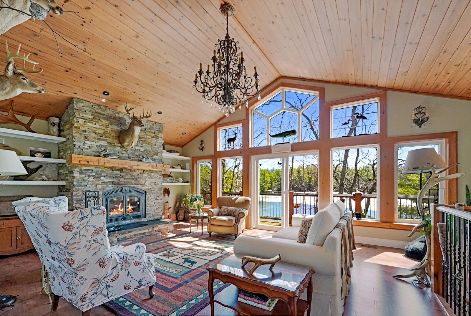 Located on kushog lake in algonquin highlands, this fully finished viceroy home offers a spacious and family-focused waterfront setting in a sheltered bay with minimal boat traffic-ideal for swimming, paddleboarding, canoeing, and kayaking. With approximately 3,600 sq ft of living space, the home is designed to comfortably accommodate larger families. The main floor features cathedral ceilings and an open-concept layout, with a wood-burning fireplace in the living room and large windows bringing in natural light and lake views. The primary bedroom includes a 3-piece ensuite and walkout to the lakeside deck, while two additional bedrooms and a full bathroom complete the main level. The walkout lower level adds even more space, offering two additional bedrooms, a 4-piece bathroom, and a large rec room with a propane fireplace-perfect for movie nights, games, or extended family stays. Outdoors, the property is professionally landscaped and set up for gathering and relaxation, featuring a screened-in porch, a lakeside firepit area, and a sauna by the water. Located just 20 minutes to minden and 30 minutes to haliburton, and close to some of the area's well-known dining spots, this property combines space, comfort, and a location well-suited for making lasting family memories.