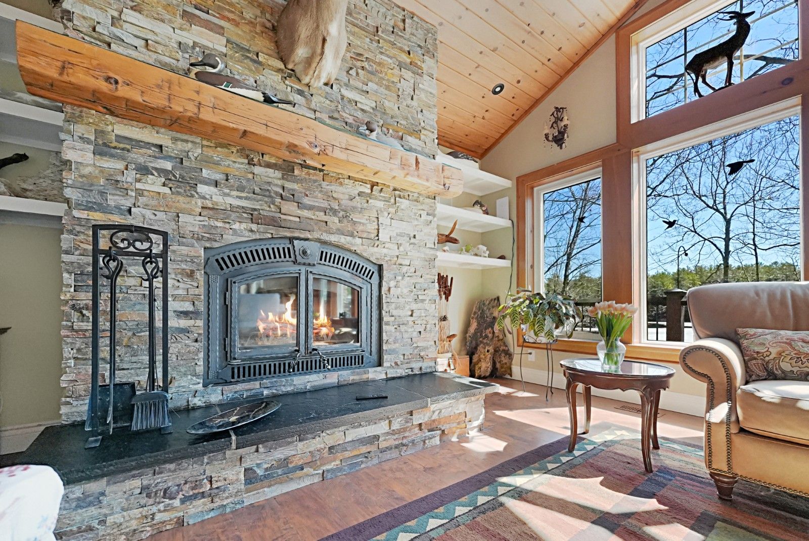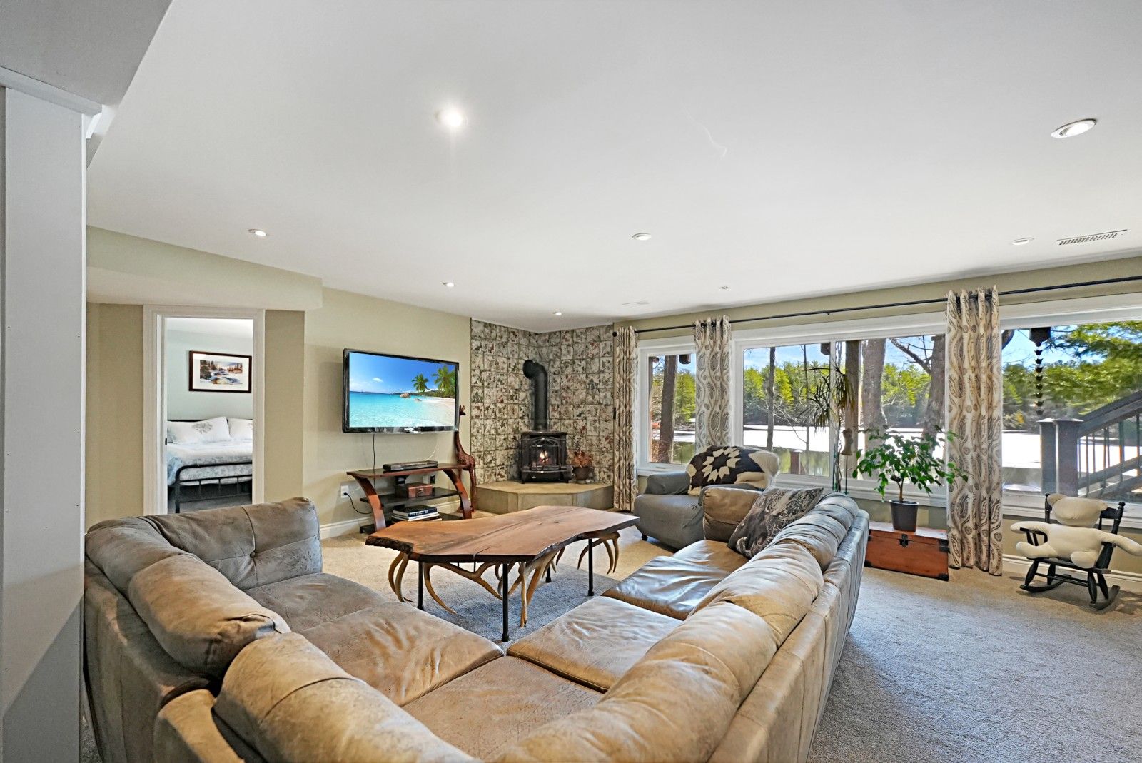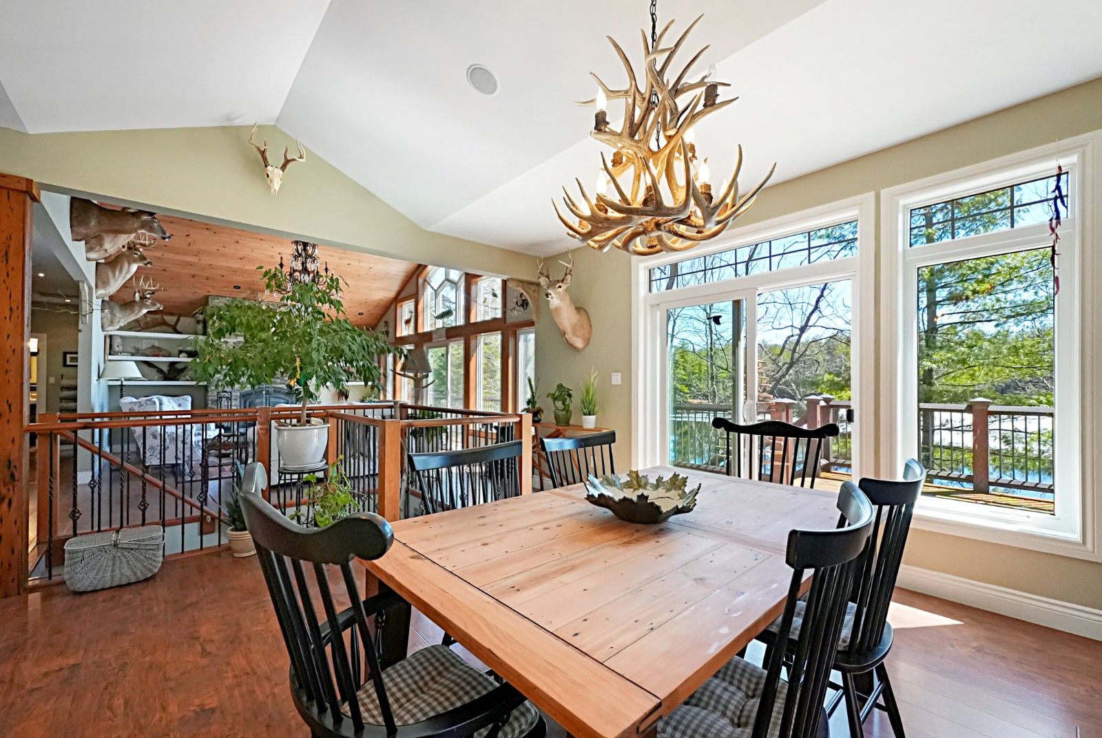 Located on kushog lake in algonquin highlands, this fully finished viceroy home offers a spacious and family-focused waterfront setting in a sheltered bay with minimal boat traffic-ideal for swimming, paddleboarding, canoeing, and kayaking. With approximately 3,600 sq ft of living space, the home is designed to comfortably accommodate larger families. The main floor features cathedral ceilings and an open-concept layout, with a wood-burning fireplace in the living room and large windows bringing in natural light and lake views. The primary bedroom includes a 3-piece ensuite and walkout to the lakeside deck, while two additional bedrooms and a full bathroom complete the main level. The walkout lower level adds even more space, offering two additional bedrooms, a 4-piece bathroom, and a large rec room with a propane fireplace-perfect for movie nights, games, or extended family stays. Outdoors, the property is professionally landscaped and set up for gathering and relaxation, featuring a screened-in porch, a lakeside firepit area, and a sauna by the water. Located just 20 minutes to minden and 30 minutes to haliburton, and close to some of the area's well-known dining spots, this property combines space, comfort, and a location well-suited for making lasting family memories.