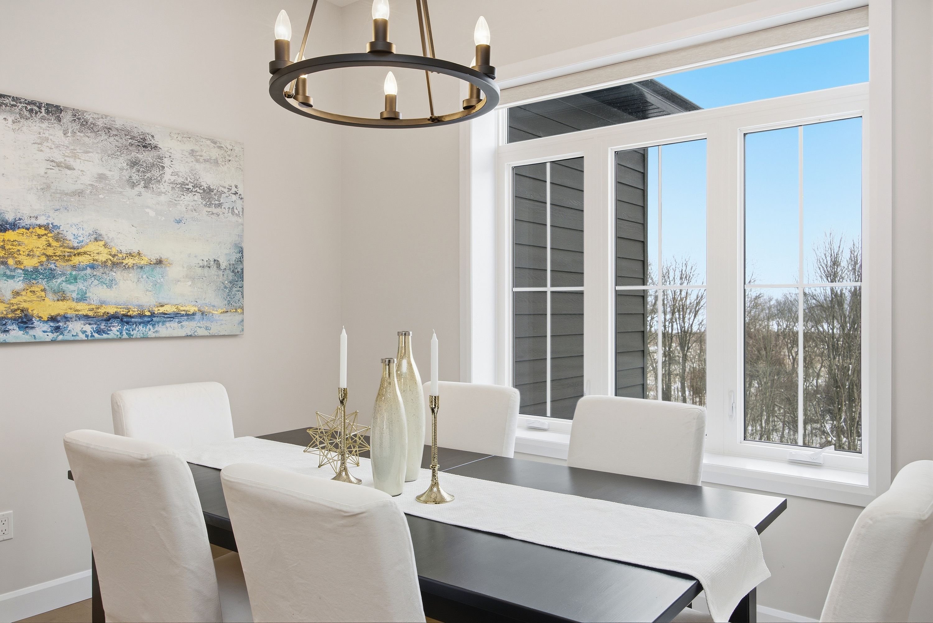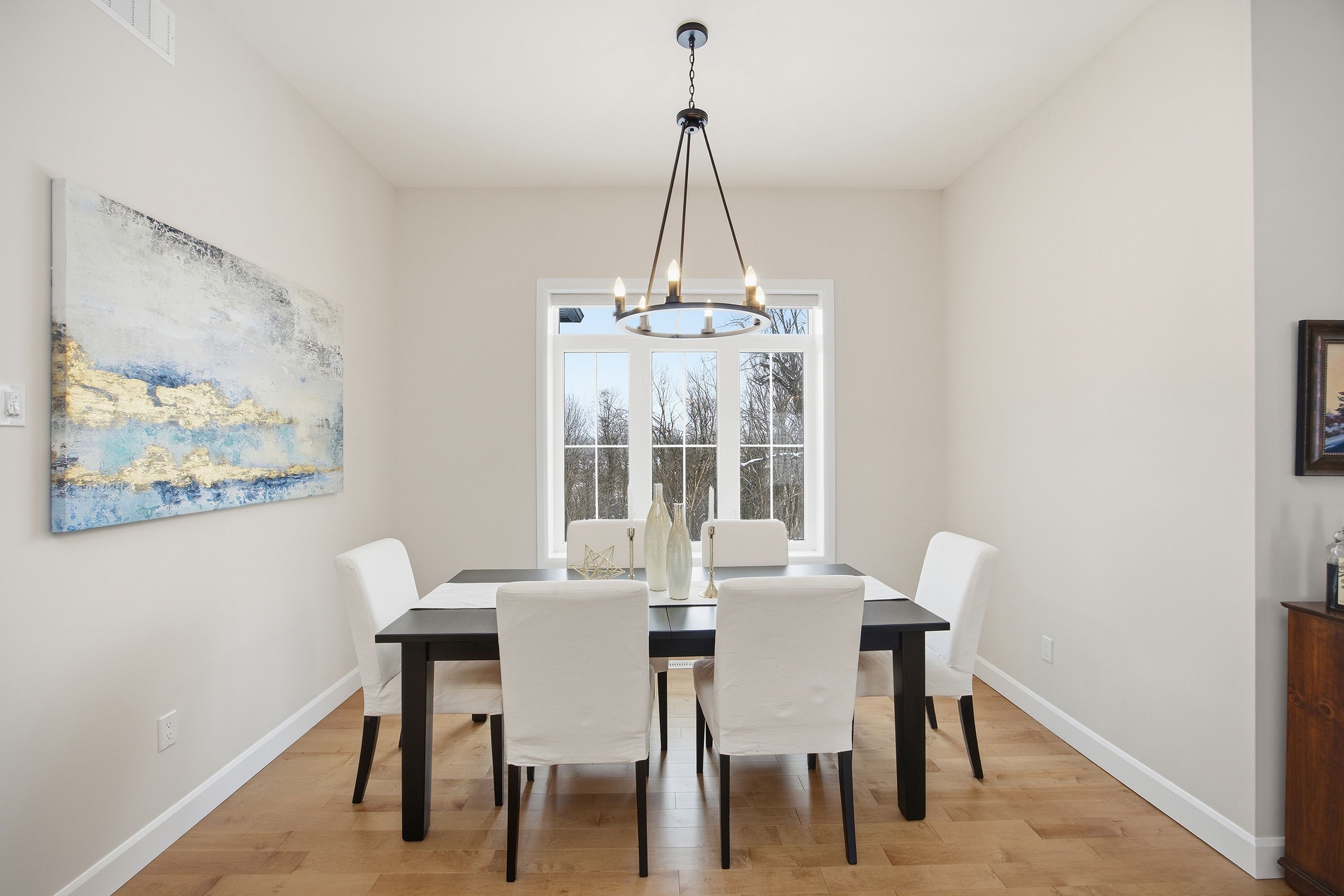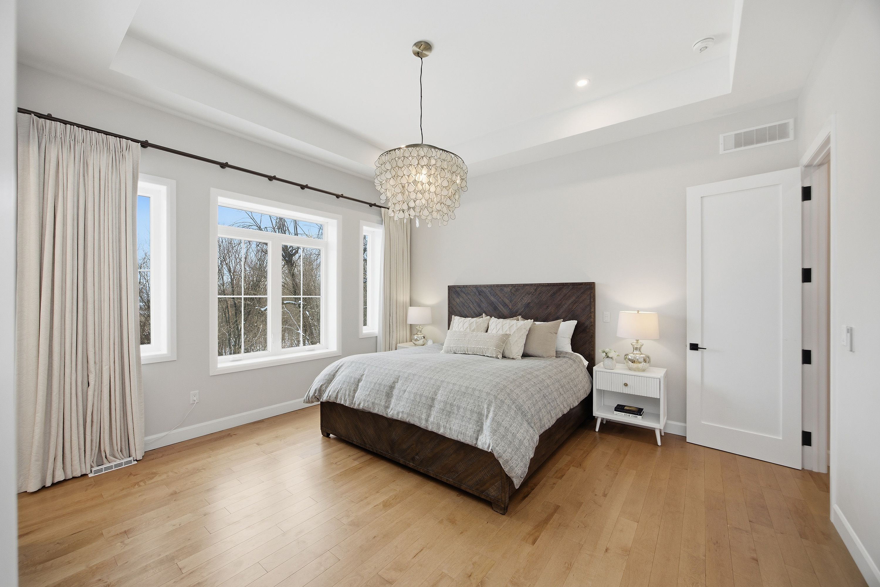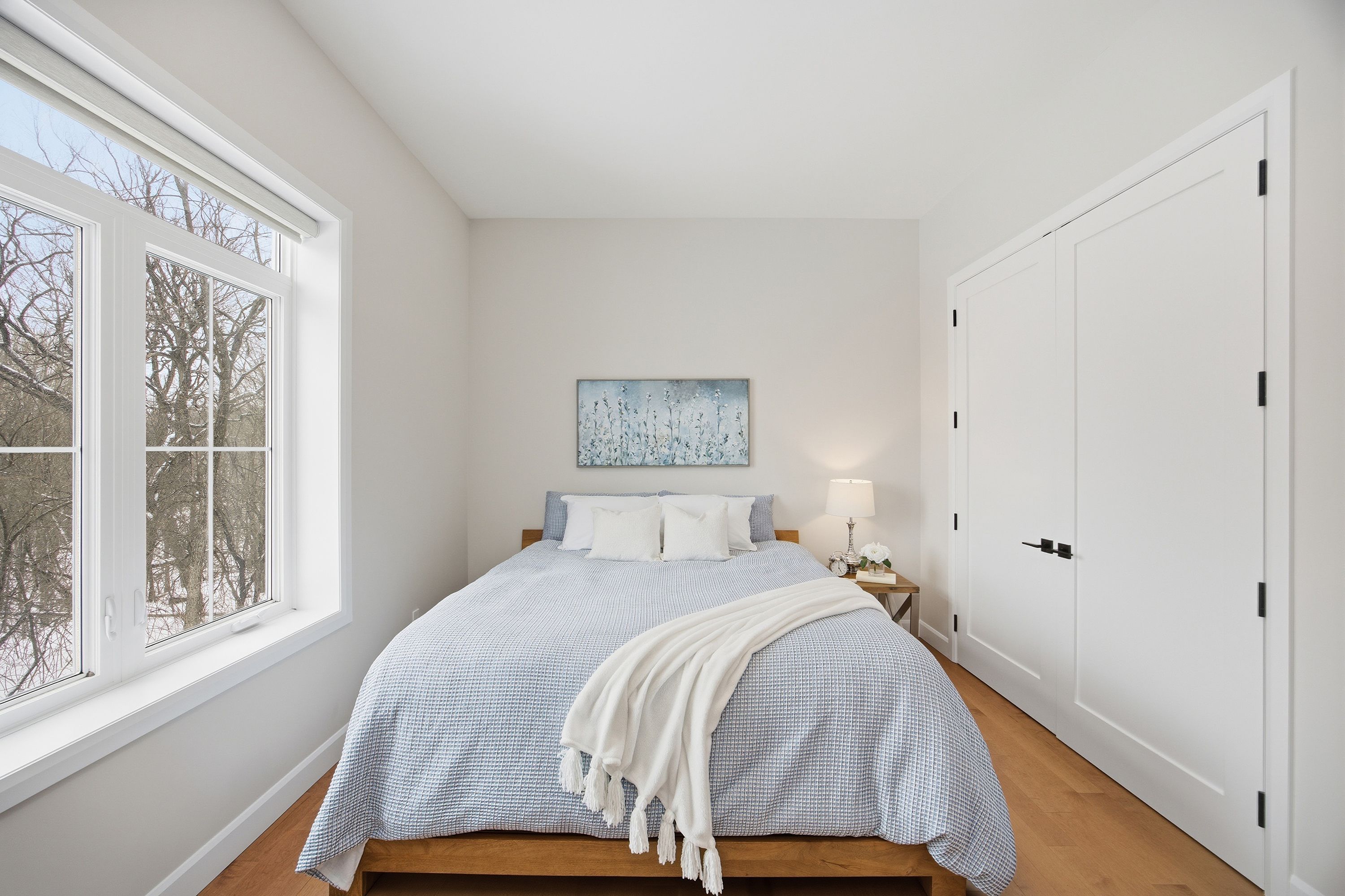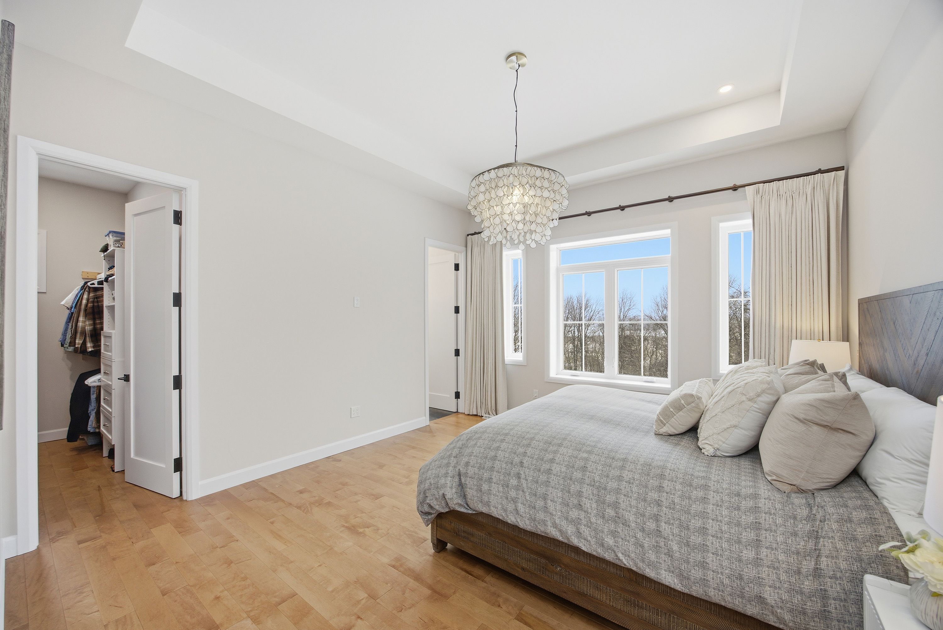 • Expansive windows provide light and picturesque wooded views with lake glimpses.
