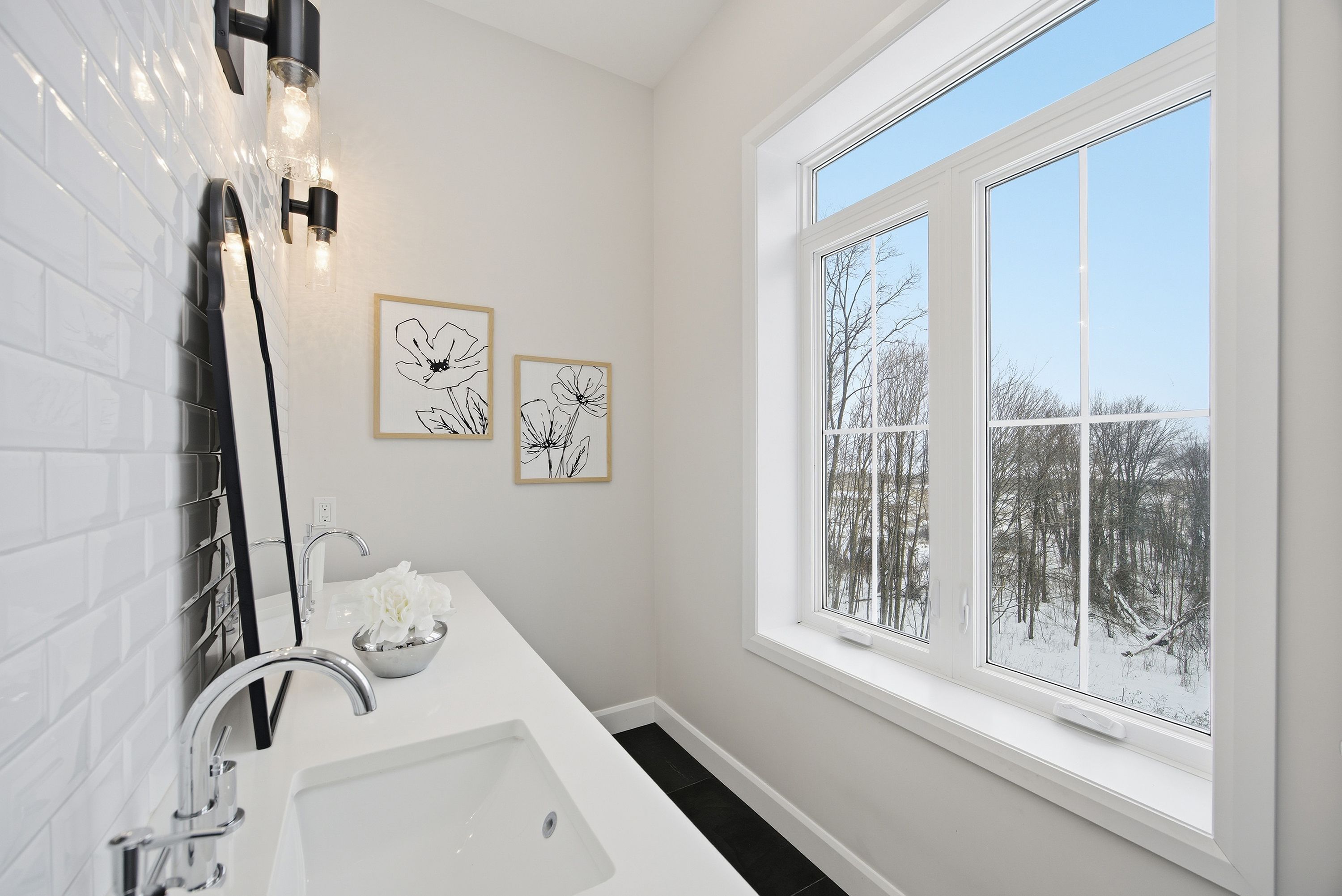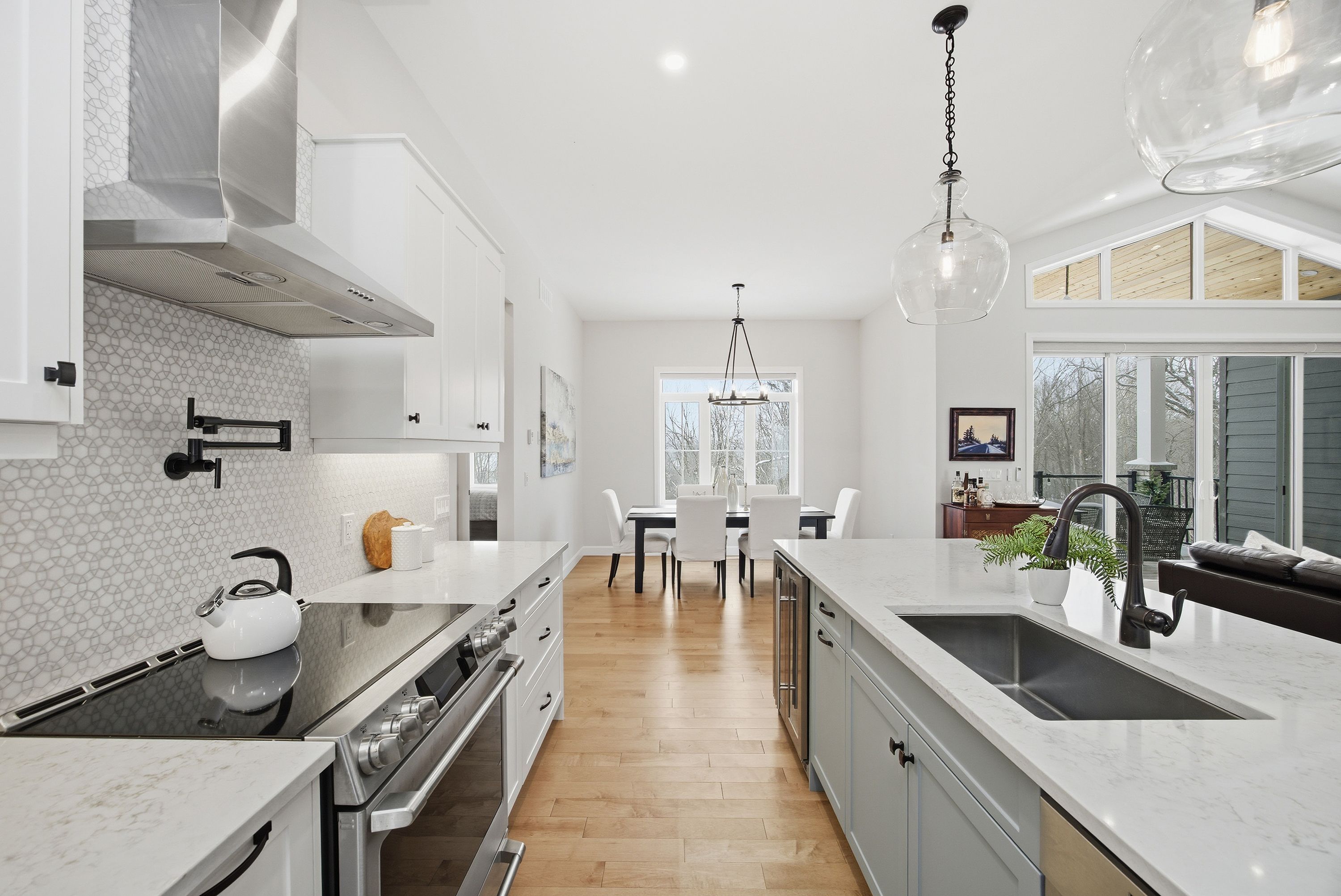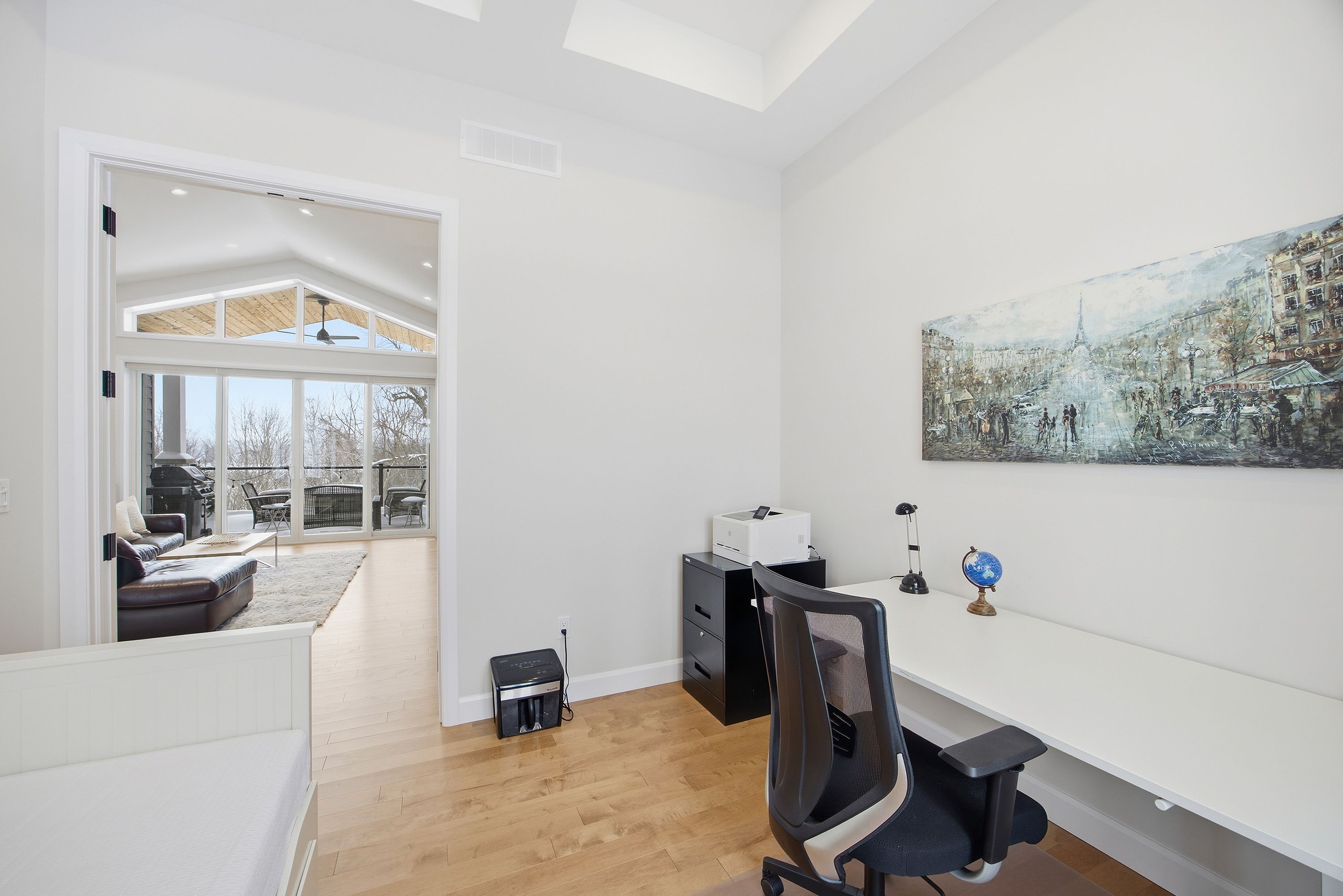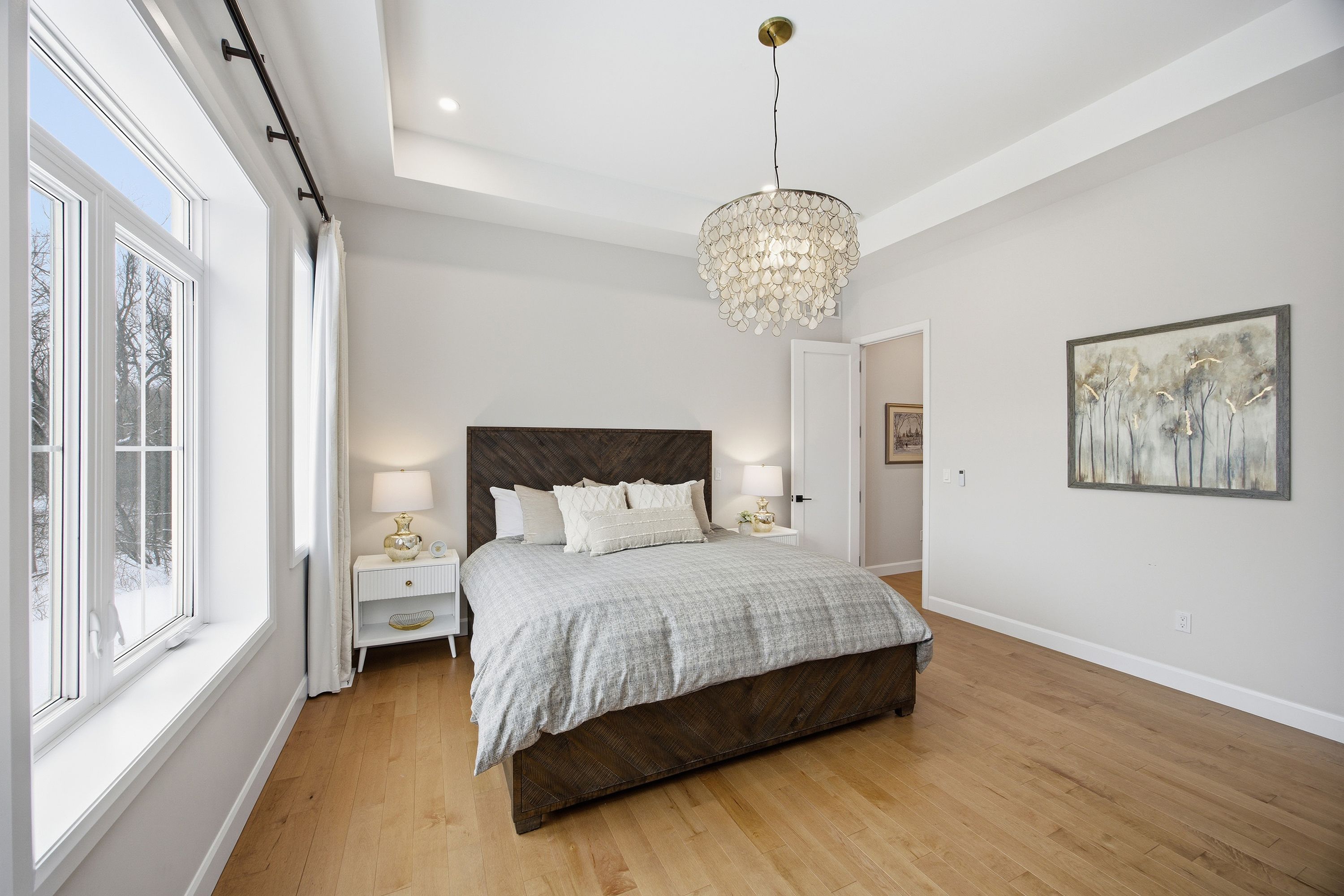• Expansive windows provide light and picturesque wooded views with lake glimpses.