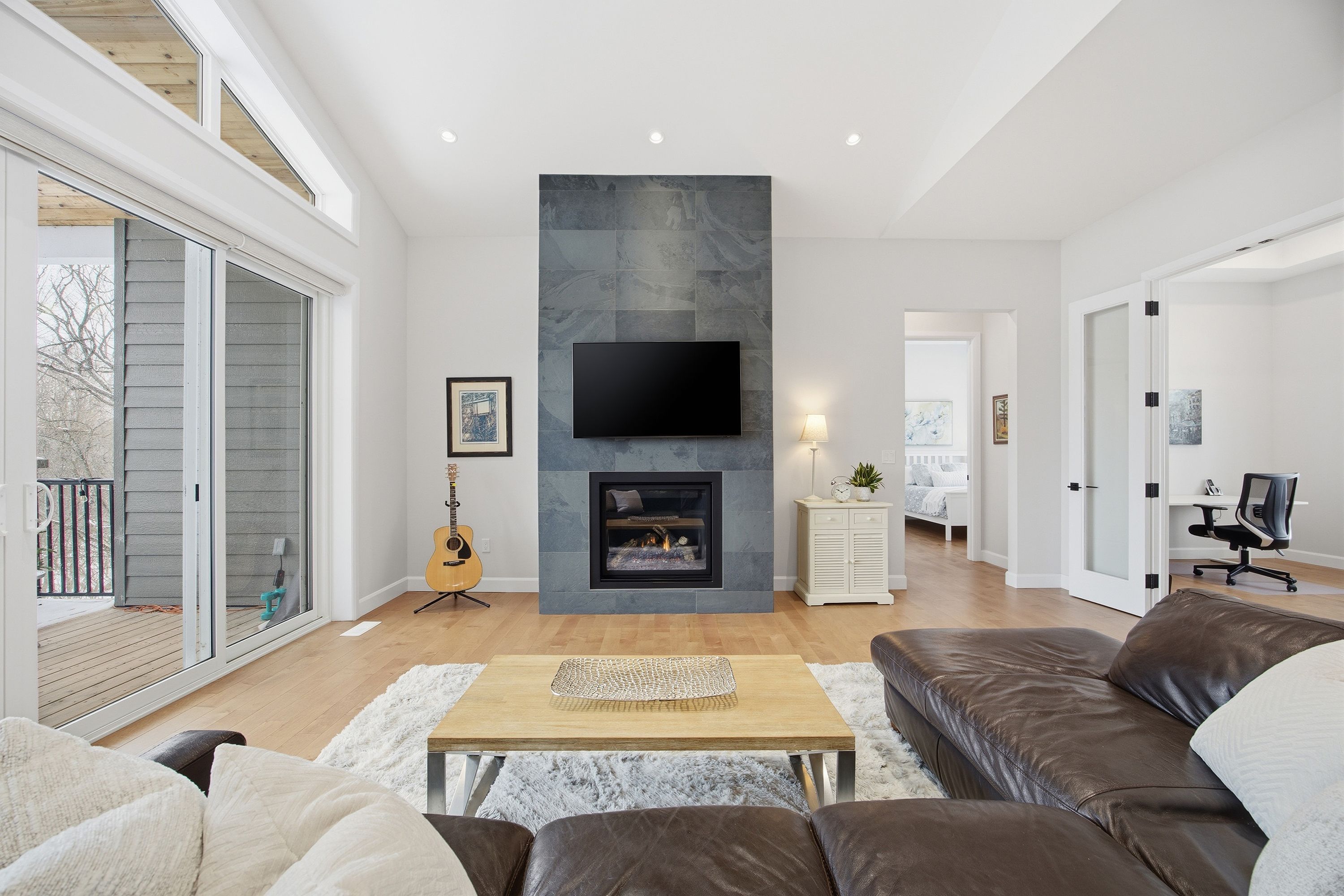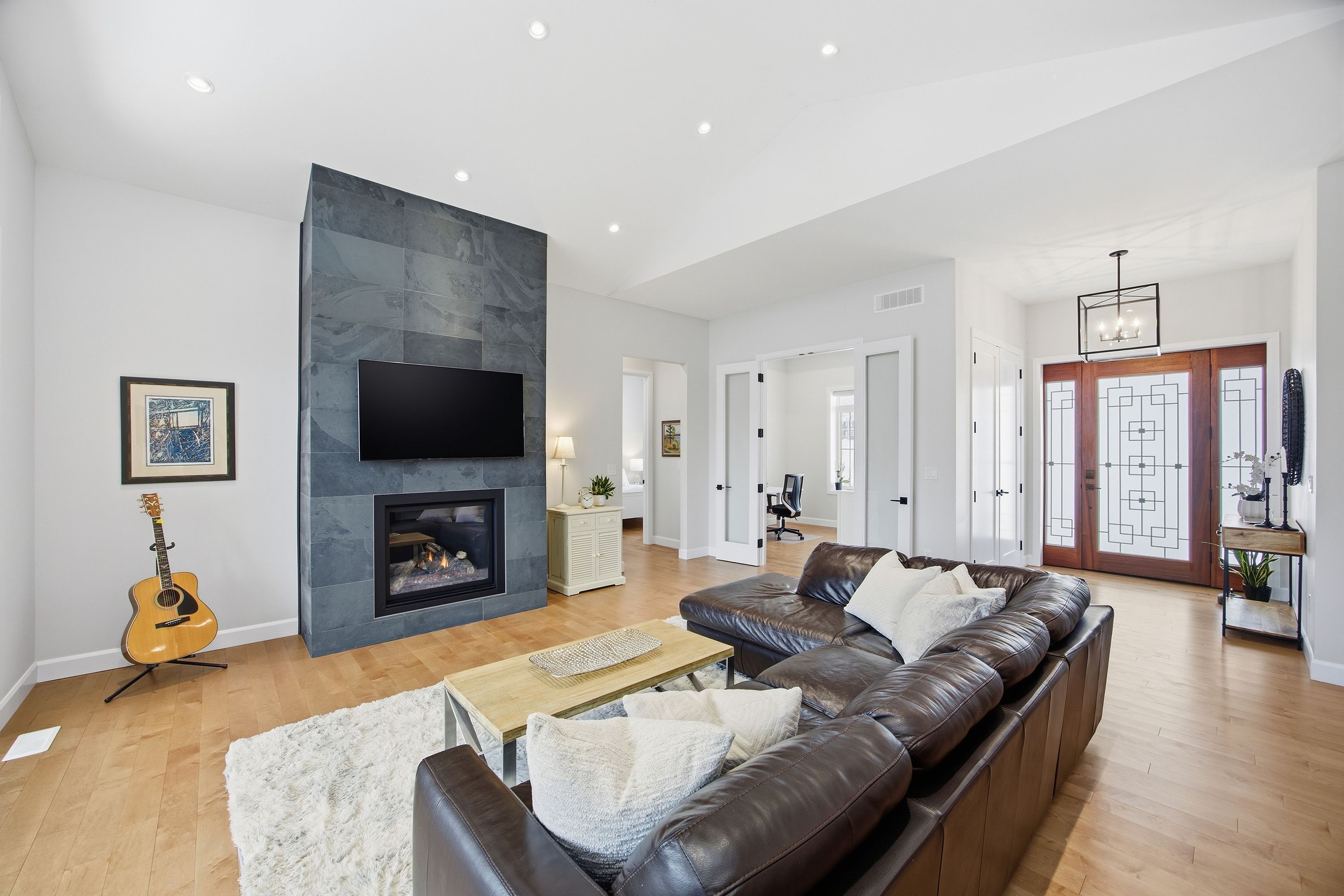 • Inviting living room features vaulted ceilings and a floor-to-ceiling fireplace.