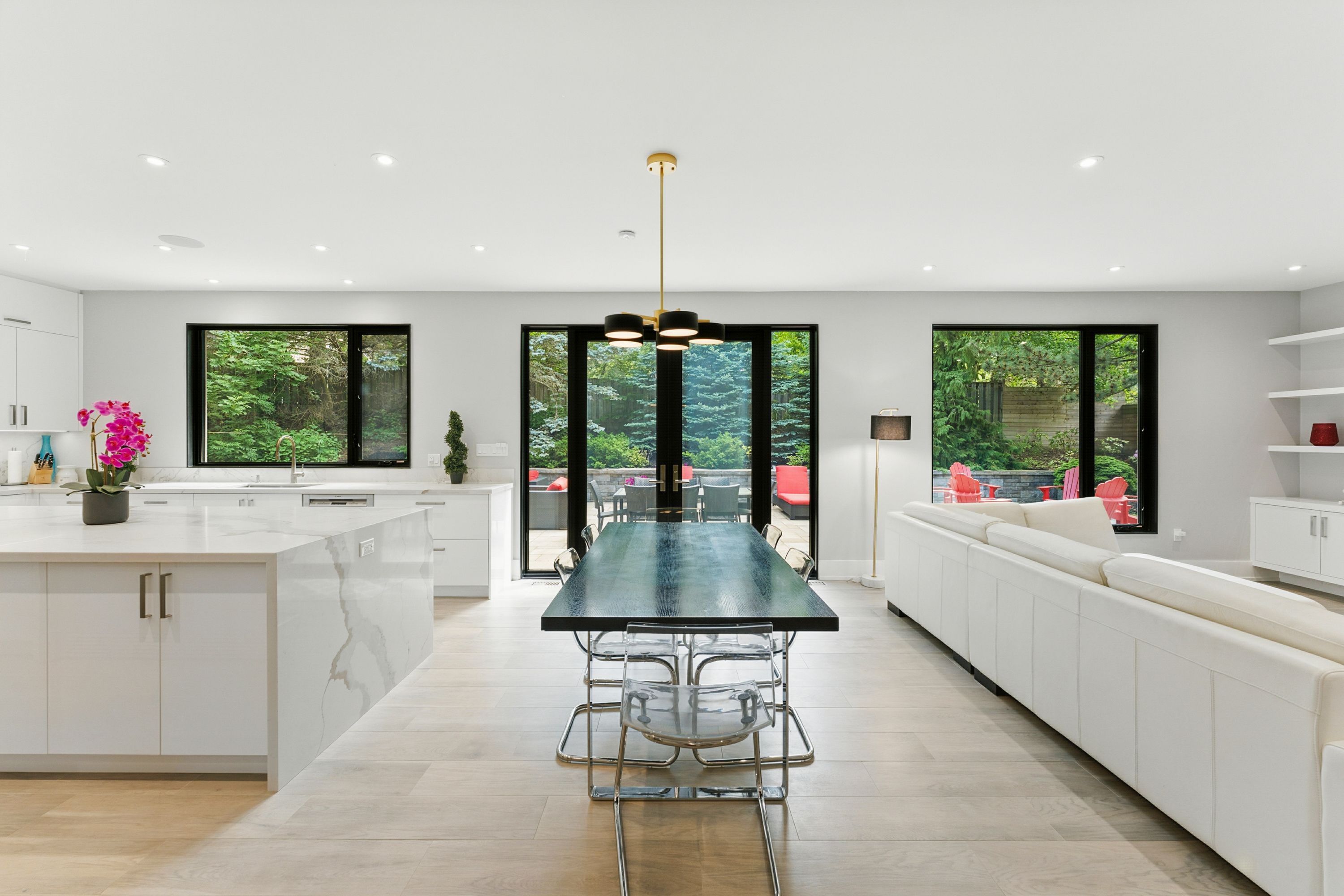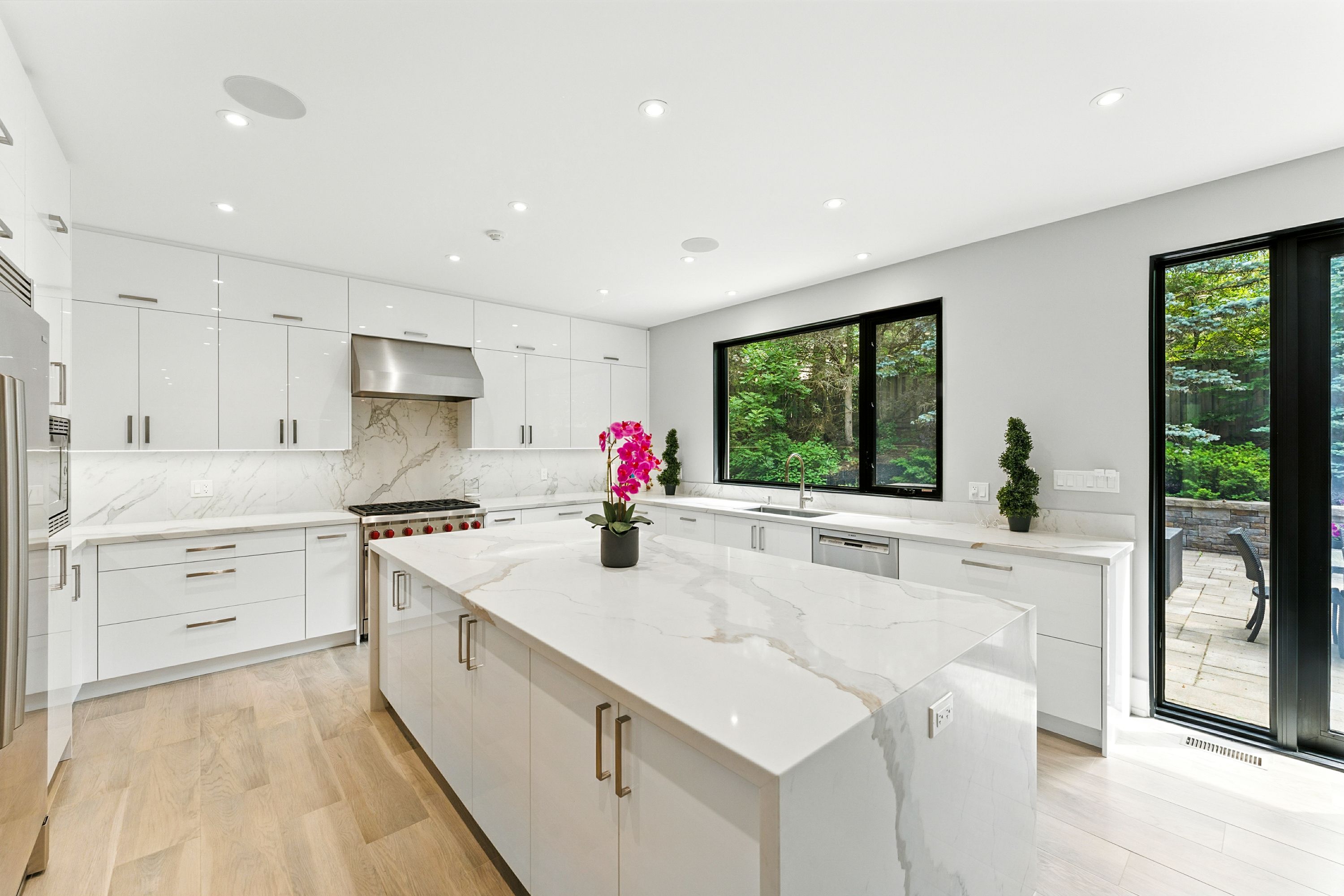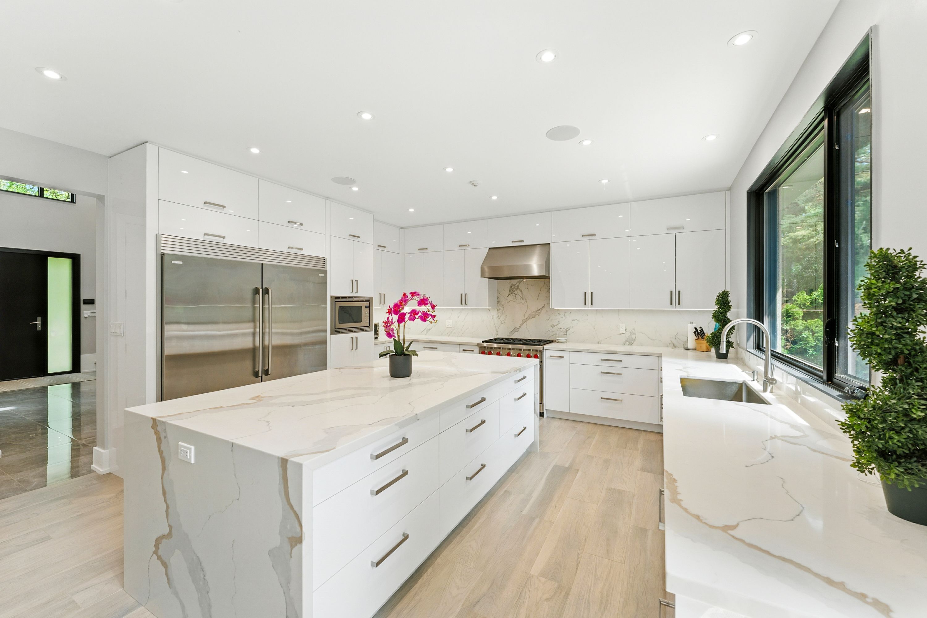 • Chef's kitchen with premium appliances and a large waterfall quartz island.