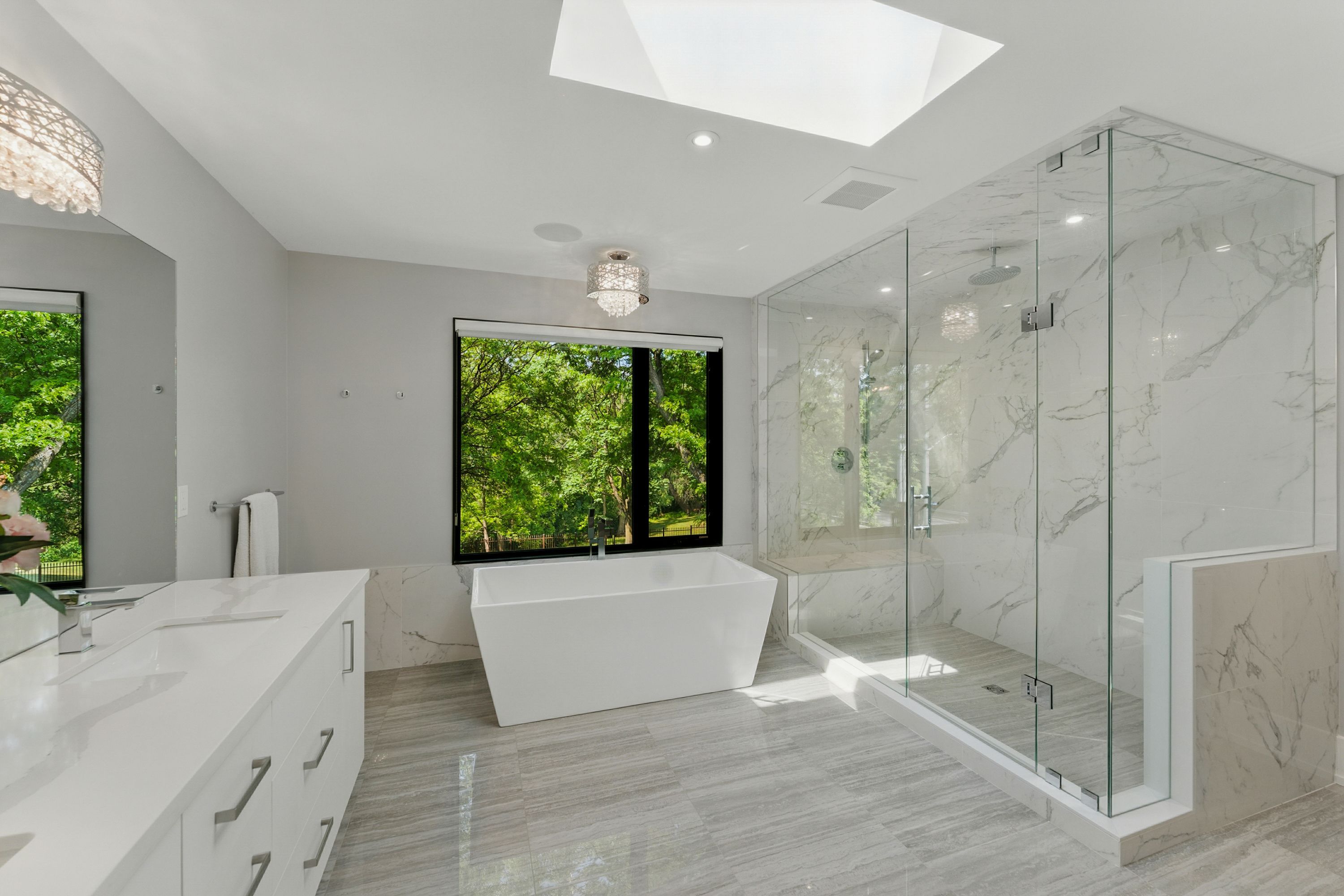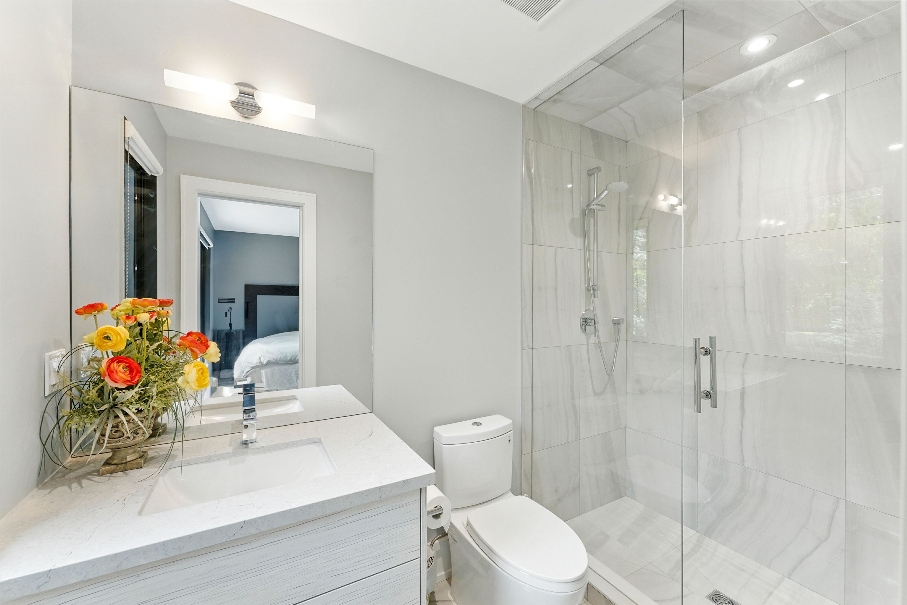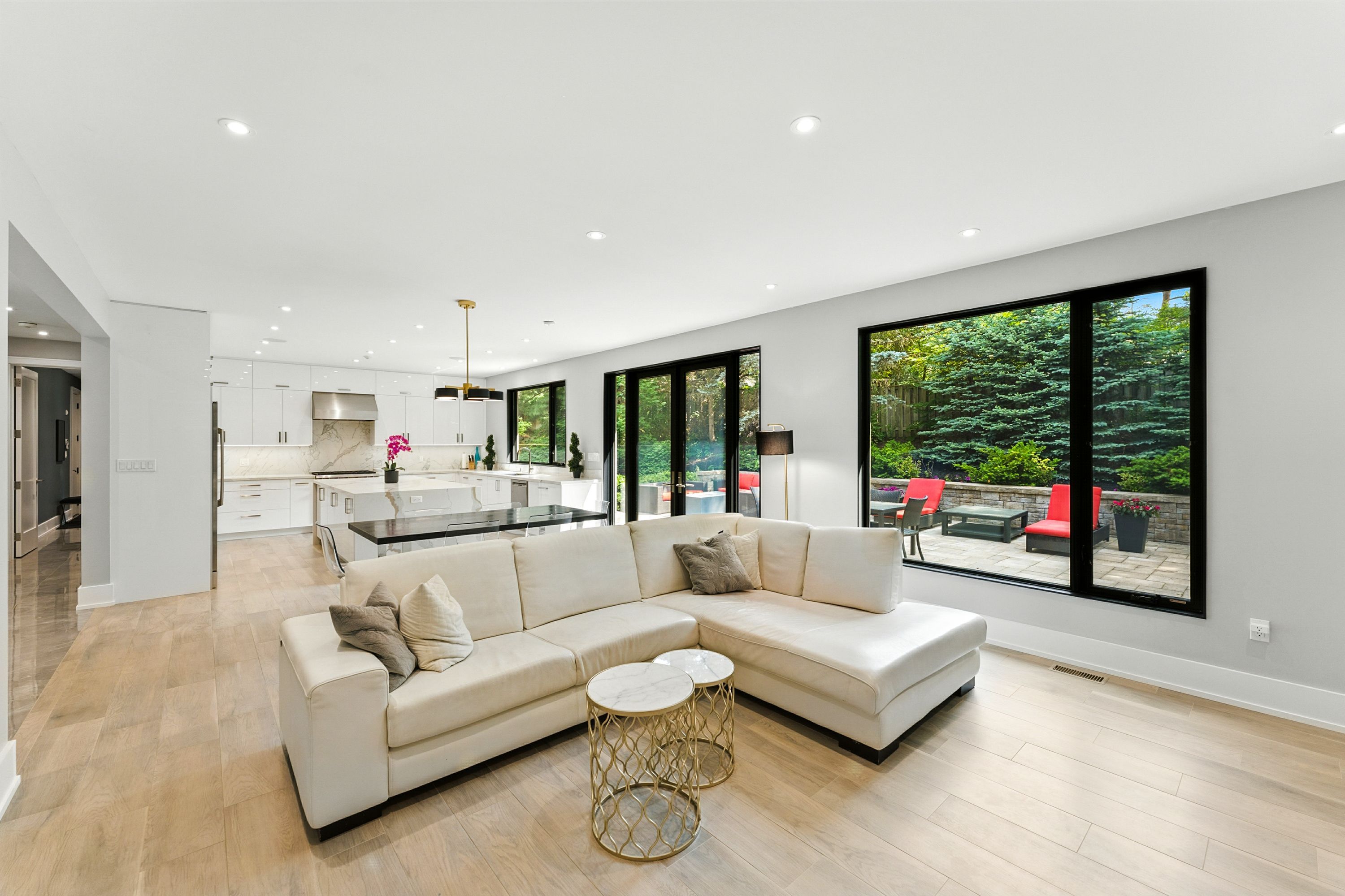• Chef's kitchen with premium appliances and a large waterfall quartz island.
