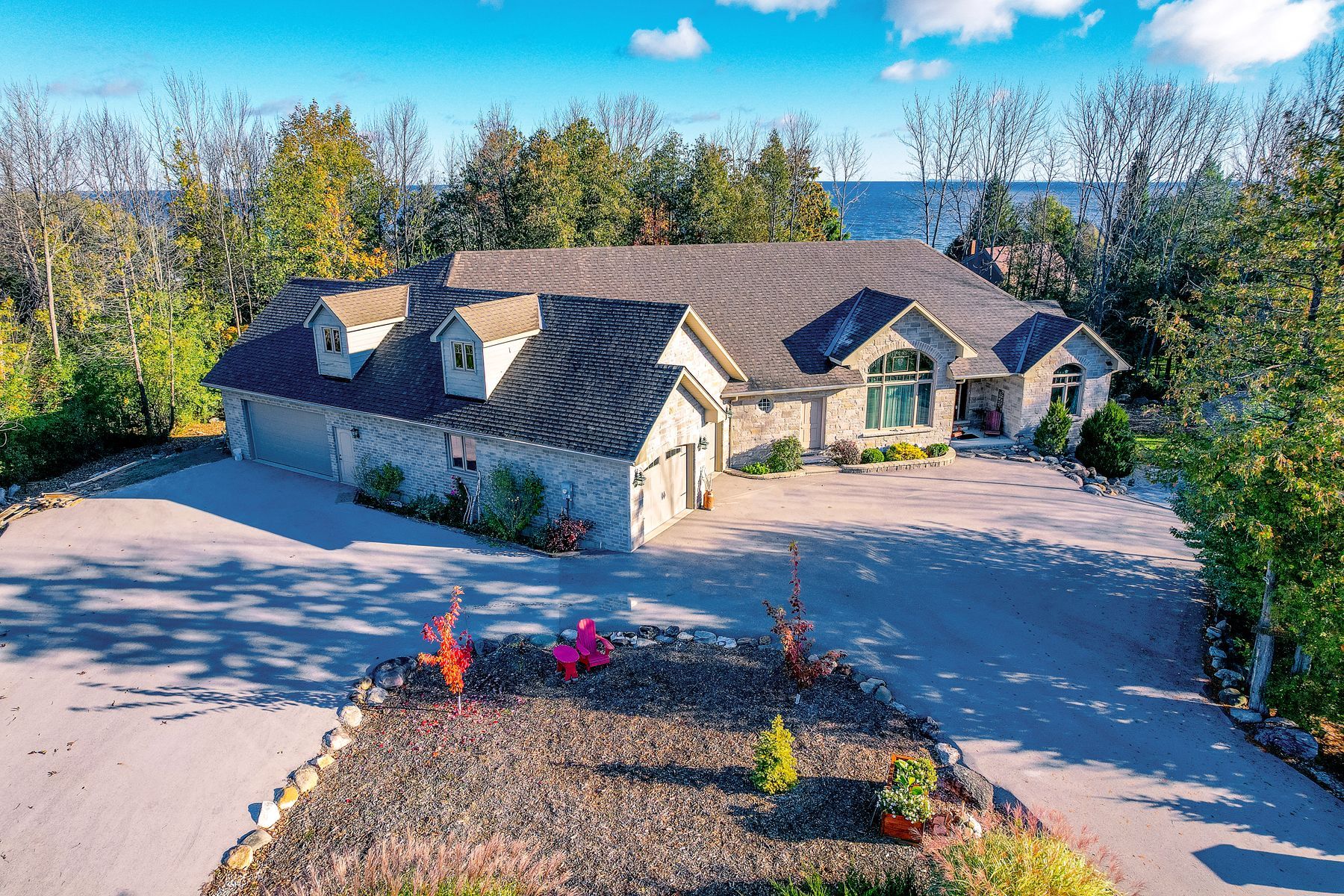 • Private backyard with stone patio and fire pits, surrounded by mature trees.