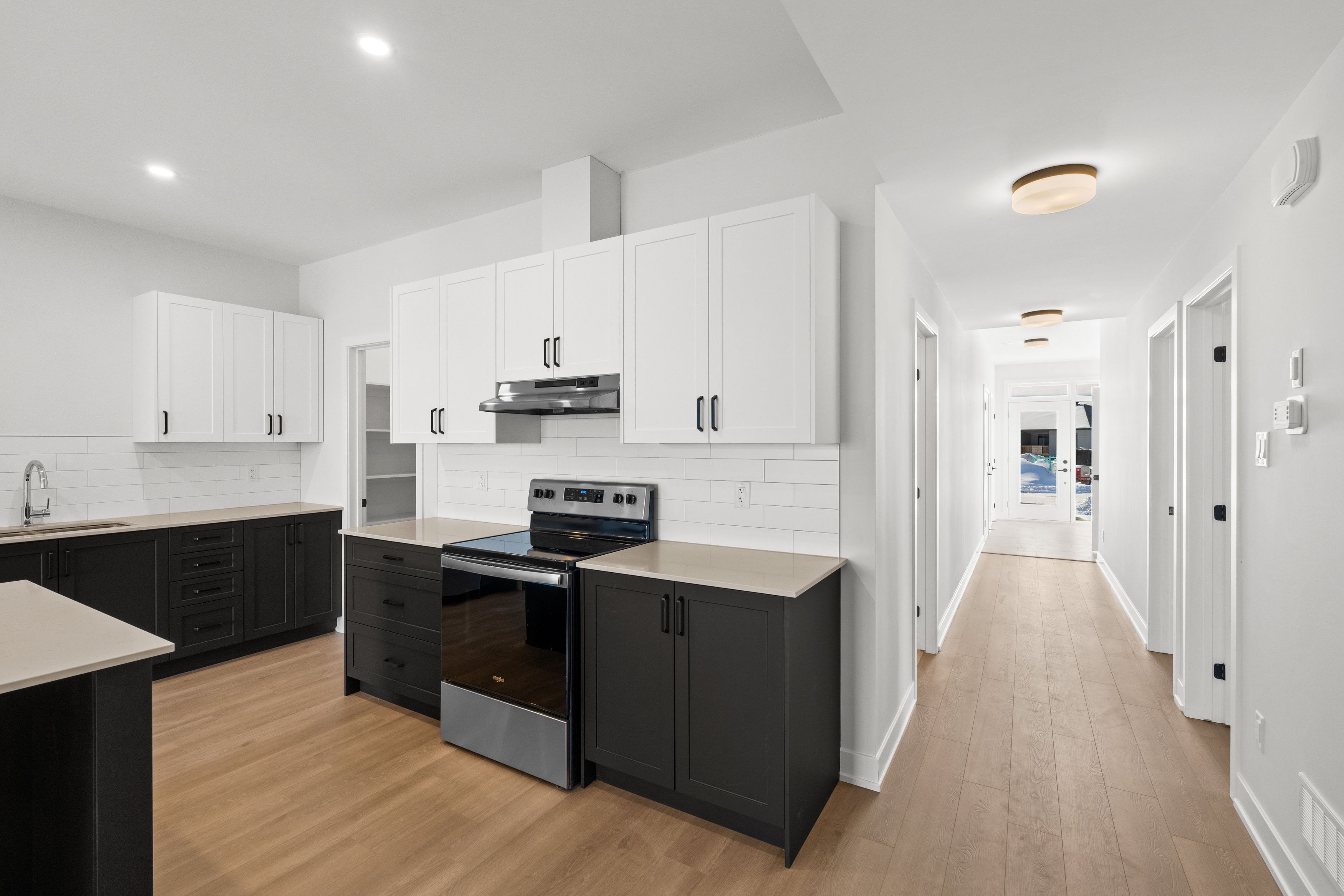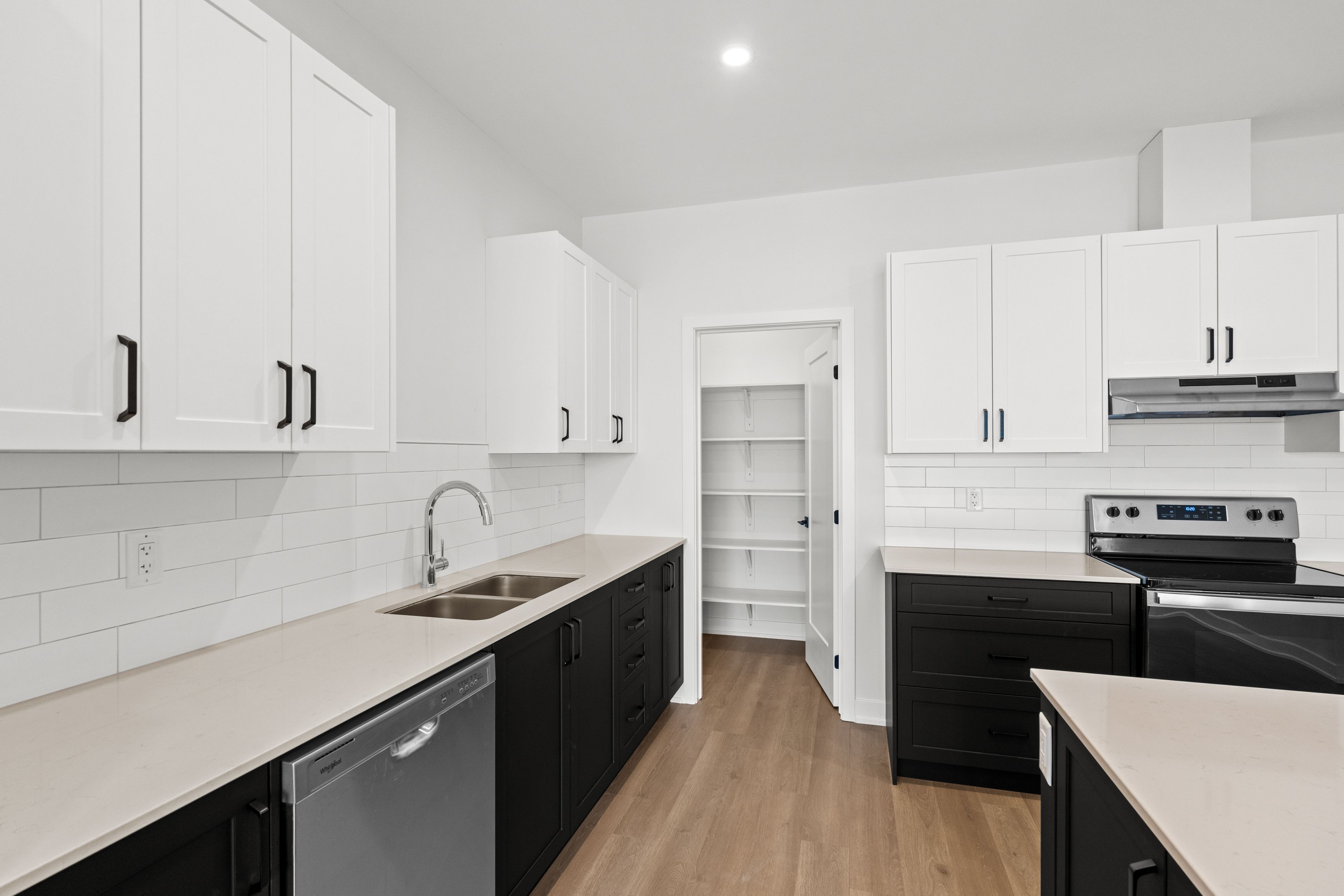 • Contemporary kitchen features quartz counters and ample storage.