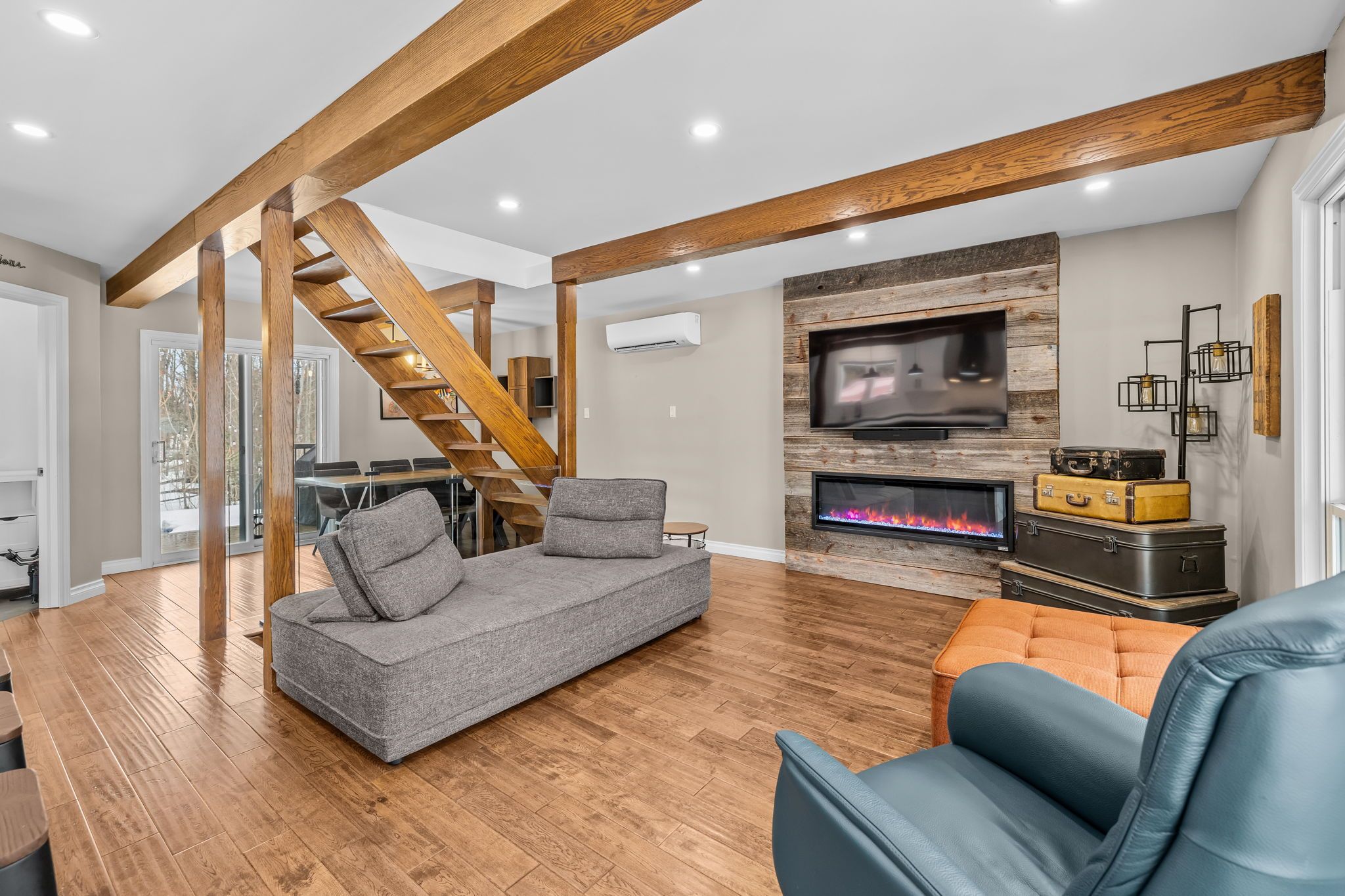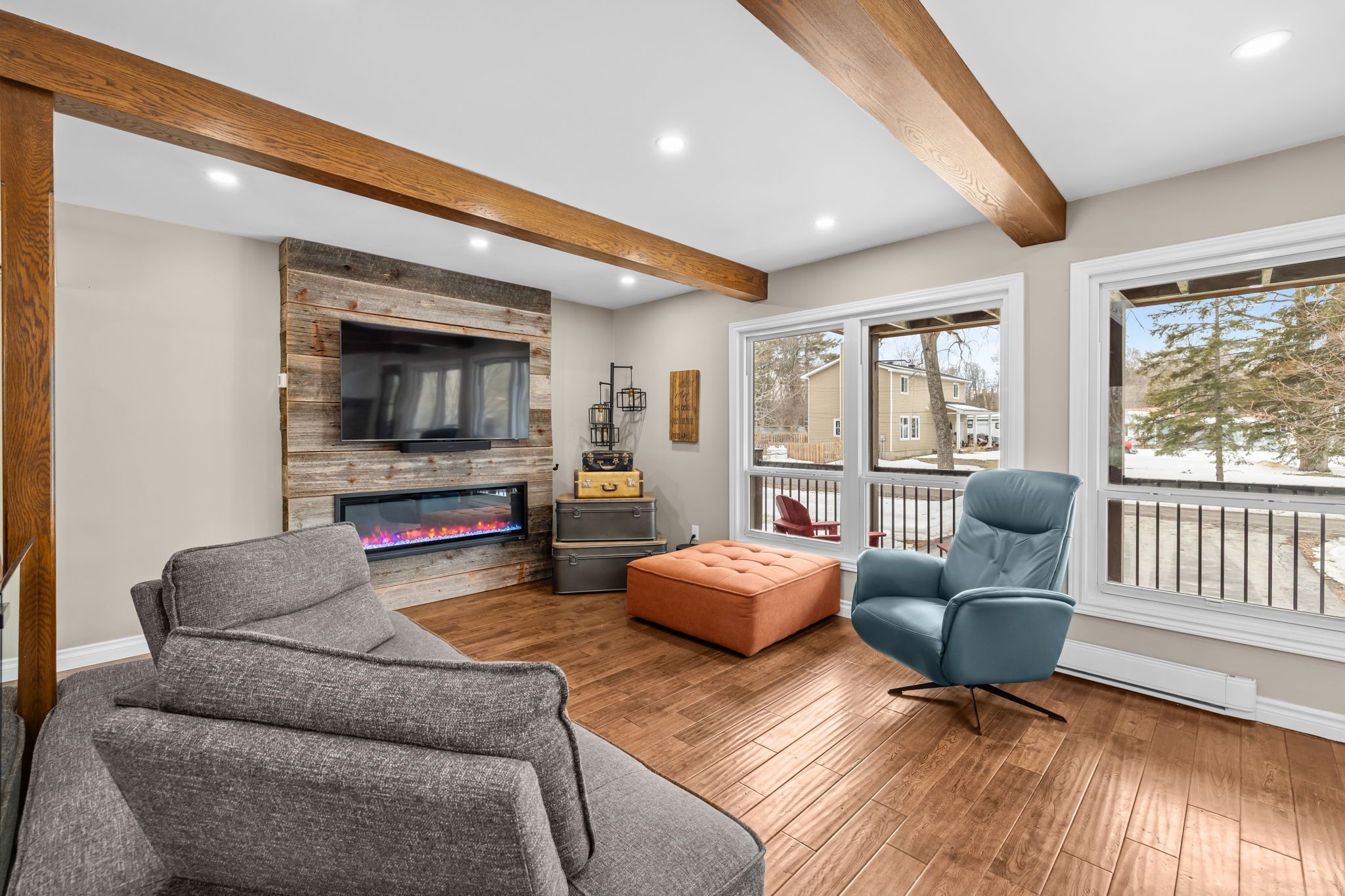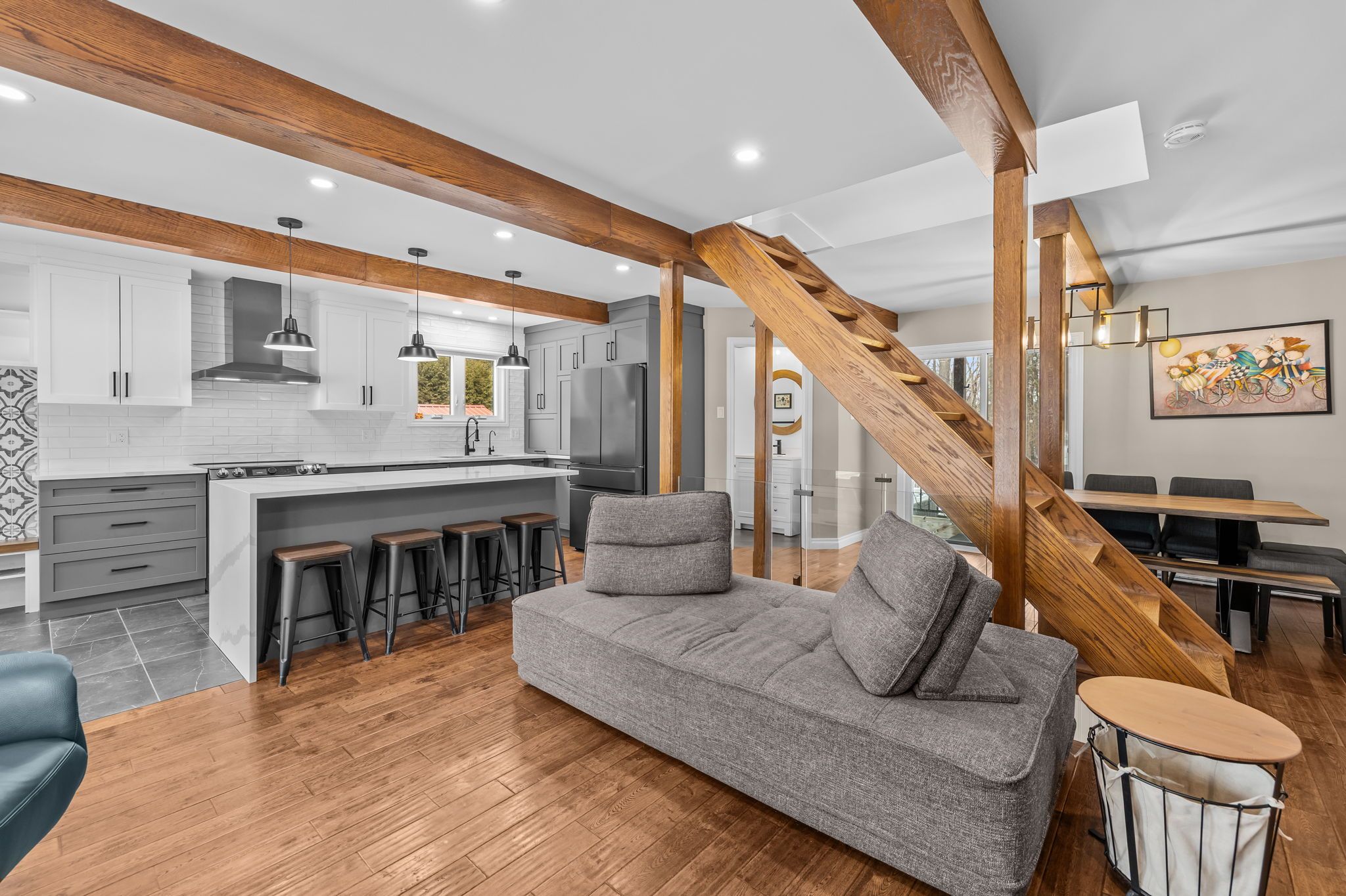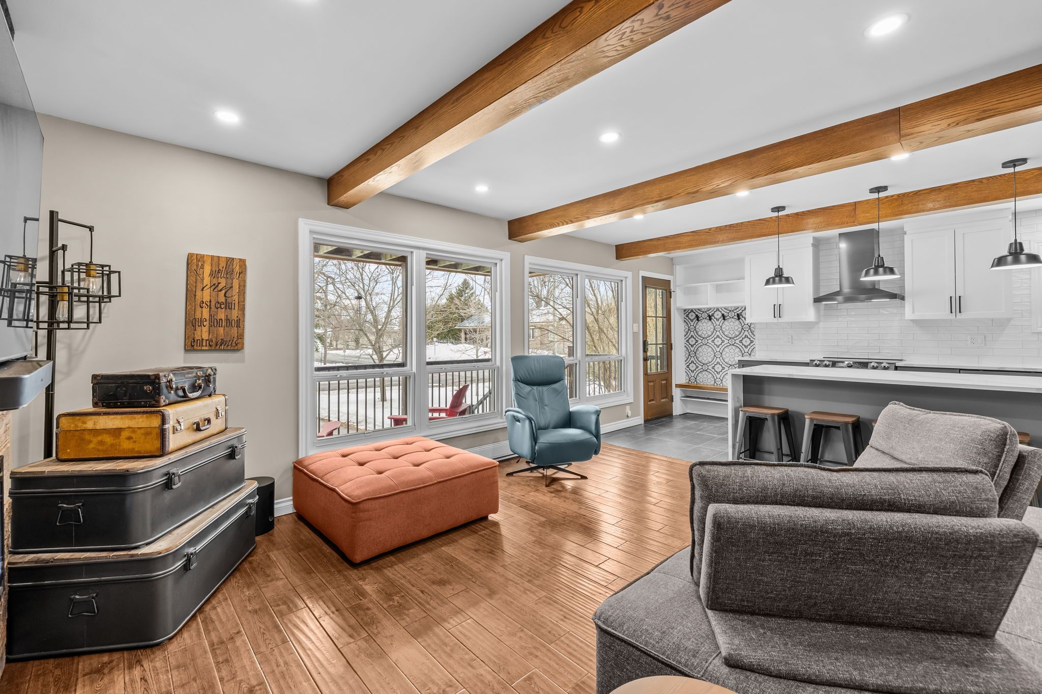 • Bright open-concept living space with large windows and natural light.