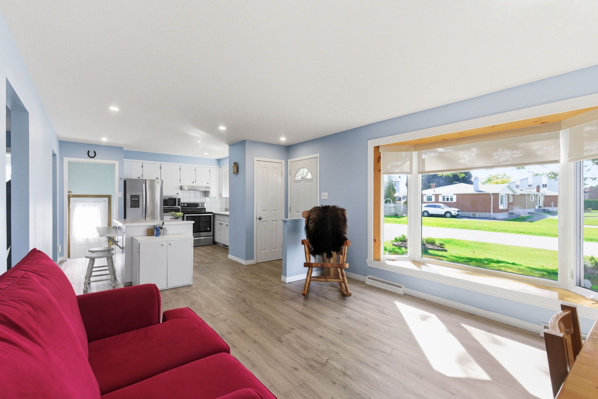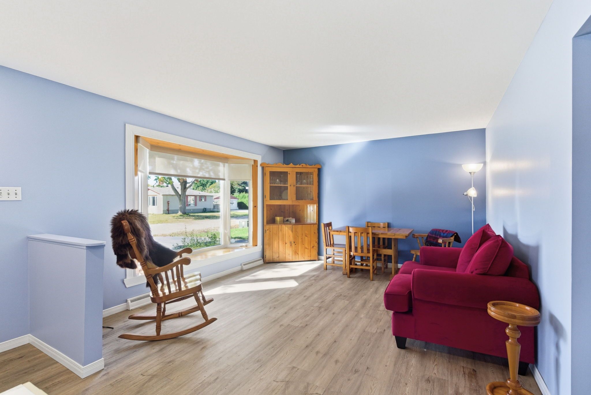 • Bright living room featuring a bay window and luxury vinyl flooring.