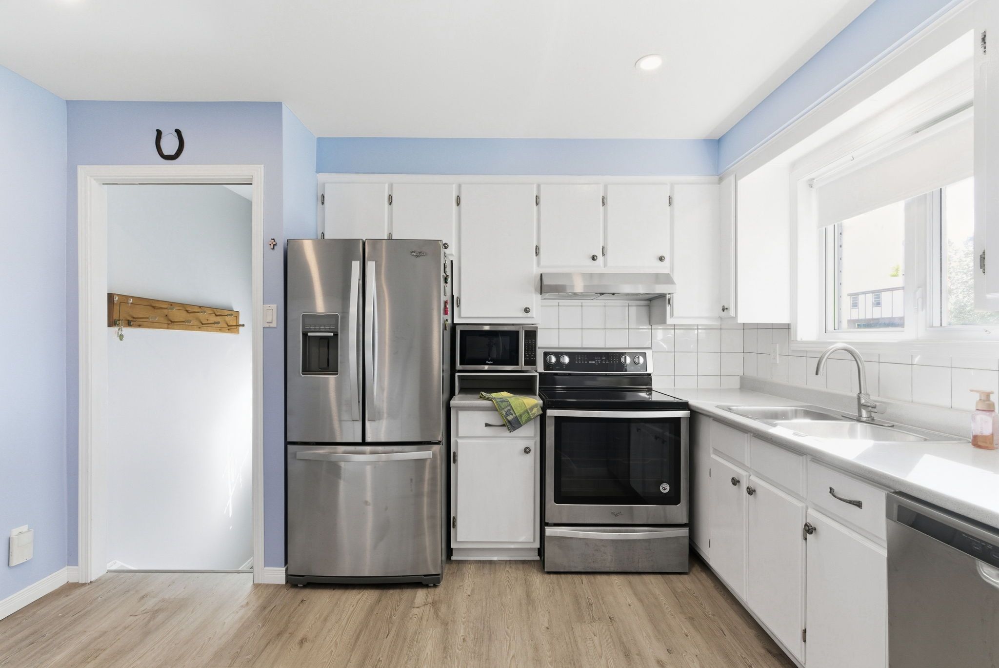 • Open-concept kitchen with a unique triangular island and breakfast bar.