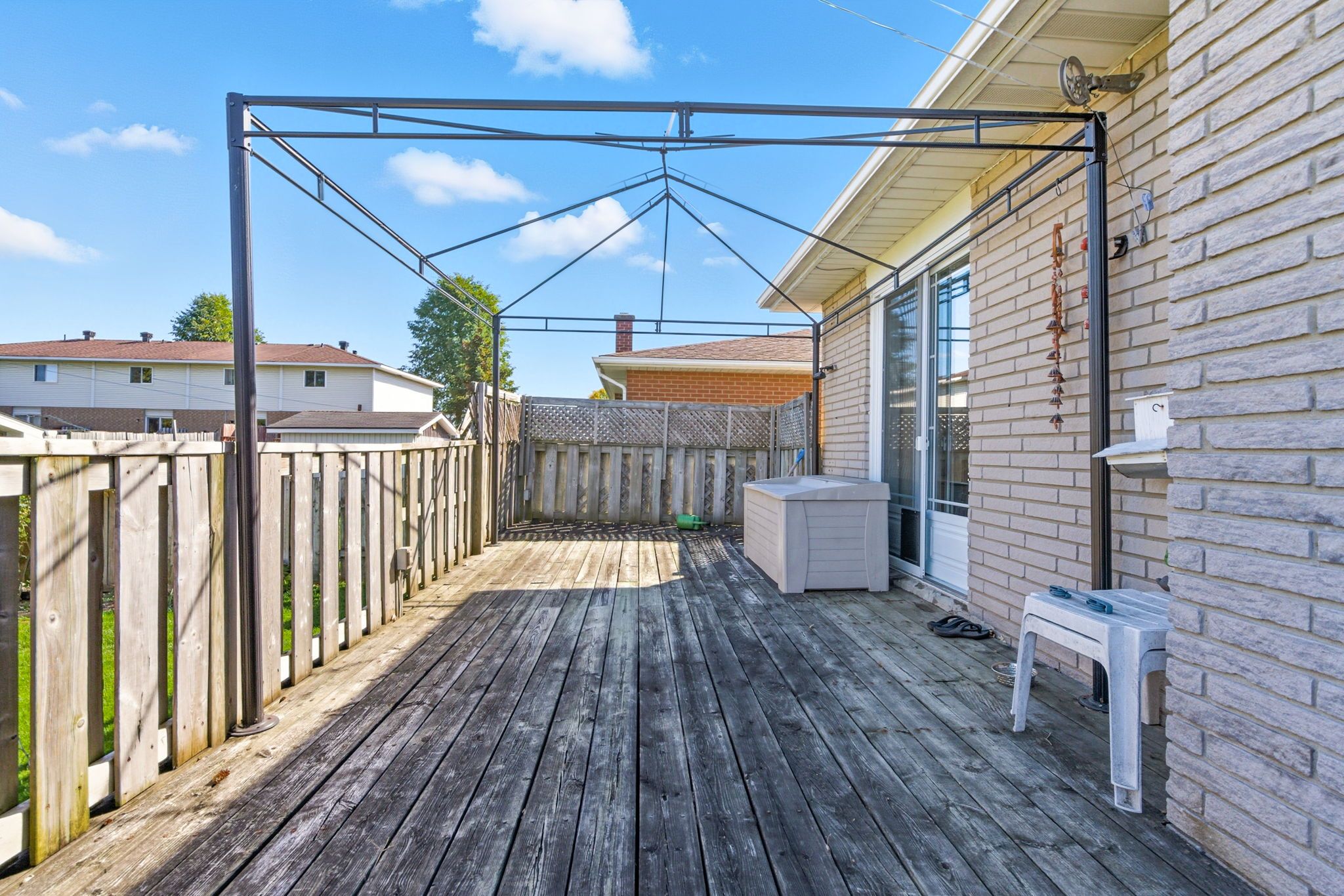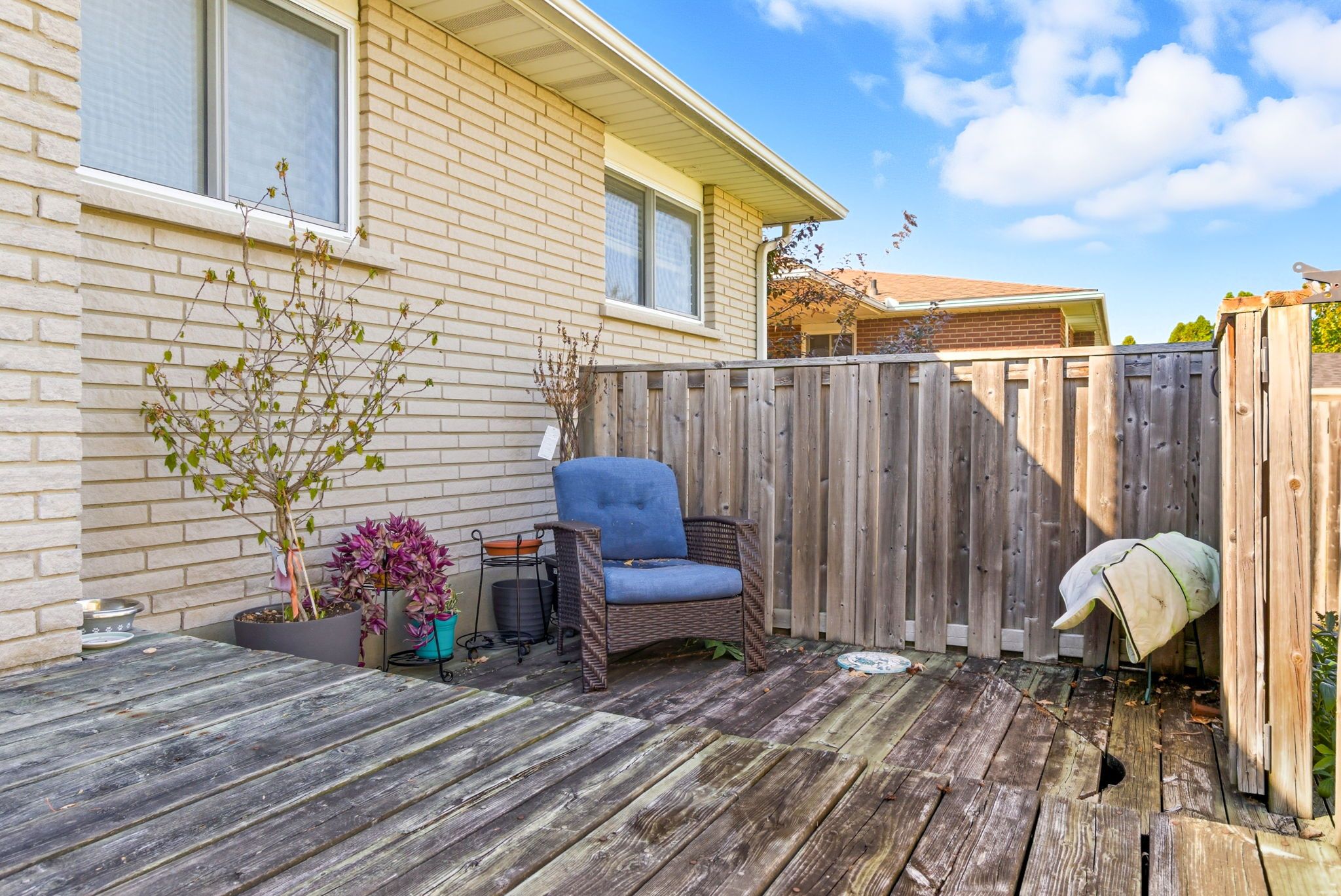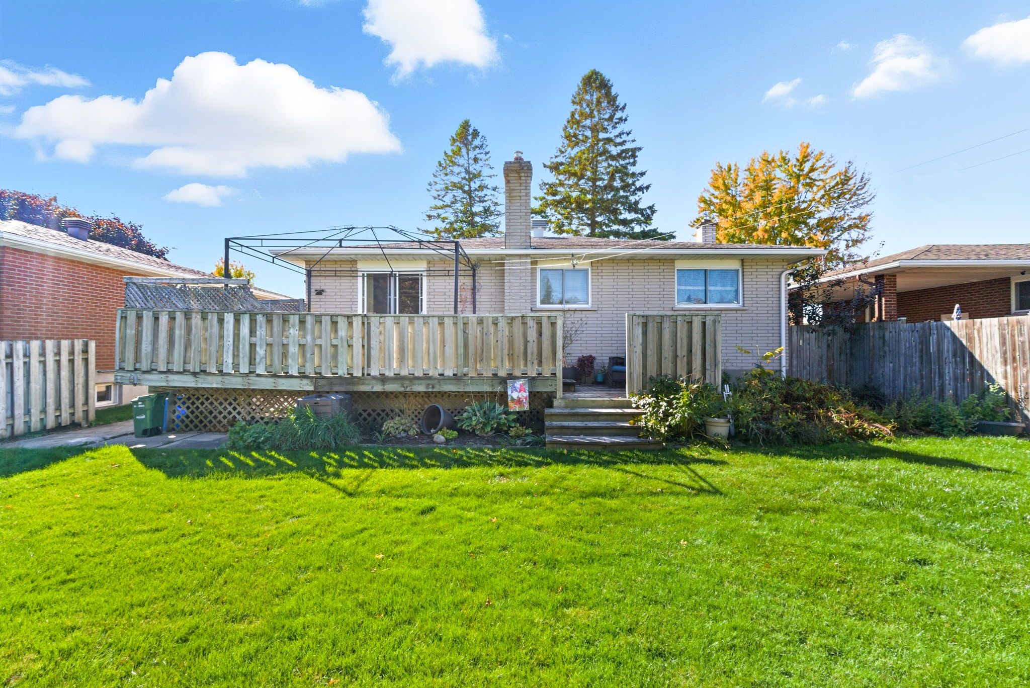 • All brick bungalow with three bedrooms and a raised two-tier deck.