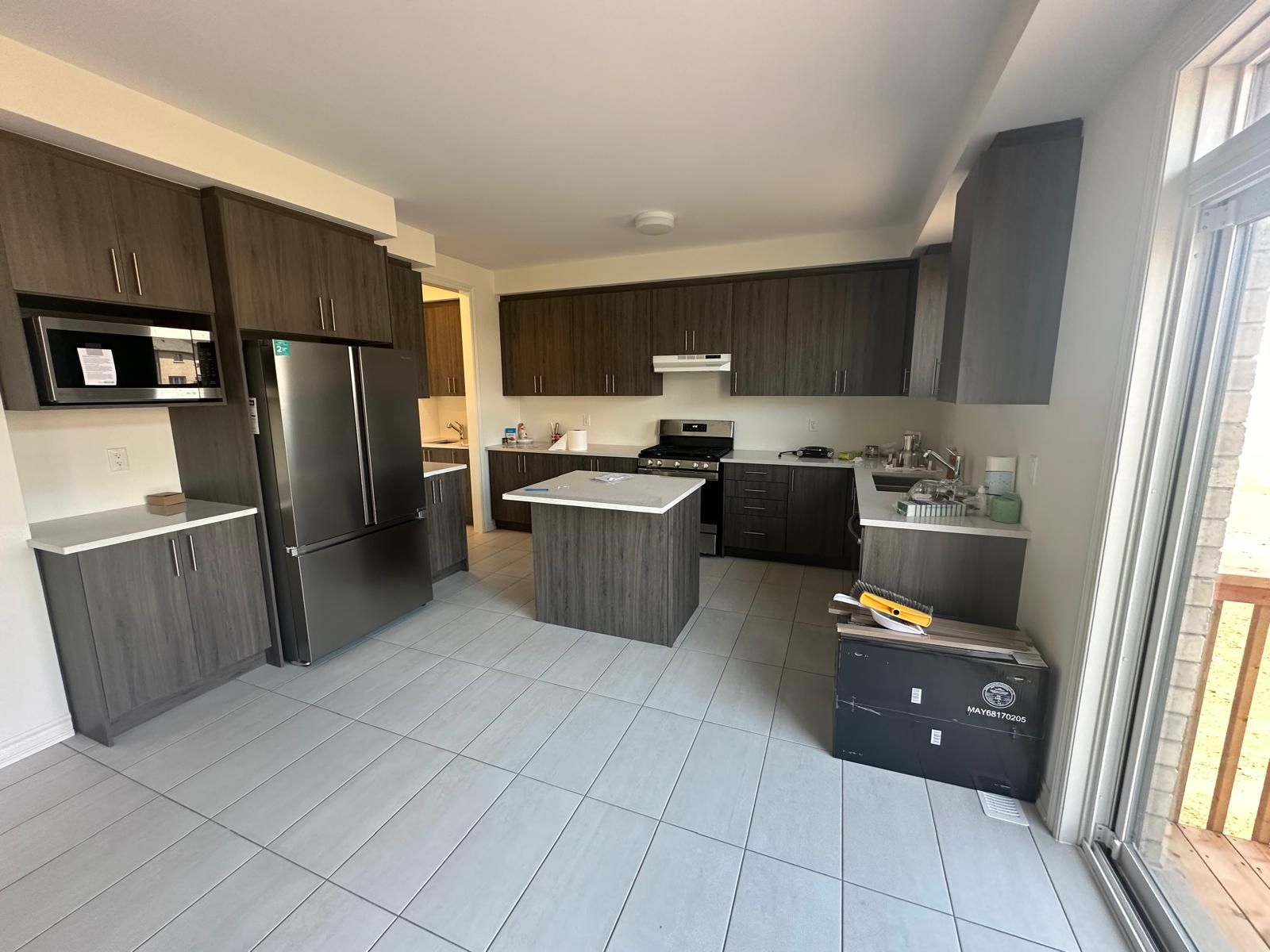 • Modern kitchen featuring granite countertops and deck access.