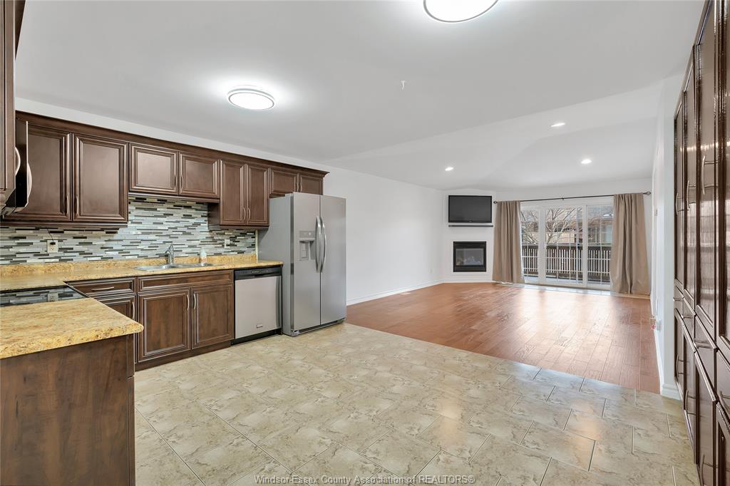 • Open kitchen with extra cabinets and a gas fireplace for comfort.