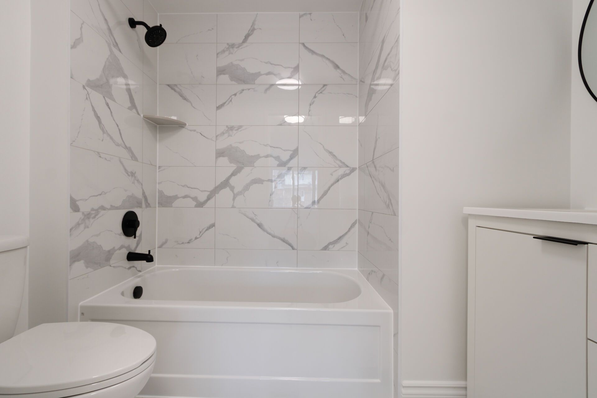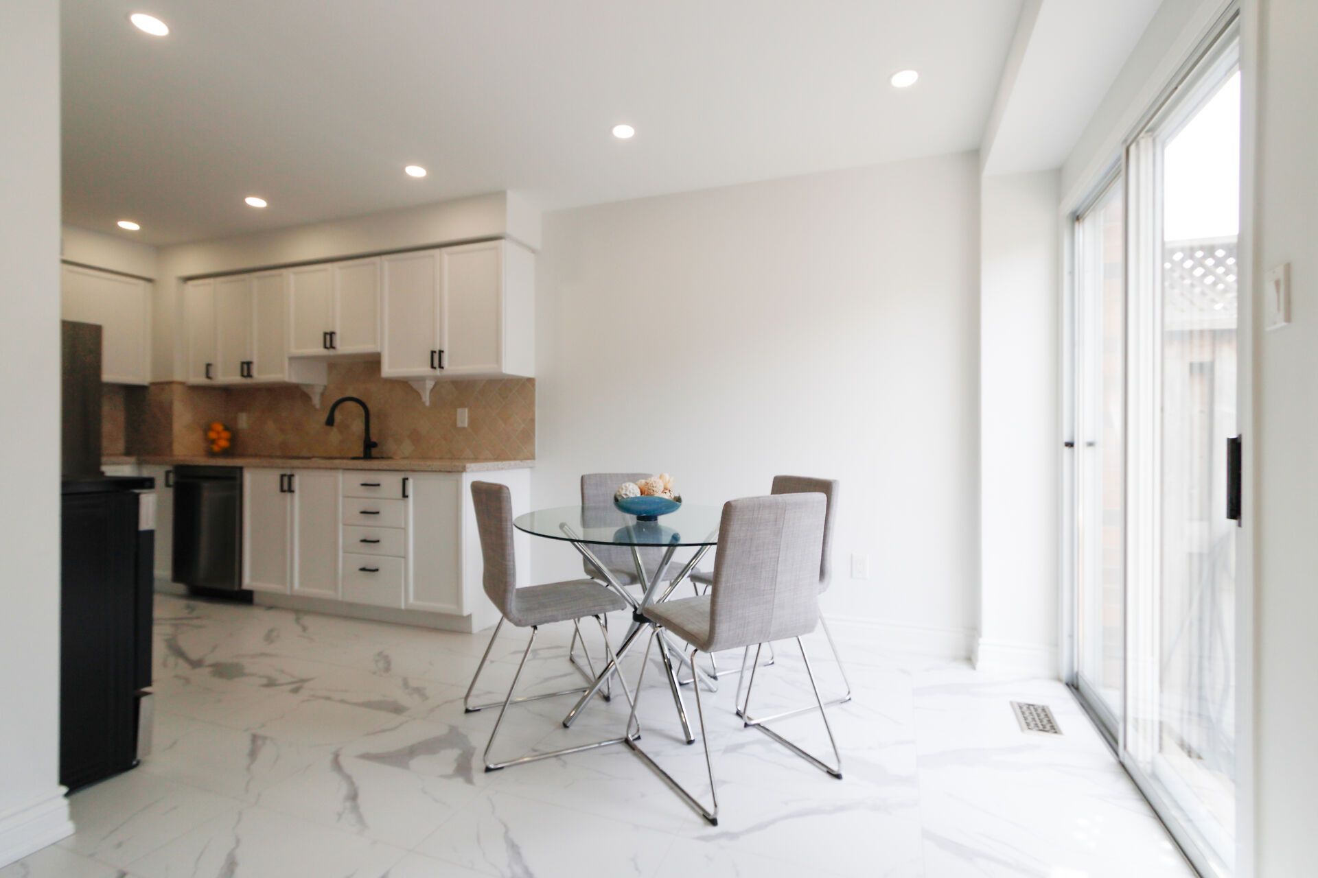 • Modern eat-in kitchen with quartz countertops and new appliances.