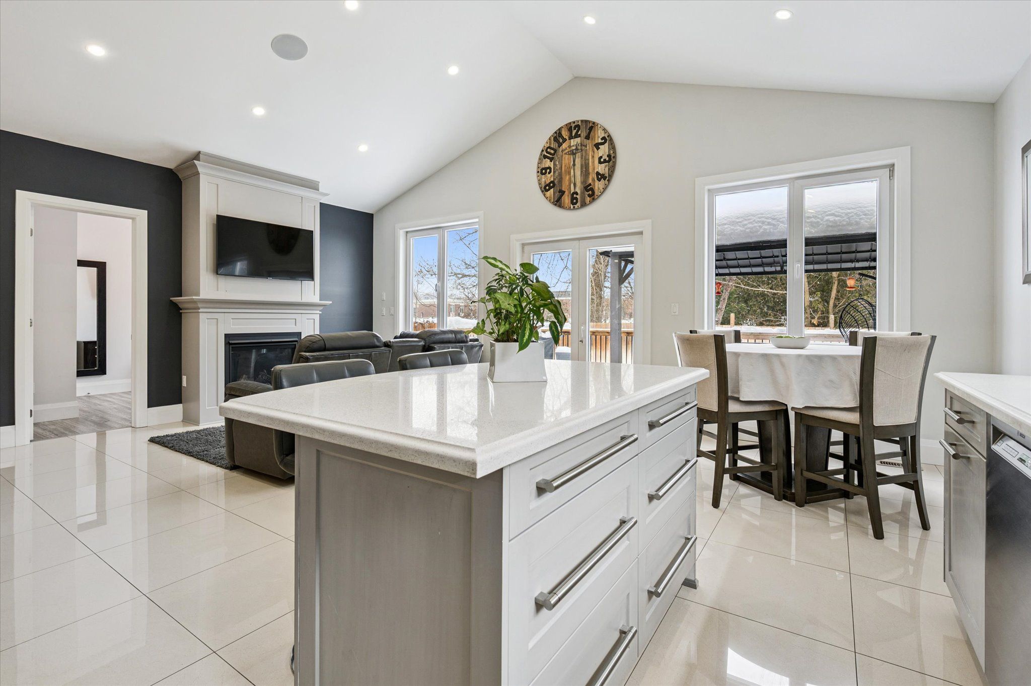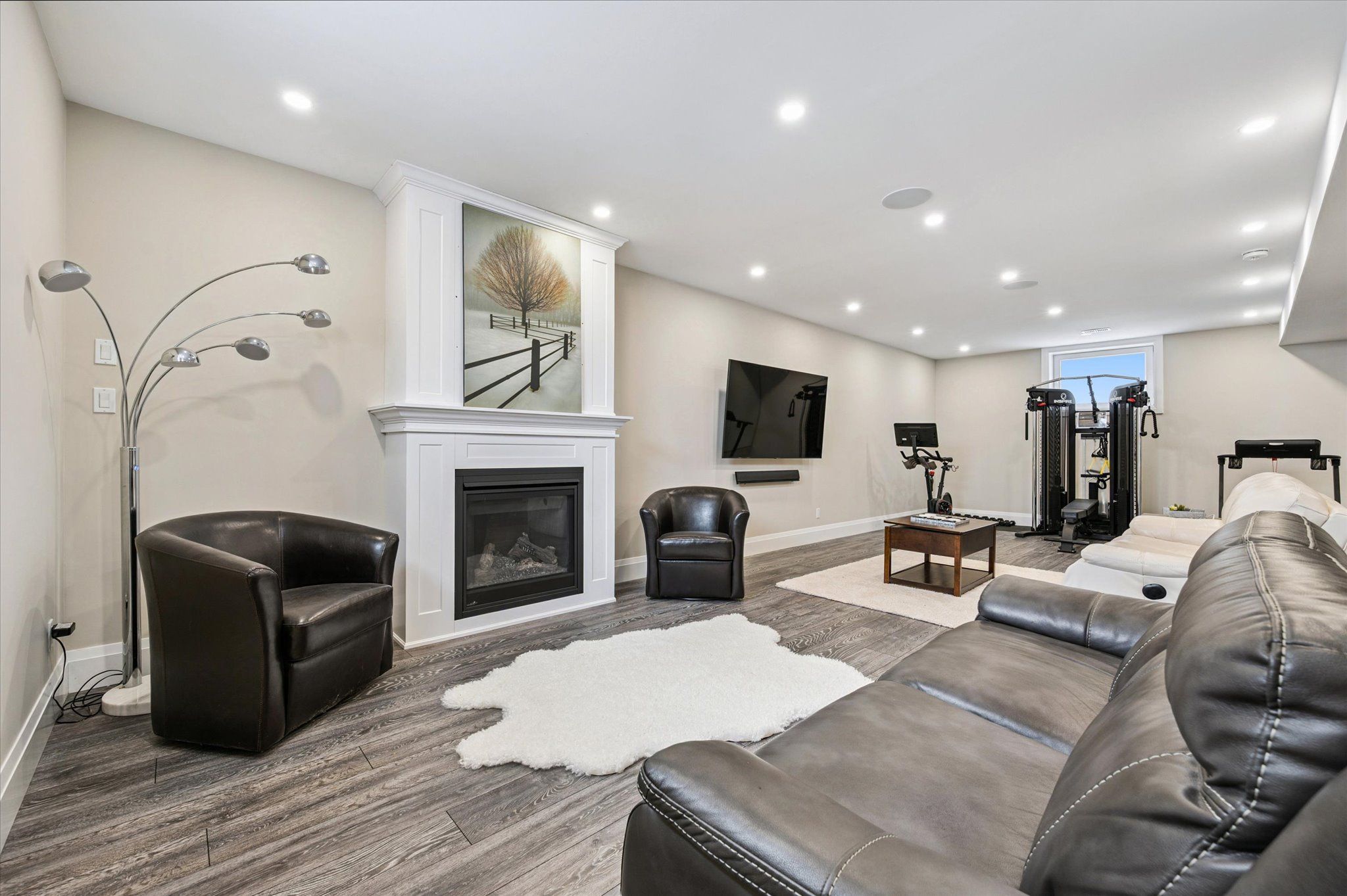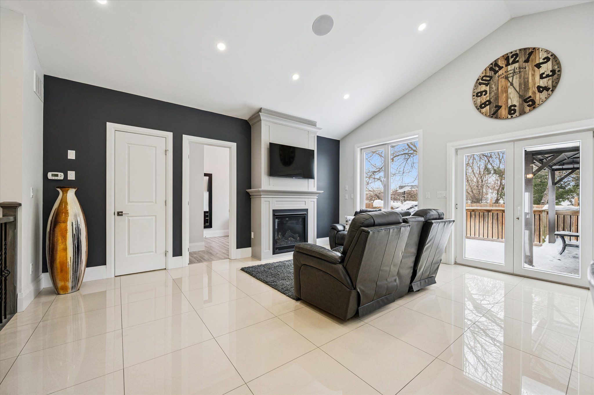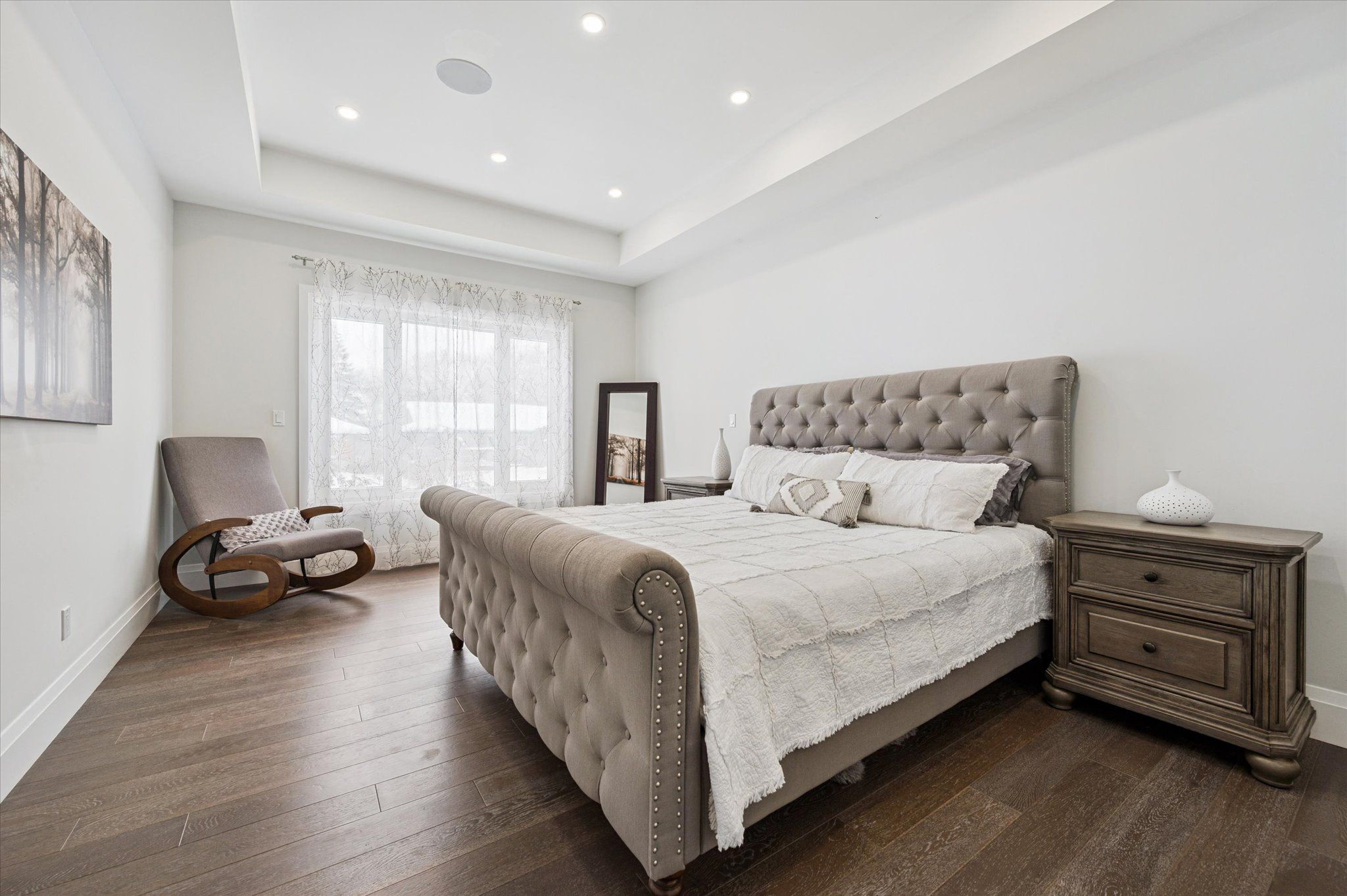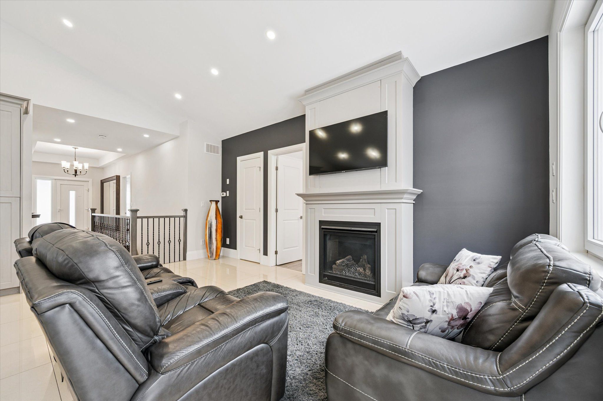 Welcome home, where luxury feels effortless and every detail has been crafted for you with care. Built with the precision and finishes a builder would choose for their own family, this 3-bedroom, 3-bath residence blends elevated design with genuine comfort, creating a space that simply feels wonderful to live in. The sophisticated entry door makes a striking first impression-beautiful, secure, and a preview of the quality inside. Step into a space with soaring ceilings, warm heated flooring throughout the main floor, and a layout designed for both everyday ease and memorable gatherings. The primary suite is a true retreat with a coffered ceiling, organized walk-in closet, and a spa-inspired ensuite with double vanity and glass walk-in shower. Natural light pours through expansive rear windows and french doors, framing peaceful backyard views. Automated exterior shutters offer blackout comfort, enhanced security, sound reduction, and notable energy savings-ideal for quiet mornings or deep, restful sleep. The kitchen blends style and function with upgraded cabinetry, quartz countertops, premium appliances, and a generous island perfect for cooking and entertaining. Two elegant gas fireplaces add warmth and ambiance, while a russound whole-home audio system with four zones sets the mood throughout. The fully finished lower level extends your living space with 9' ceilings, a spacious recreation room, full bathroom, and heated hydronic flooring. Outside, the backyard feels like a private escape: lush landscaping maintained by a rainbird irrigation system, open greenspace beside the home-used only weekday business hours - quiet on evenings, weekends and summer. Close to the 401, scenic trails, excellent schools, and shopping, this location offers both convenience and calm. With parking for five, a concrete driveway, inside-entry garage, and a move-in-ready presentation, this exceptional home invites you to simply move in and start living!