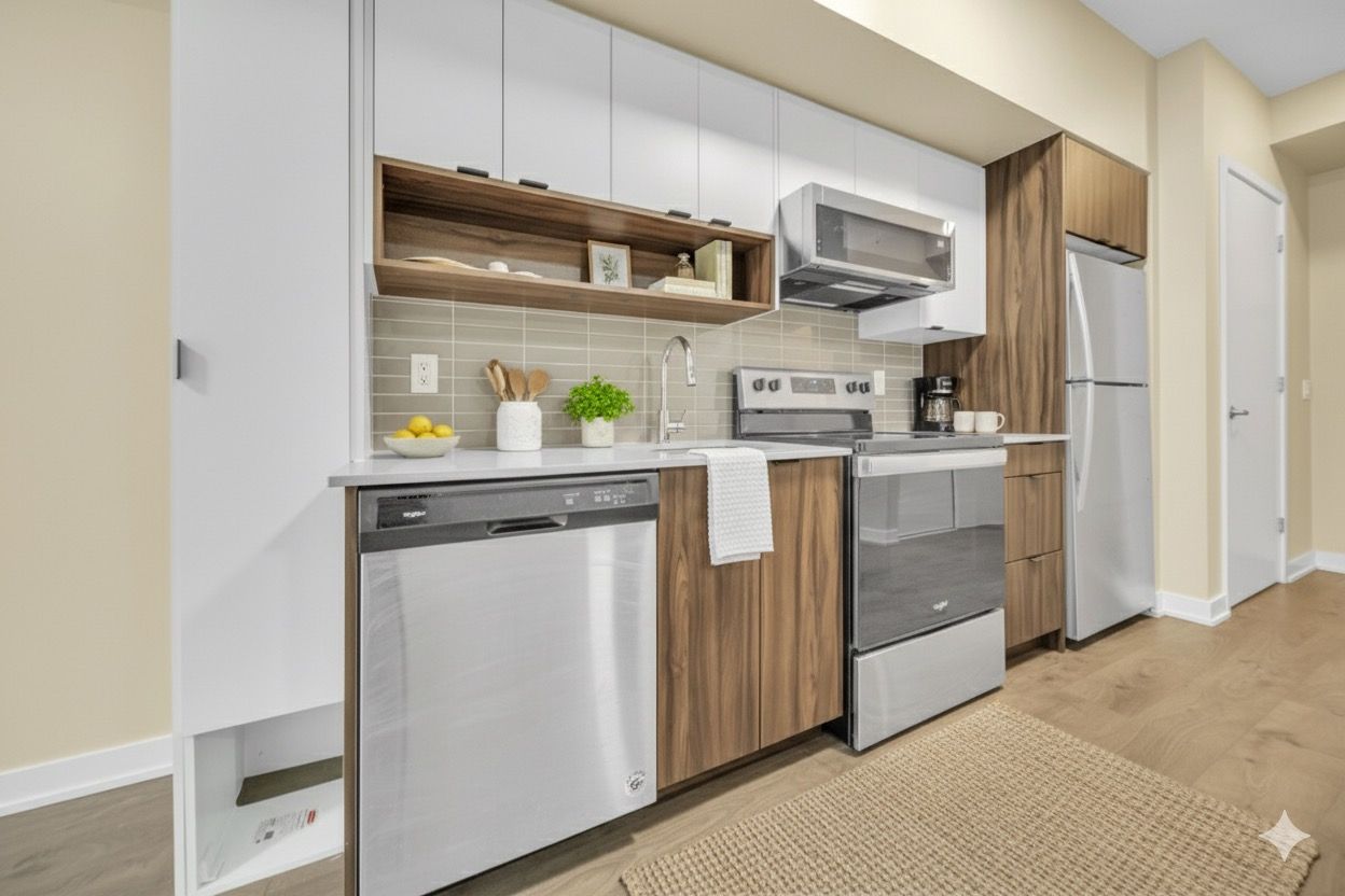• Open-concept layout featuring full-sized stainless-steel appliances for effortless cooking.