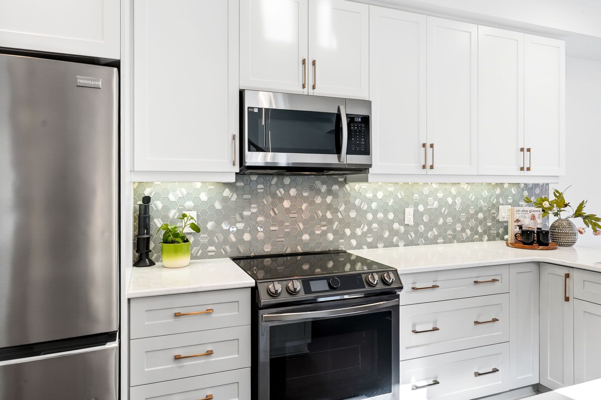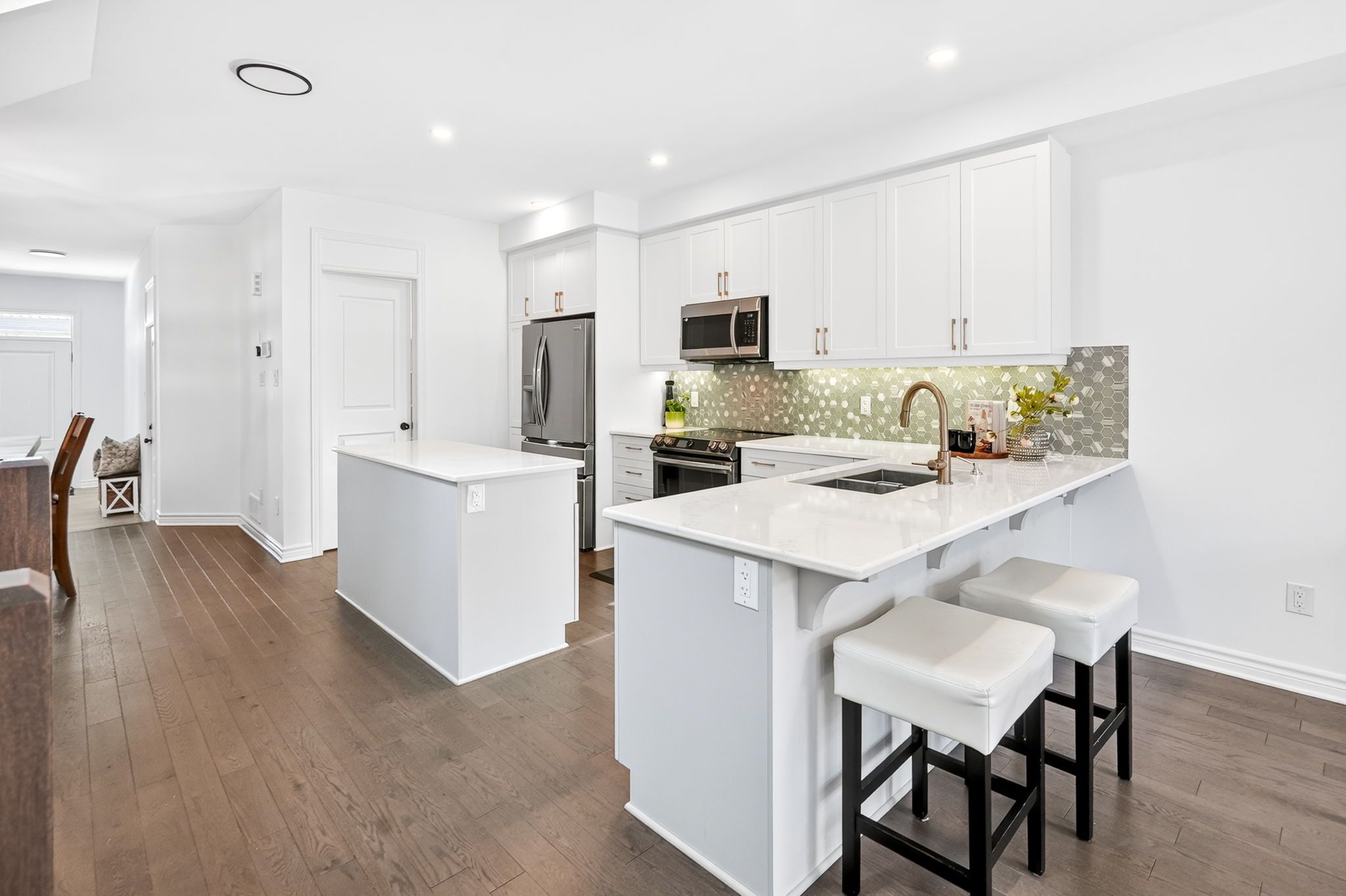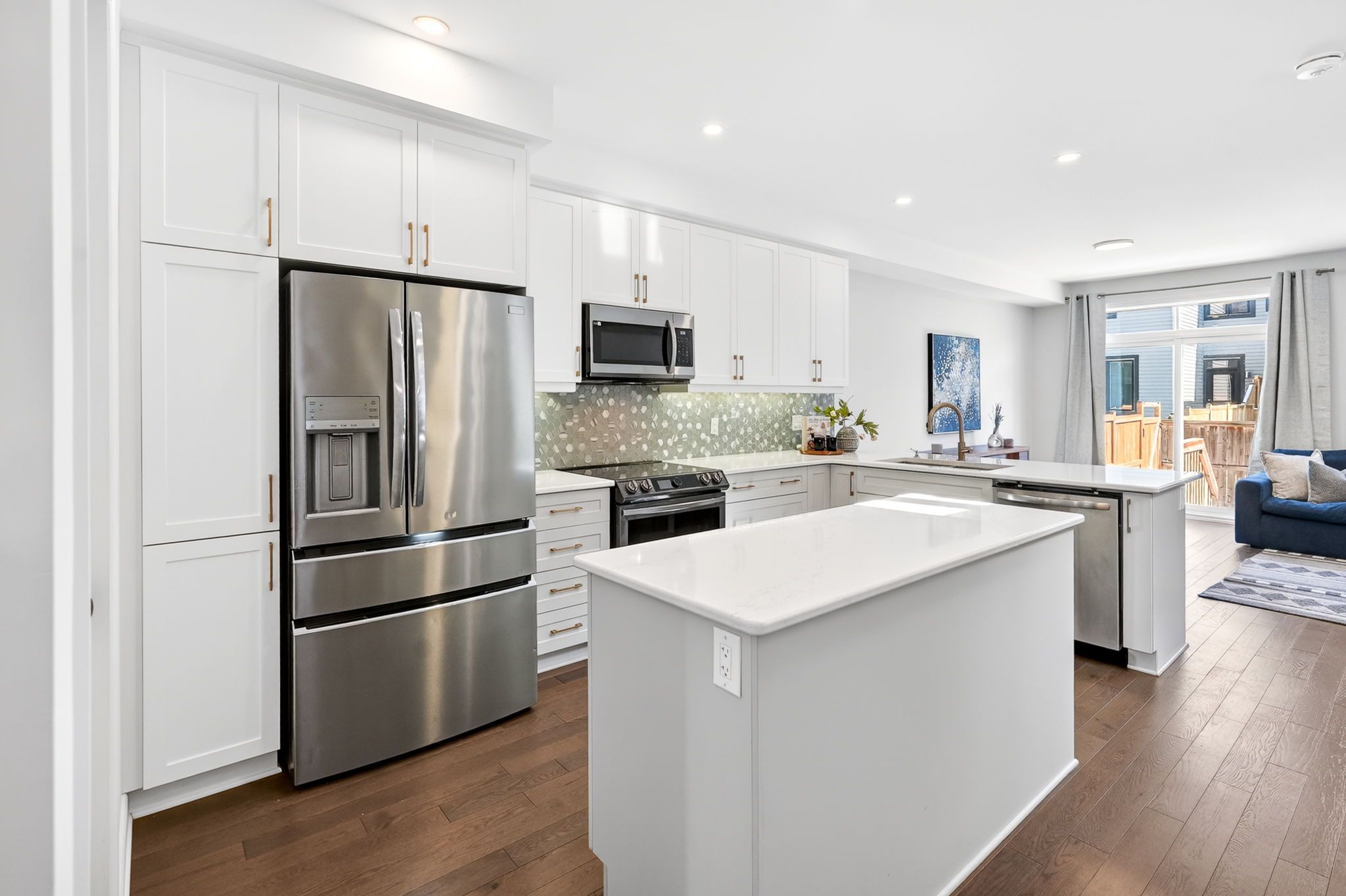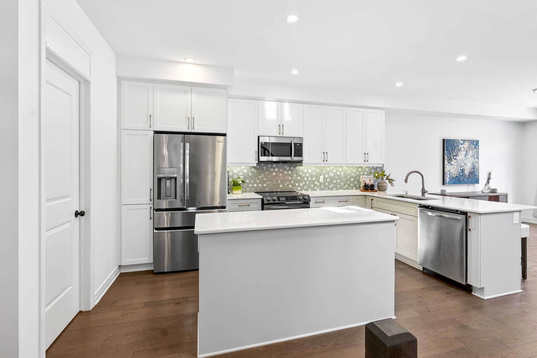 • Stylish upgraded kitchen with stainless steel appliances and large island.