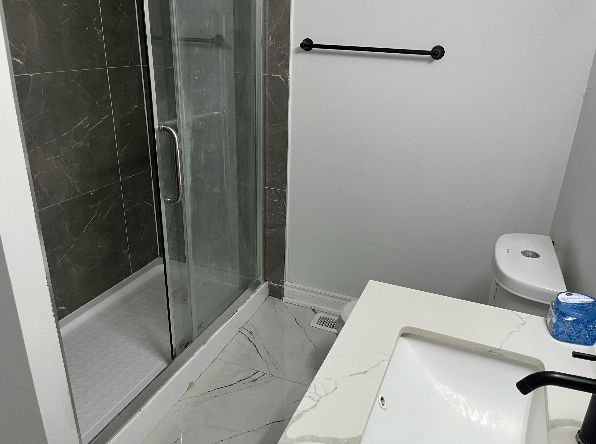 • Modern kitchen features quartz countertop and stainless steel appliances.