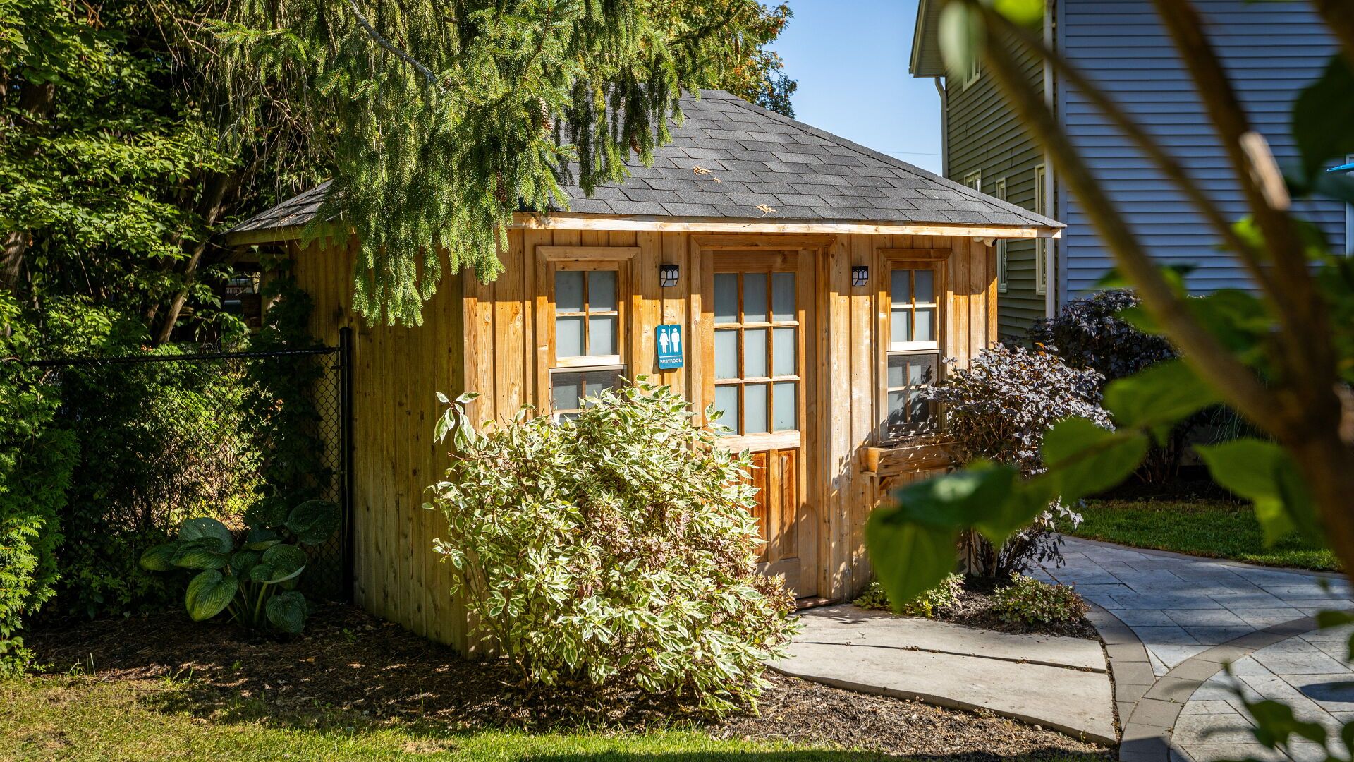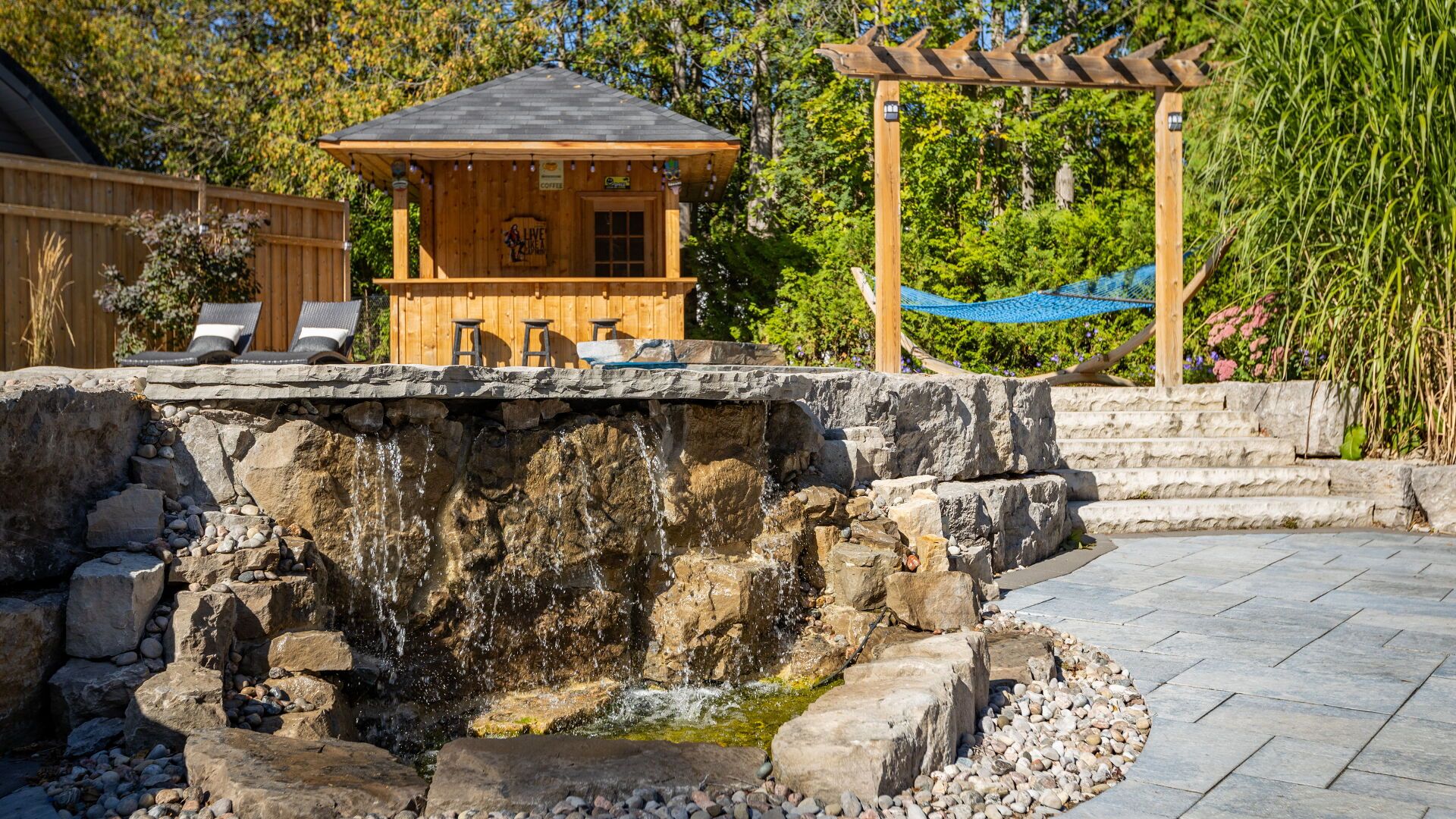 • Resort-style backyard with saltwater pool, hot tub, and tiki bar.