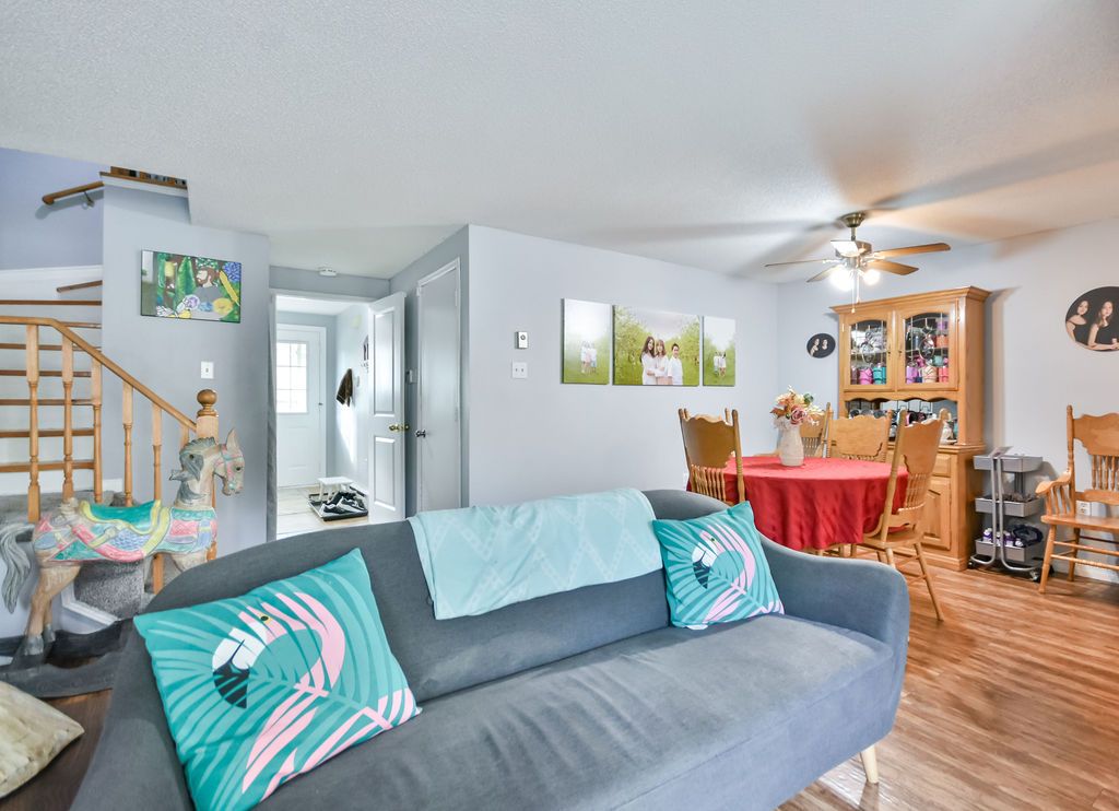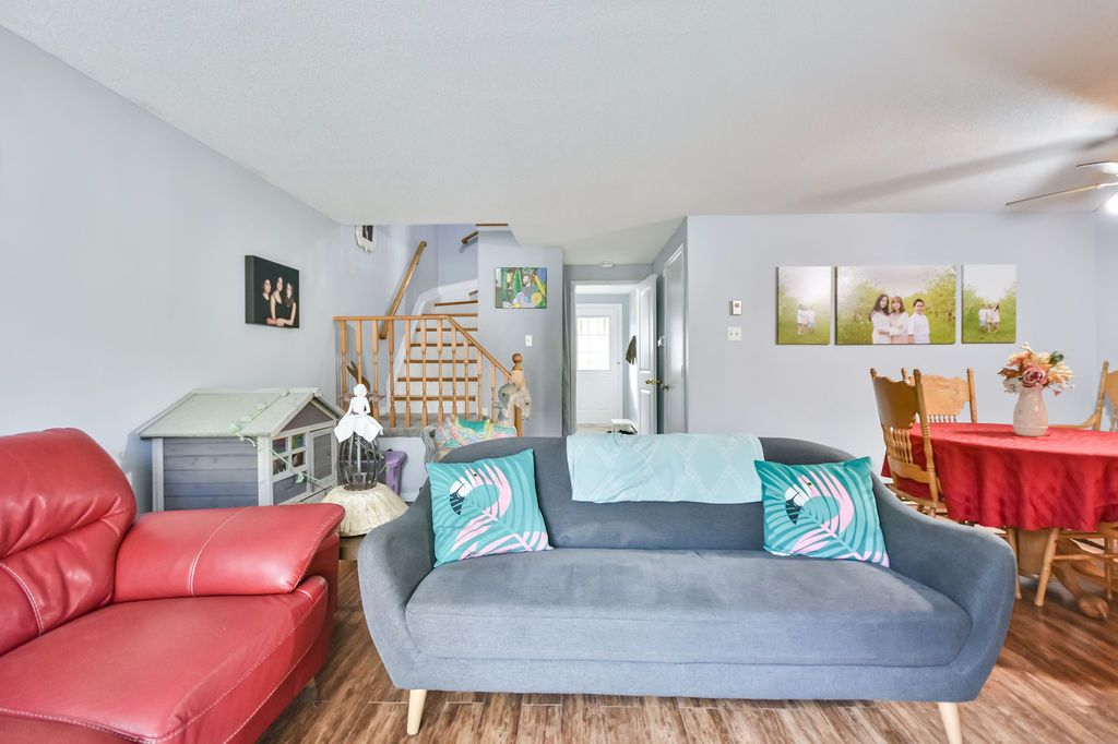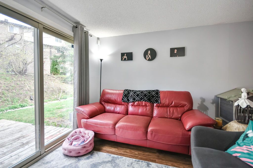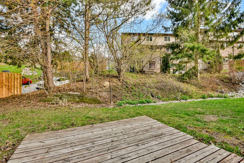 This open concept town home is ideal for first-time home buyers, investors or that busy professional who needs close and easy access to the highway. This home features inside garage entry, large sliding doors to your own deck space, lots of natural light, newly replaced kitchen, three-large bedrooms upstairs and a fourth bedroom and bathroom on the lower level with a great sized rec room. Just minutes to the go train and all amenities. Step out your front door and enjoy the short walk to the gym, outdoor pool, tennis and basketball court, etc. You won't want to miss this one!