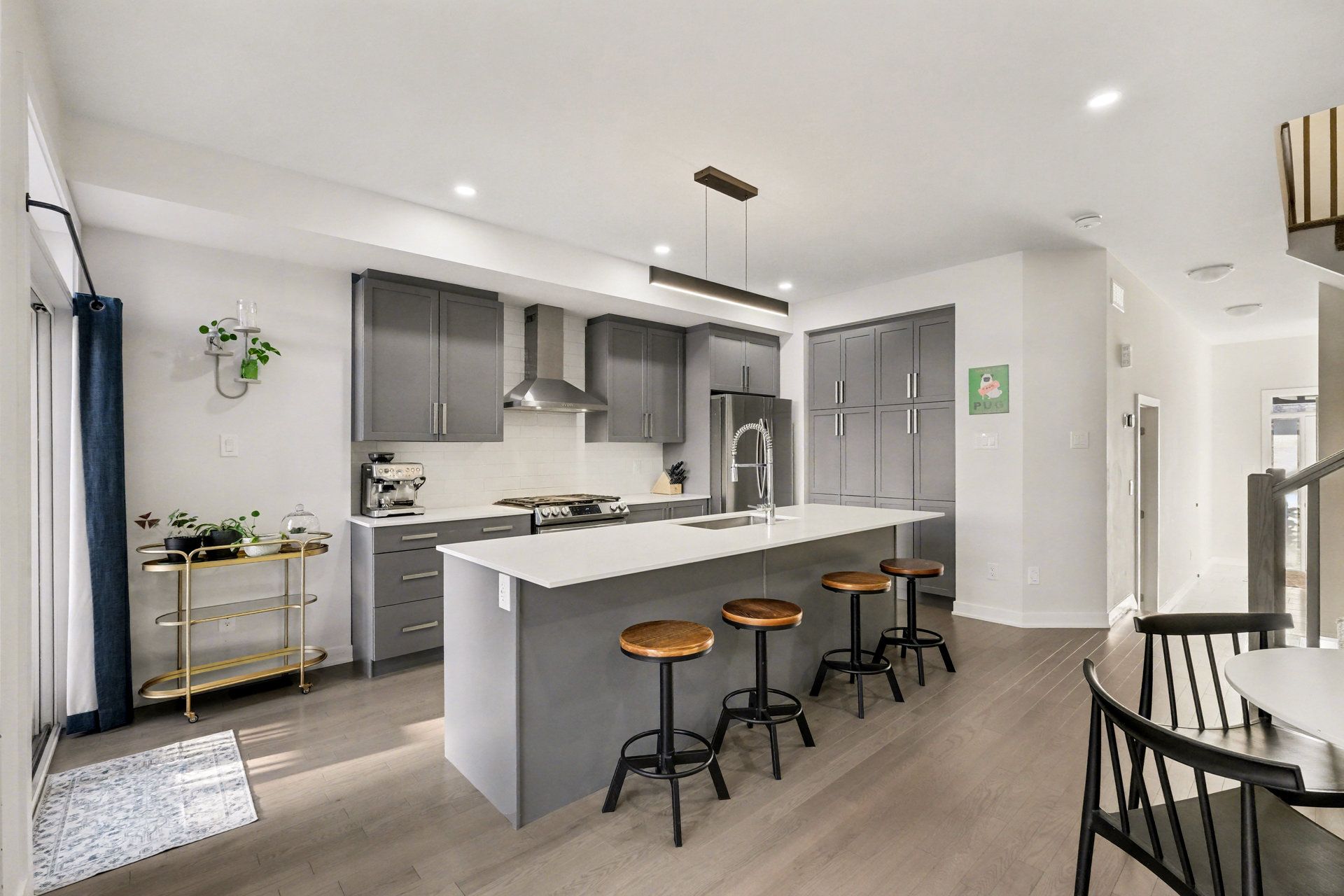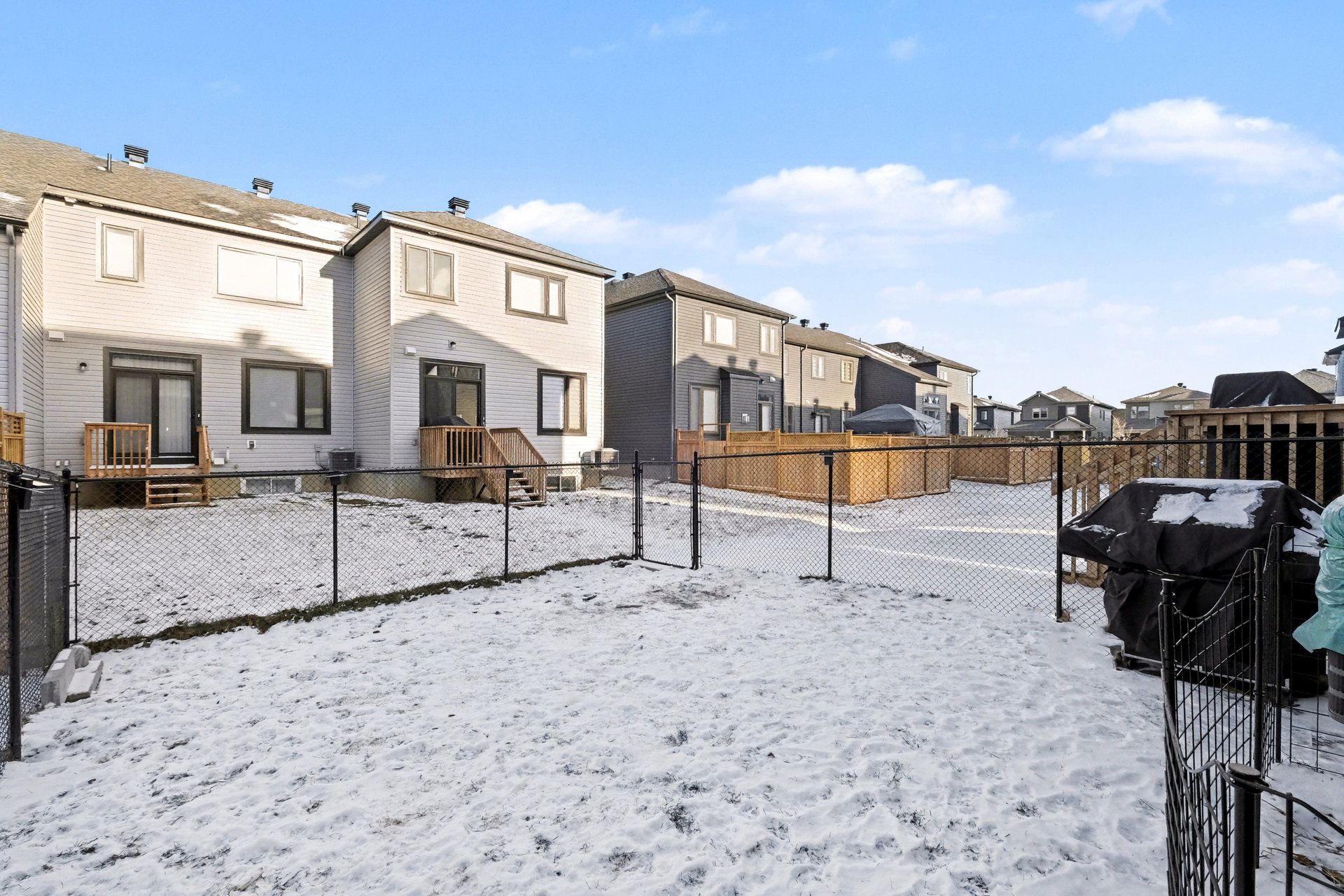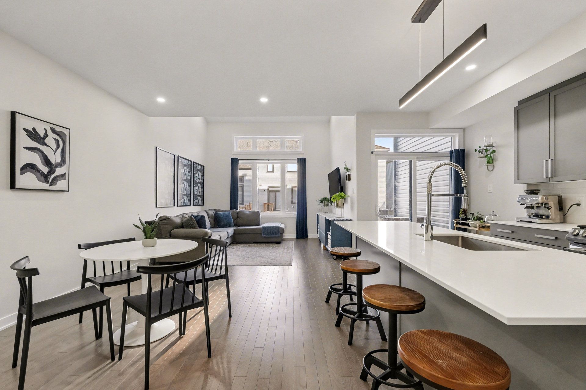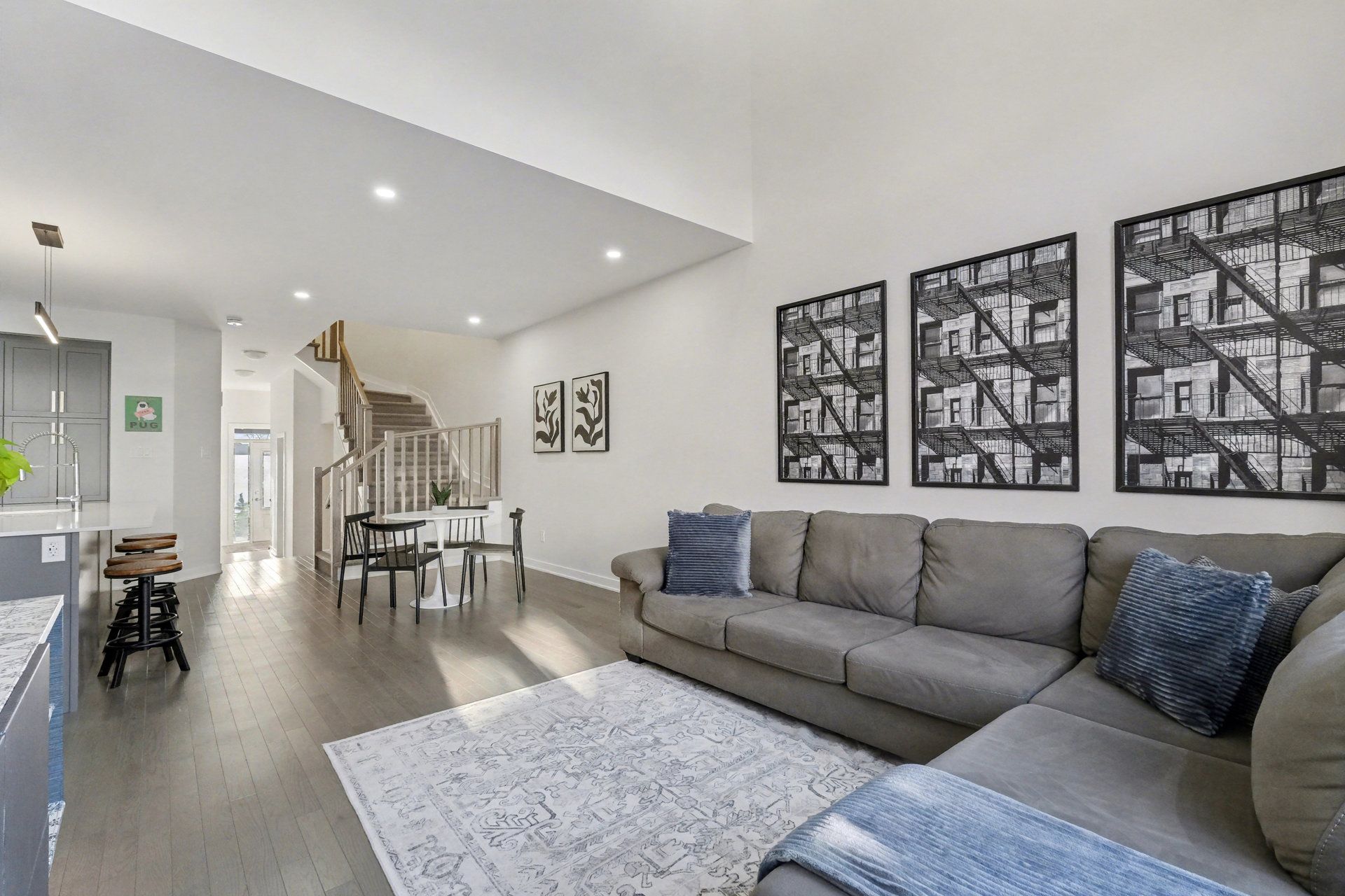 **open house sunday december 14th from 2:00pm-4:00pm** introducing this spectacular eq homes townhome in the sought-after equinelle golf course community! Discover this beautifully crafted & well maintained 3 bedroom, 4 bathroom townhome in highly desirable equinelle! From the spacious foyer, you will immediately notice the care and attention given to every detail. The main level features an open-concept layout with hardwood floors and a bright, airy living space accented by large windows and an extended ceiling height that enhances natural light throughout the day. The kitchen is complete with a generous island, stainless steel appliances, ample cabinetry, and a clean white tile backsplash, creating both a functional workspace and an inviting gathering area for guests! Upstairs, the primary bedroom provides a peaceful escape, offering a walk-in closet and a spa-like four piece ensuite with a standing glass shower and double vanity. Two additional bedrooms are nicely sized and share a modern four piece bathroom. A convenient linen closet adds practical storage. The fully finished lower level extends your living options, making it perfect for a recreation room, home office, gym, or media area, and it includes a two piece bathroom for added convenience. Located with quick access to highway 416, this home makes commuting simple while keeping you close to everyday essentials. Nearby you will find grocery stores, big-box retailers, cafés, restaurants, parks, recreation facilities, a hospital, and a range of schools, offering a well-rounded lifestyle with everything within reach. For those looking for even more, the optional resident club membership provides access to the clubhouse's exceptional amenities and a lively social atmosphere. This townhome combines modern finishes, a functional layout, and a welcoming setting, making it an excellent choice for anyone seeking a move-in ready space with exceptional comfort and appeal.