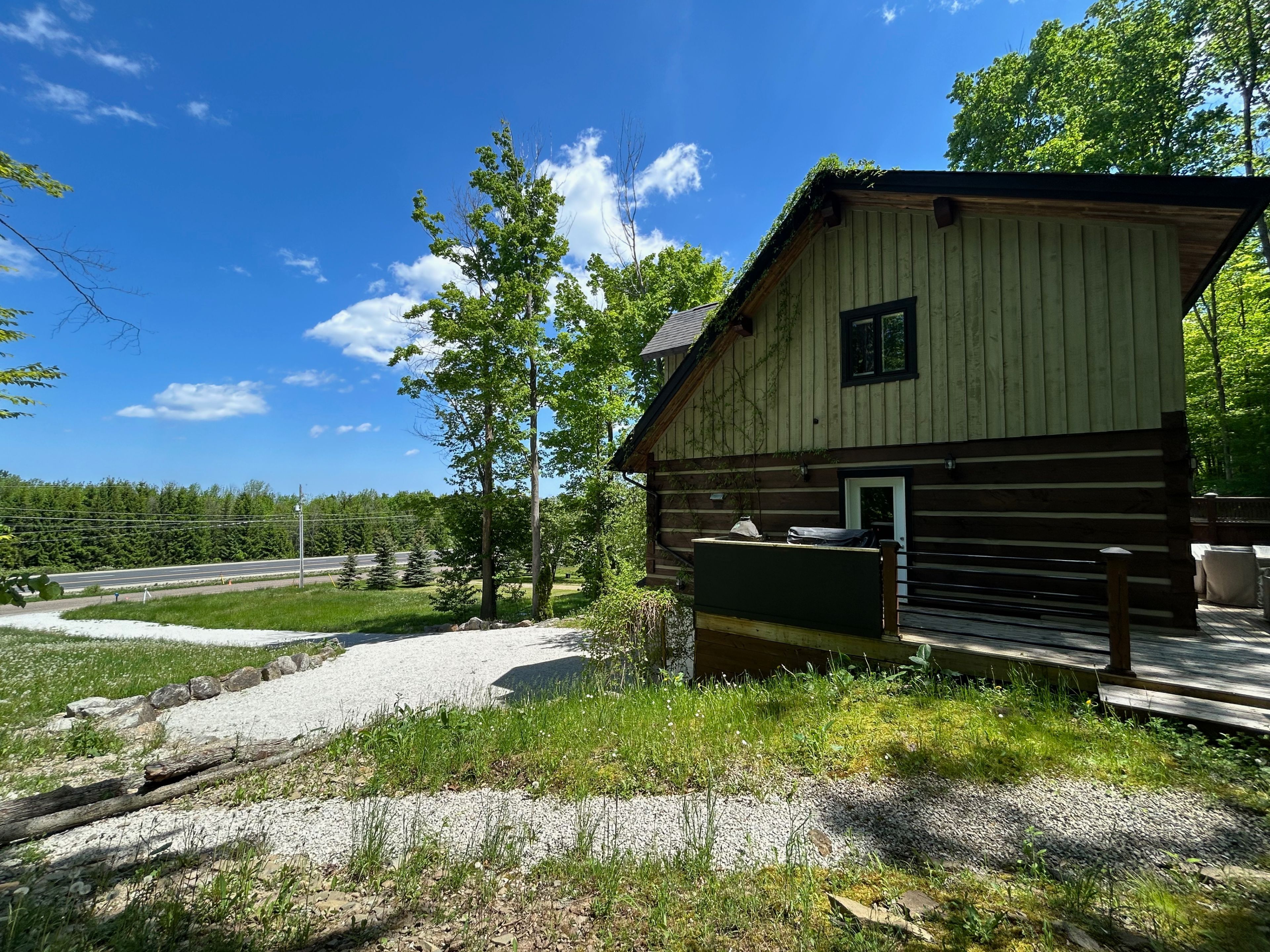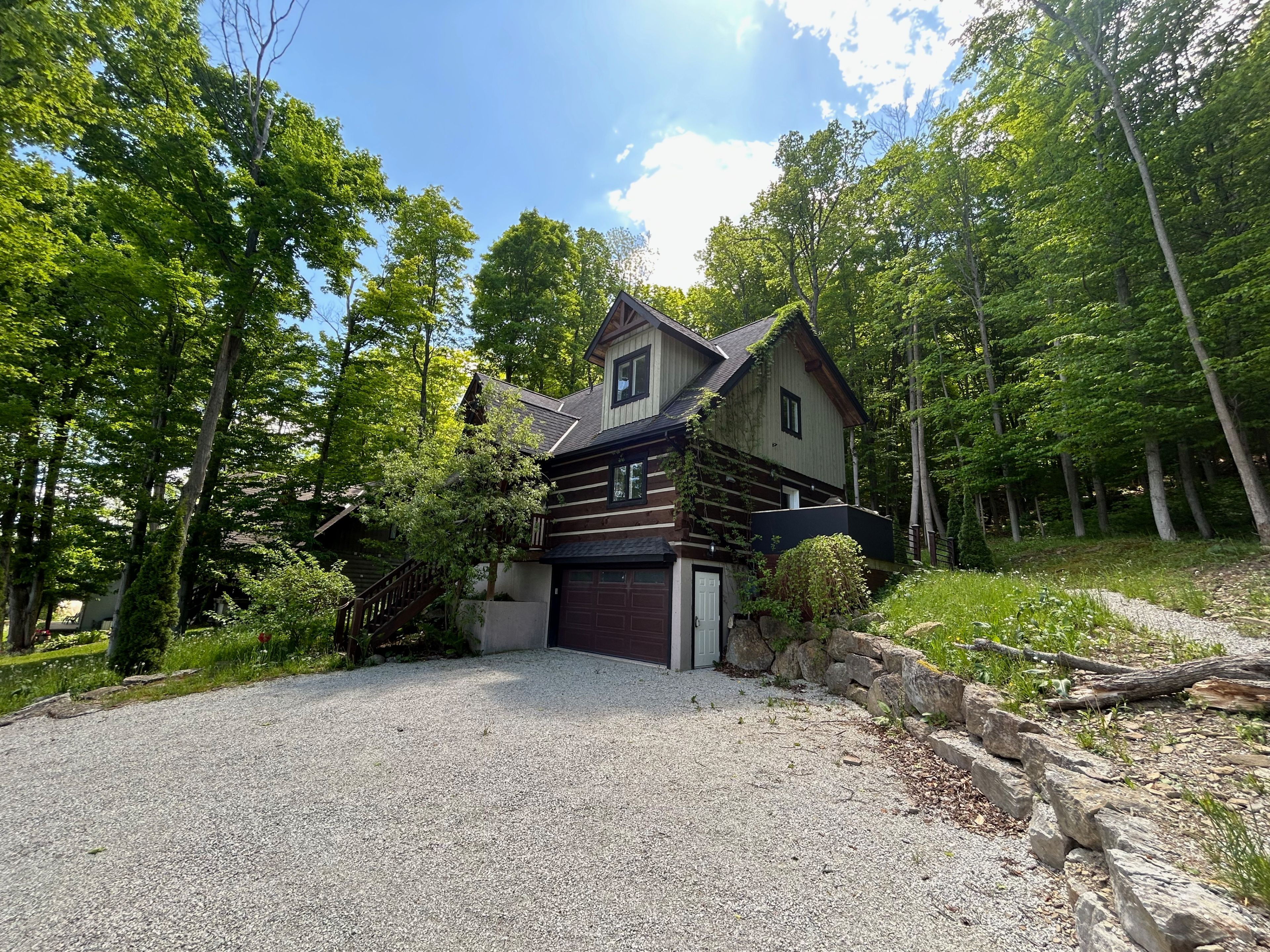 Log cabin - gorgeous 3 bedroom 3 bathroom chalet on a large deep lot with views of georgian bay. Located just west of thornbury and christie beach road this property features an open concept kitchen/living/dining stainless appliance, granite counters, wood burning floor to ceiling stone fireplace, hard wood floors, main floor primary with ensuite, two additional bedrooms with den on the upper level, a rec-room and full bath on the ground level. The main floor opens to a large private deck, hot tub and hard wood forest, there is also an attached oversized single car garage. Just minutes from the water and perched up high for views and privacy this is the perfect get away, close to christie beach, thornbury, meaford, restaurants, parks, golf, skiing, cycling, the georgian trail and all the areas amenities.