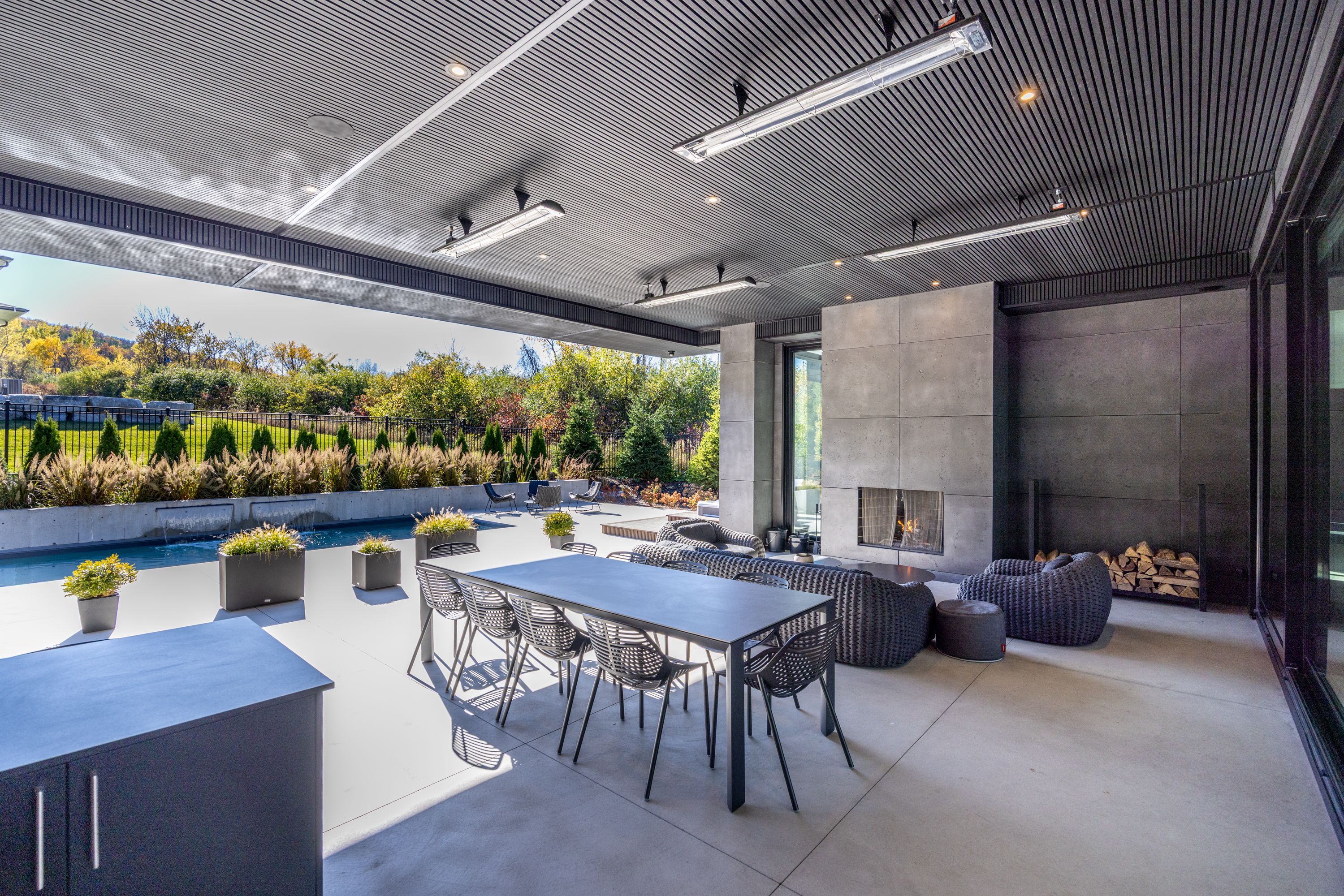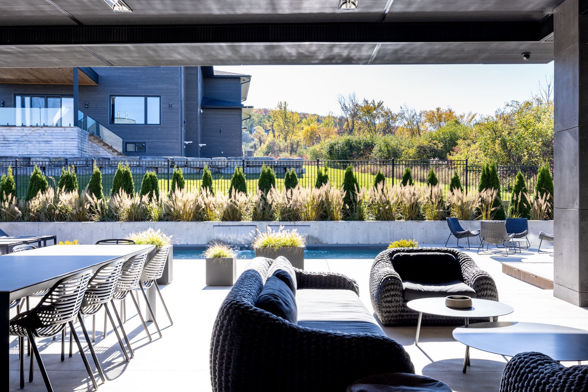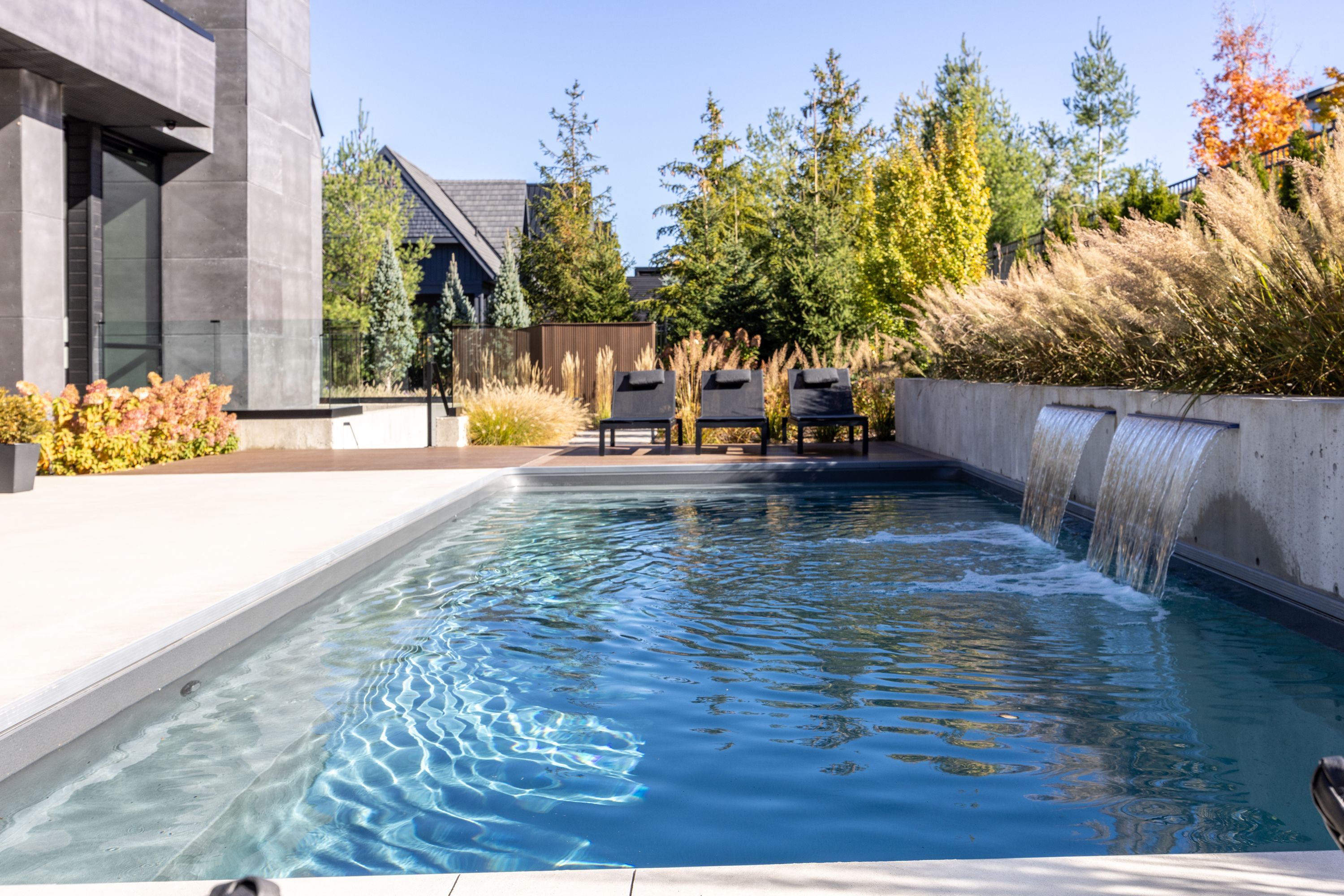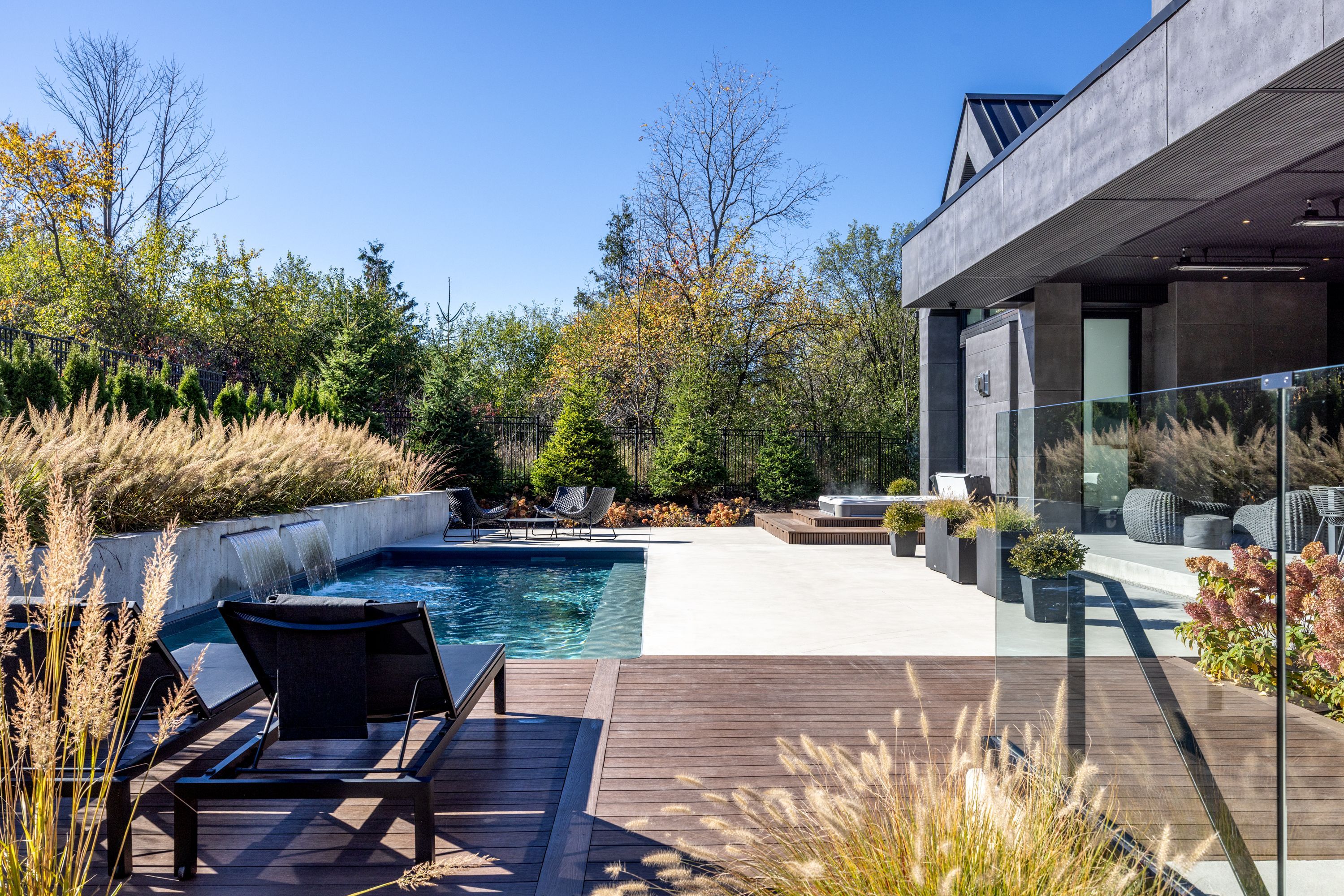 • Outdoor space includes a waterfall pool, hot tub, and covered lounge.