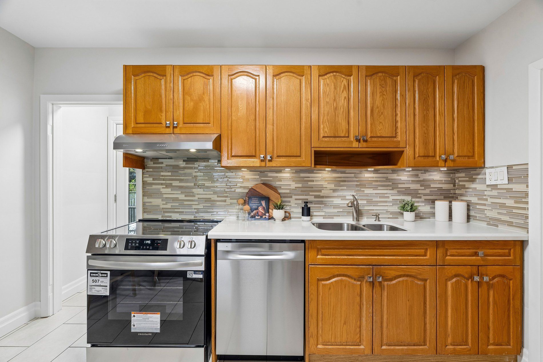 • Modern kitchen with newly installed stainless steel appliances and quartz countertops.