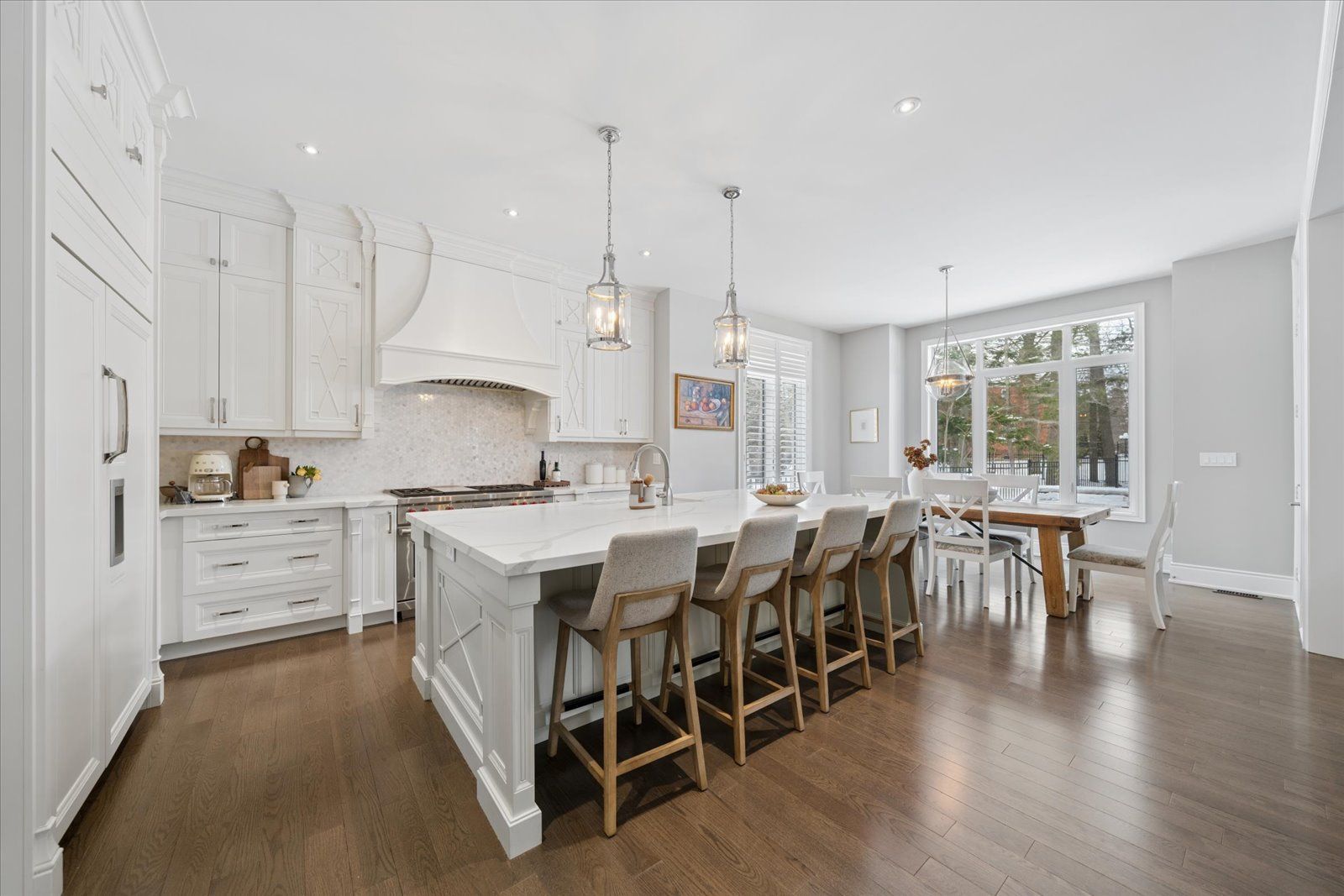 Coveted woodview drive cul-de-sac, 5-bedroom, 6-bathroom built in 2018, 4,700 sq. A . 45-acre lot, circular driveway +3-car garage. Gourmet kitchen with centre island, walk-in pantry, quartz. Wolf 6 burner range, dual ovens, sub-zero fridge/freezer. Great room with coffered ceiling and gas fireplace, creating a warm and inviting atmosphere for gatherings. An elegant formal dining room, currently showcasing a grand piano and club seating, features a sophisticated coffered ceiling. A main floor office with built-in cabinetry provides a dedicated and organized workspace and is bathed in natural light. Versatility is key with a convenient main floor bedroom and ensuite, offering a separate entrance ideal for guests or multi-generational living. Thoughtful design extends to two spacious mudrooms with ample storage, seating, walk-in closets, and direct garage access. Upstairs, the primary retreat is a sanctuary of luxury. The opulent ensuite bathroom features a large edgeless glass shower, a freestanding soaker tub, double vanity, and a separate water closet. Expansive walk-in closet with cabinetry, an island, and a window. The upper level also hosts three additional spacious bedrooms, each with an ensuite bathroom and large closets, plus a well-appointed laundry room. Two staircases lead to the expansive lower level, offering immense potential with rough-ins for two full bathrooms and a powder room. Experience seamless indoor-outdoor living with a large covered porch featuring a wood ceiling, pot lights, chandeliers, a stone patio with a gas fireplace - perfect for lounging and dining. The beautifully landscaped, fully fenced yard provides a private sanctuary with a side entrance, dog run, garden shed and convenient outdoor hot/cold water hook-ups and irrigation system. Engineered for efficiency with 2 furnaces/ air conditioners and hrv. Enjoy services & amenities only minutes away. Hwy 401, 407 & go train. Rouge valley park short walk away.