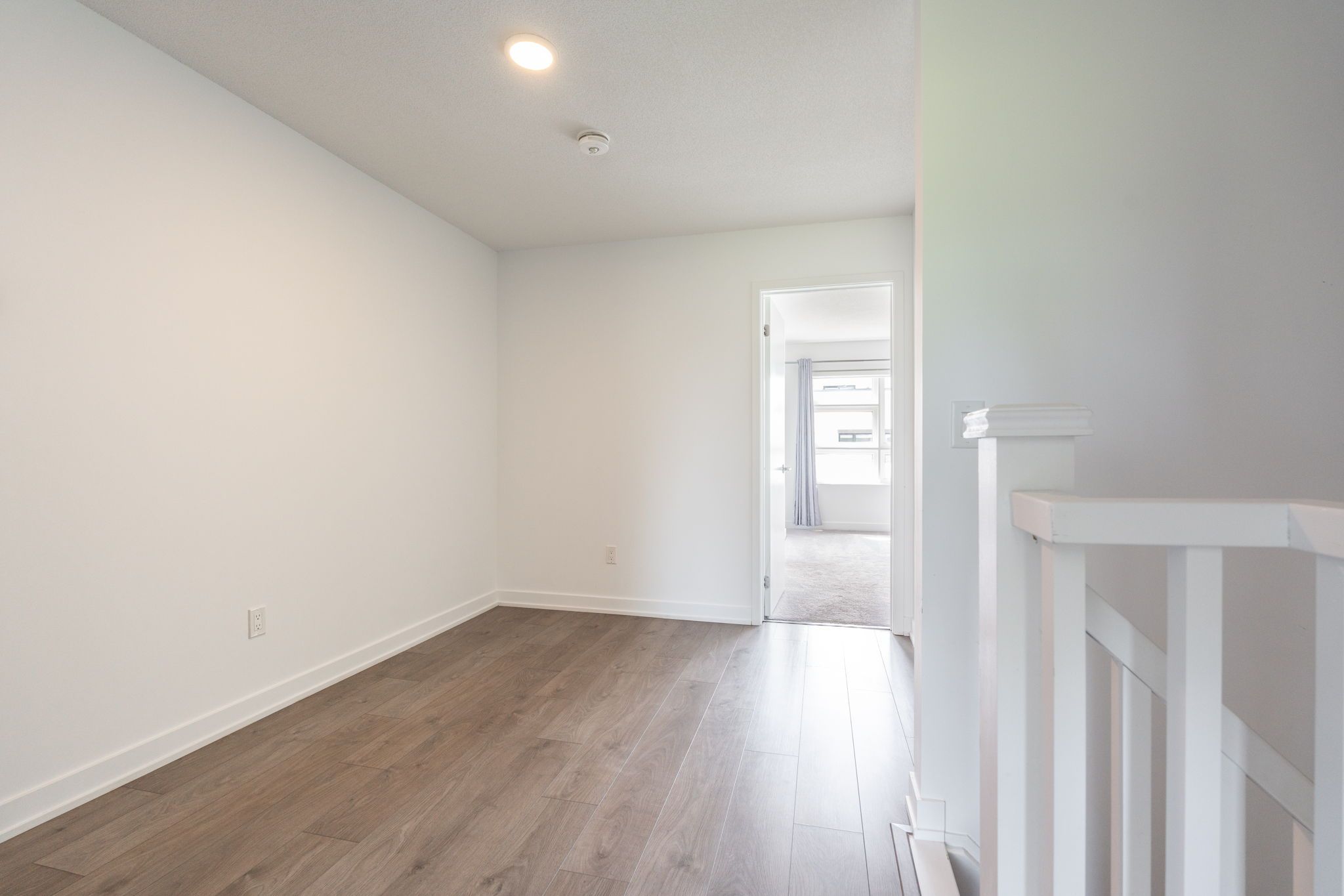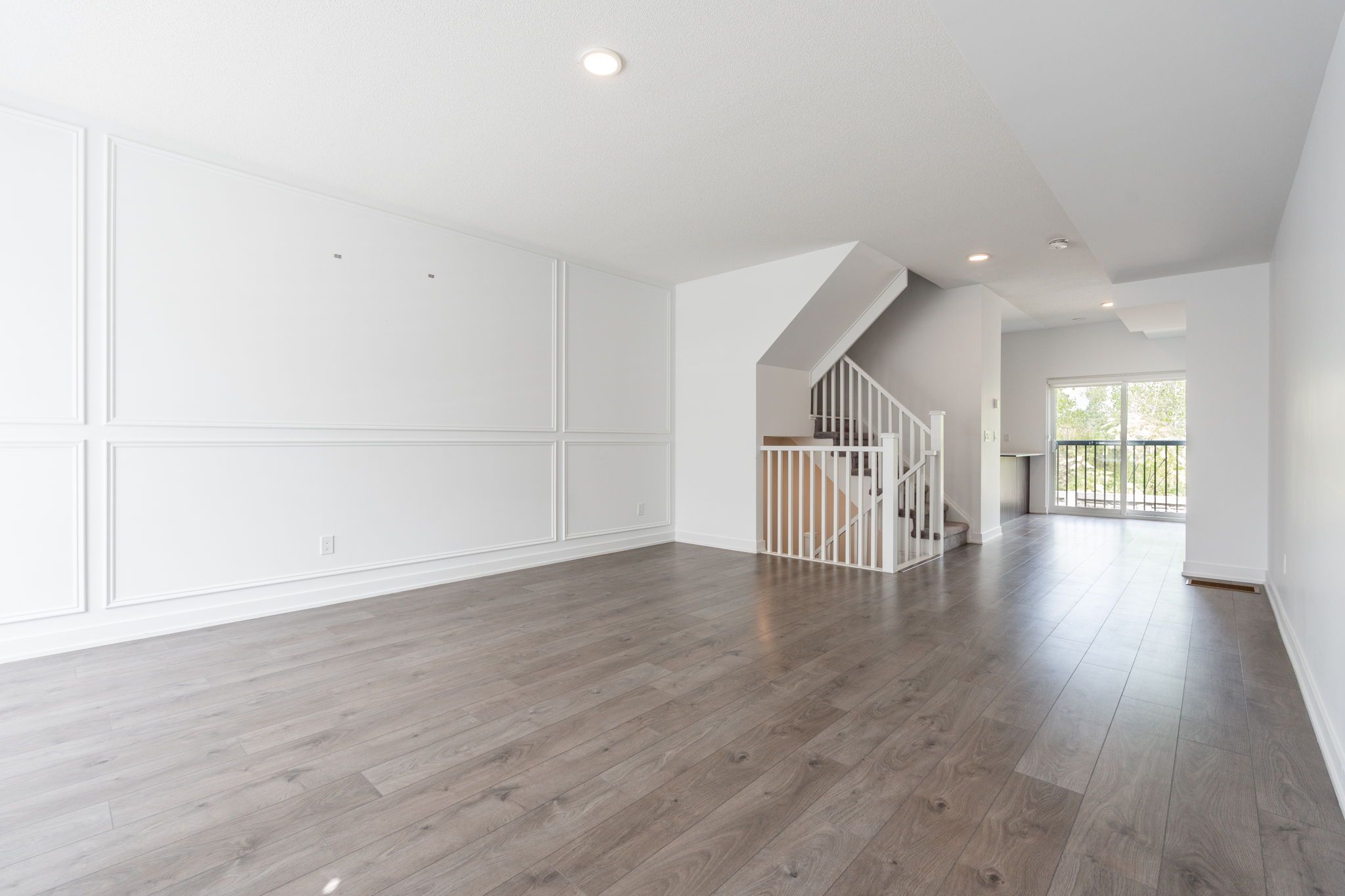 • Natural light-filled living room with elegant wainscoting and balcony.